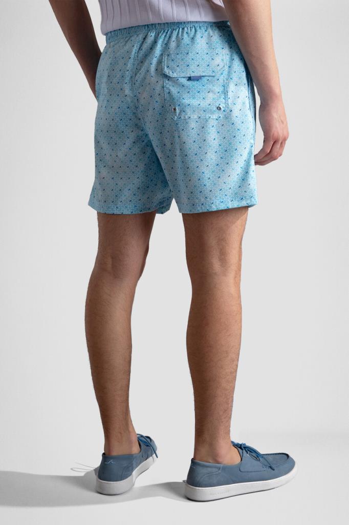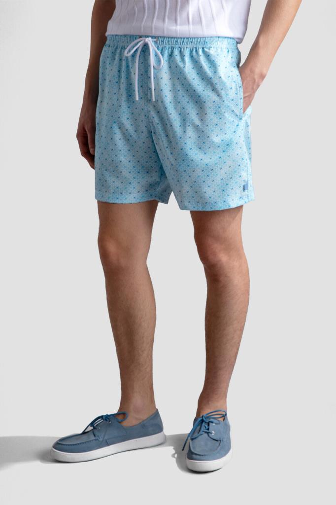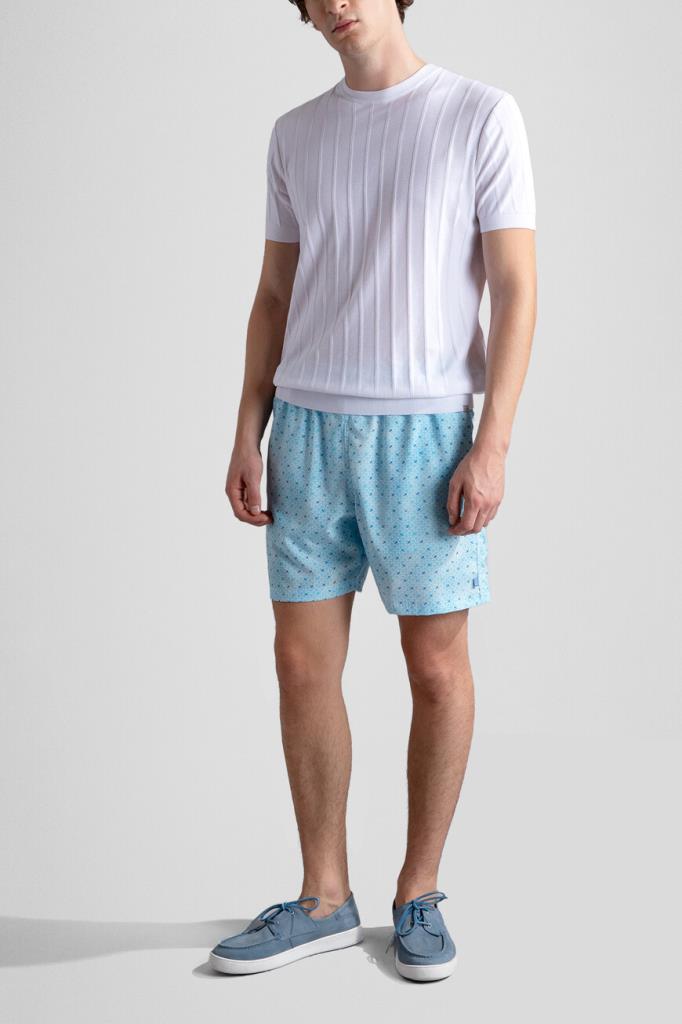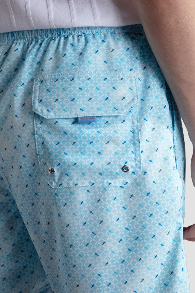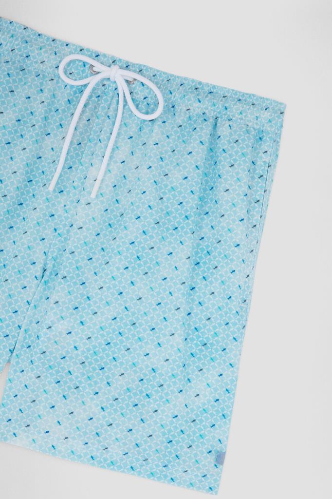 Быстросохнущие плавки-шорты свободного силуэта от бренда Paul&Shark. Модель изготовлена из лёгкого эластичного полиэфира голубого оттенка с повторяющимся геометрическим мотивом ромбами, выполненным из разноцветных силуэтов культовых акул. Создайте гармоничный комплект с белой футболкой-джемпером из чистого хлопкового джерси того же бренда.