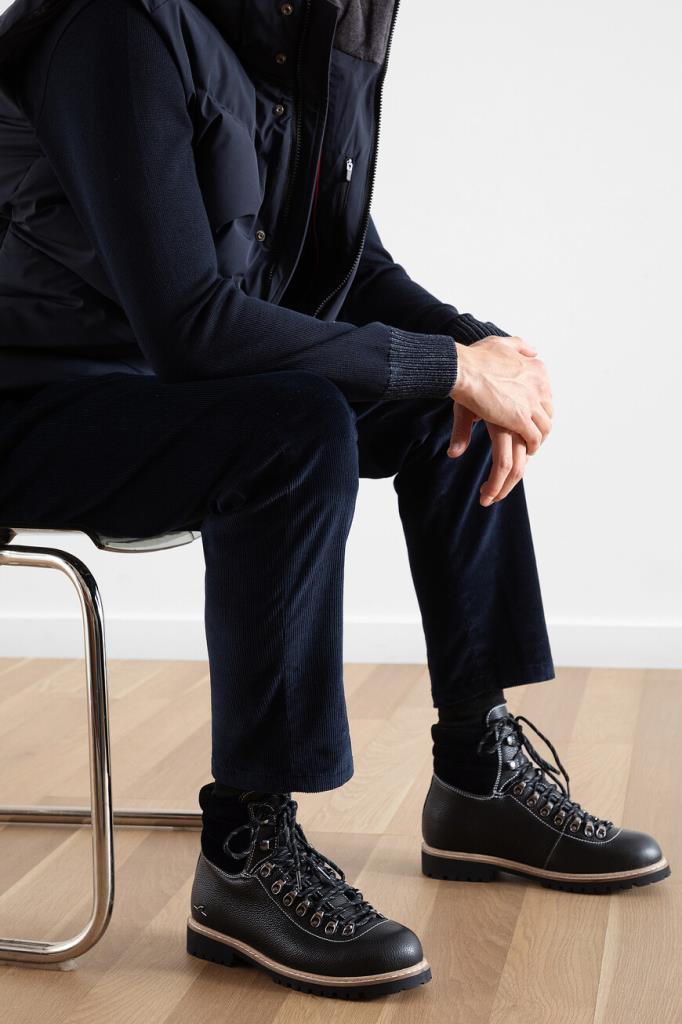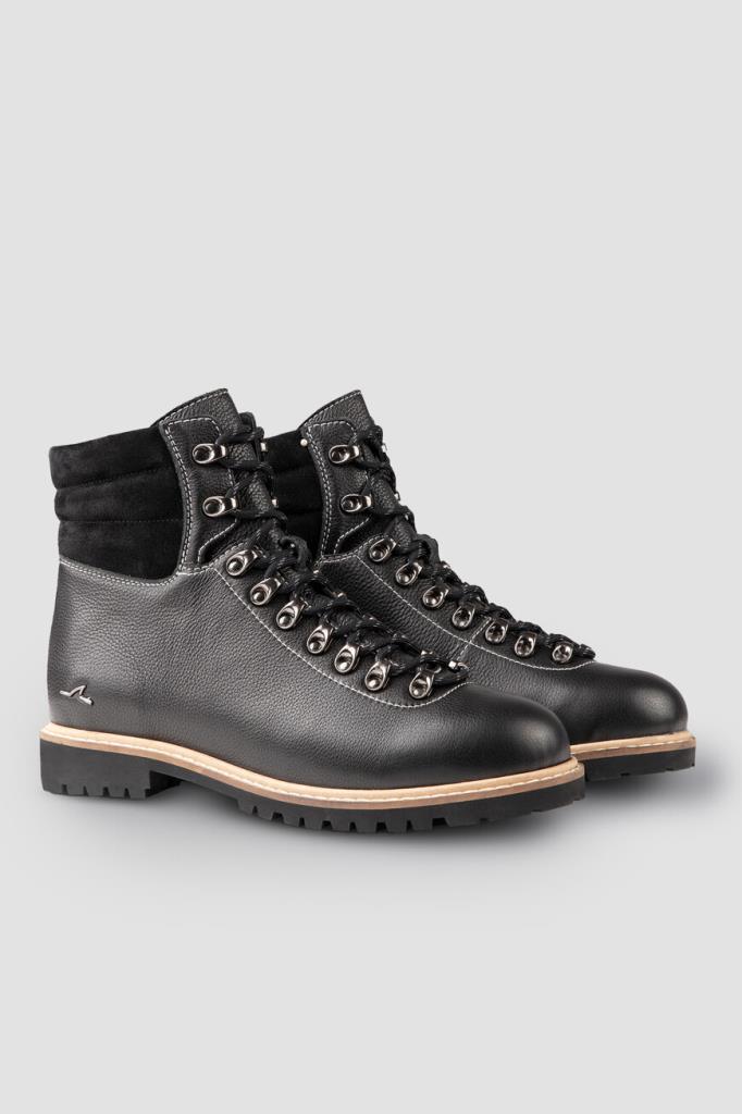 Кожаные ботинки с широкой колодкой от бренда Paul&Shark. Изделие выполнено в чёрном цвете и оснащено закрытой шнуровкой с люверсами из серебристого металла. Задник декорирован стёганой замшевой вставкой в тон, а боковины украшены культовой серебристой символикой Дома - силуэтом острого плавника акулы в задней части.