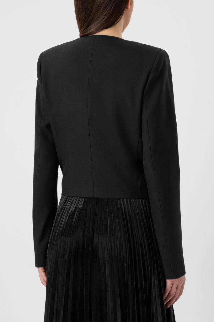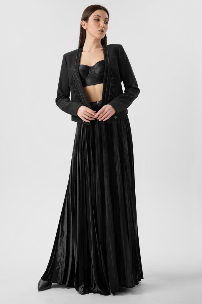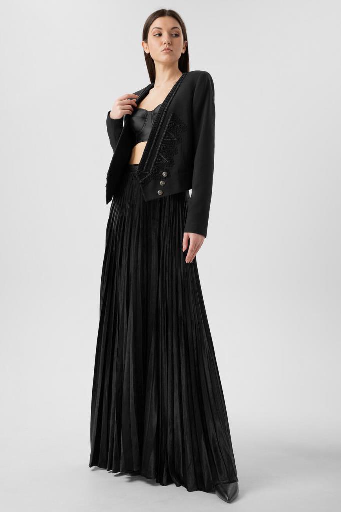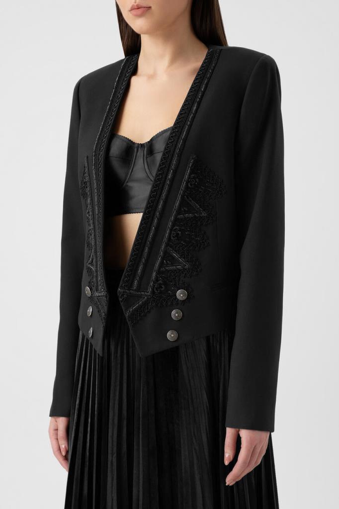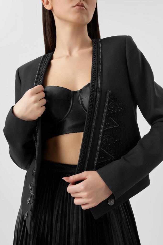 Черный жакет Saint Laurent изготовлен из деликатной вирджинской шерсти. Укороченная приталенная модель выполнена в стиле болеро. Глубокий V-образный вырез и борта украшены тесьмой в стиле офицерских галунов. В качестве декора использованы два ряда металлических пуговиц в оттенке состаренного серебра. Составьте интересный вечерний образ с черным платьем из прозрачного шелкового крепдешина, вышитого пайетками.