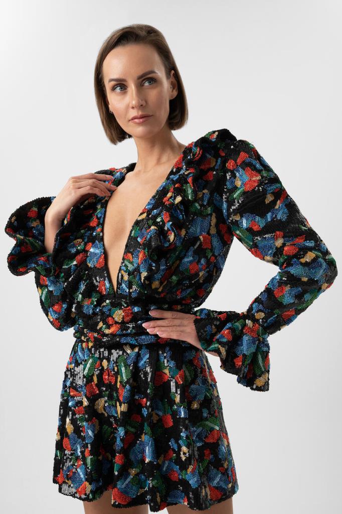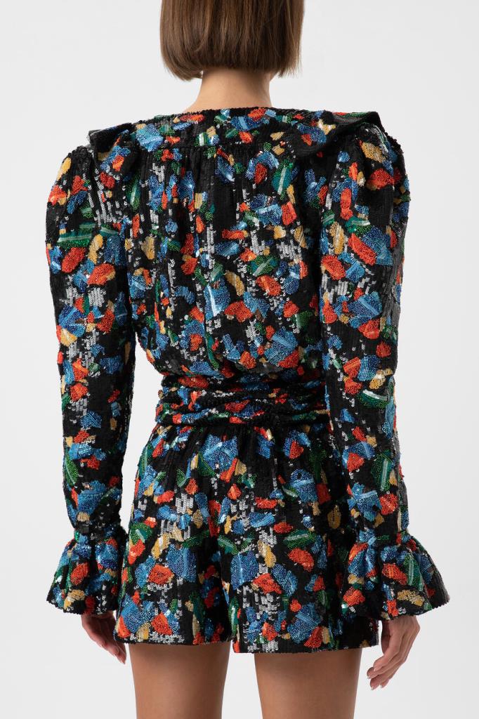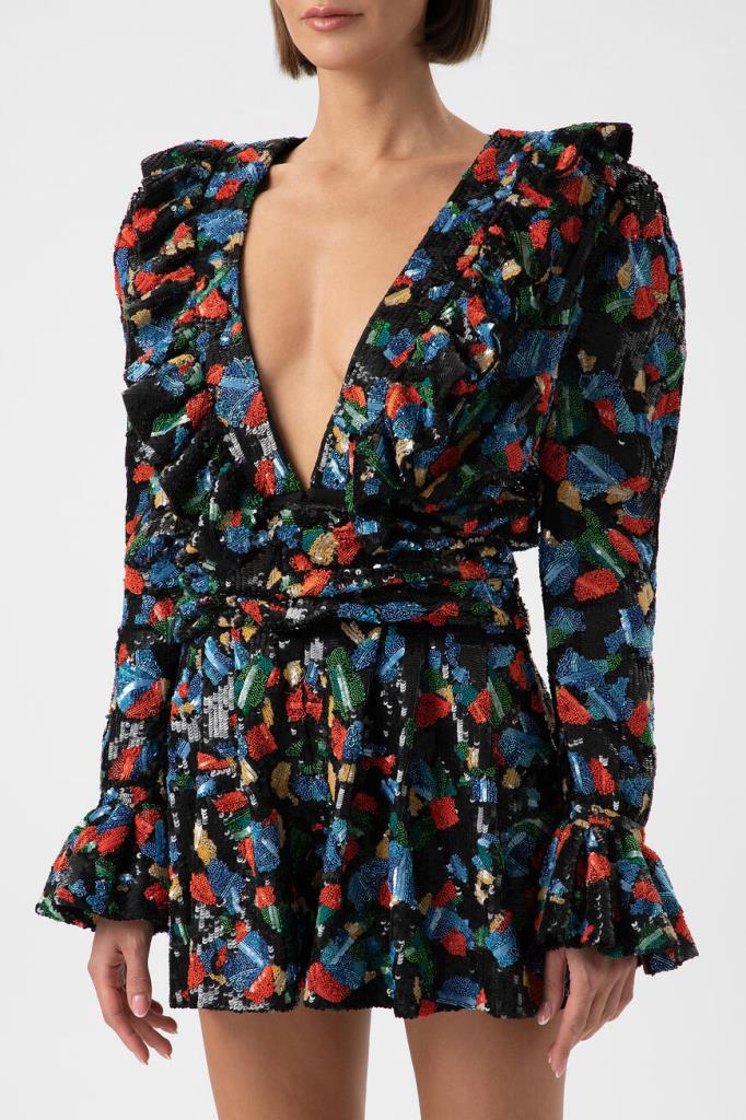 Комбинезон Saint Laurent с насыщенным абстрактным принтом расшит пайетками. Модель выполнена из трикотажа на основе вискозы и ацетата. Сложный крой с глубоким вырезом в сочетании с длинными рукавами и расклешенными шортами позволит создать экстравагантный вечерний образ, который точно оценят ценители искусства.