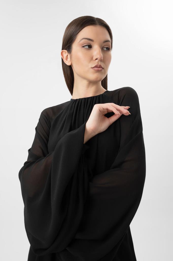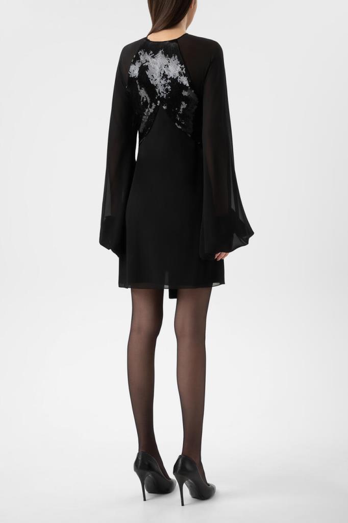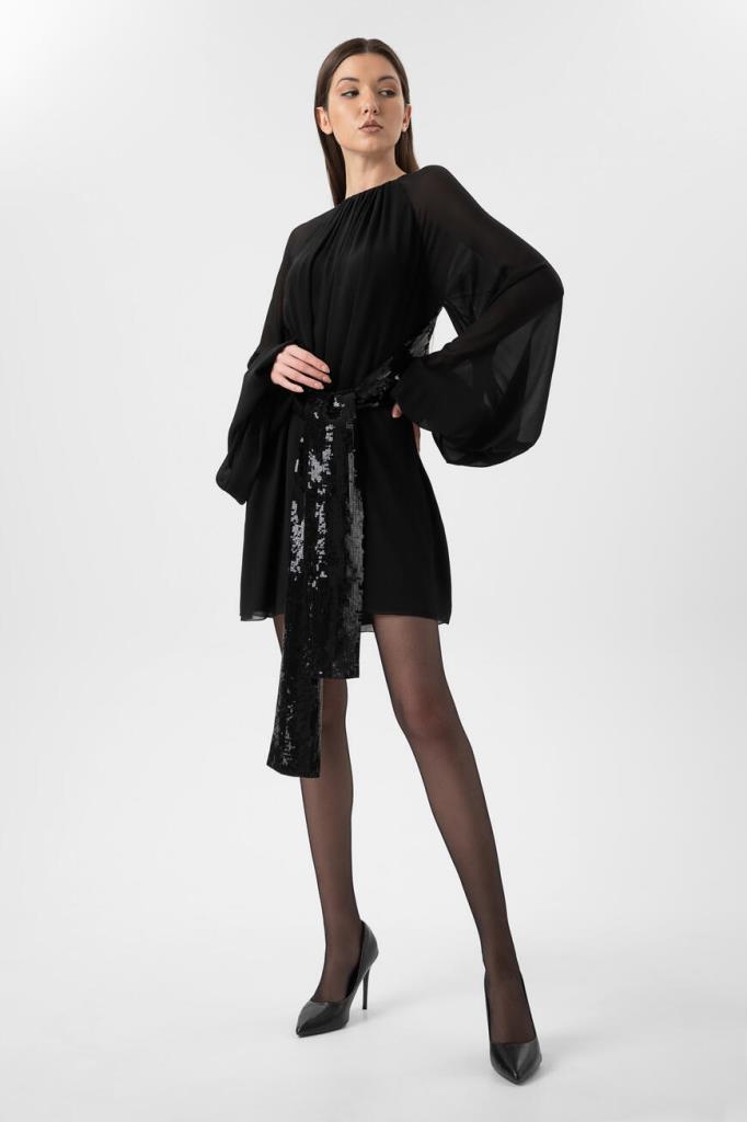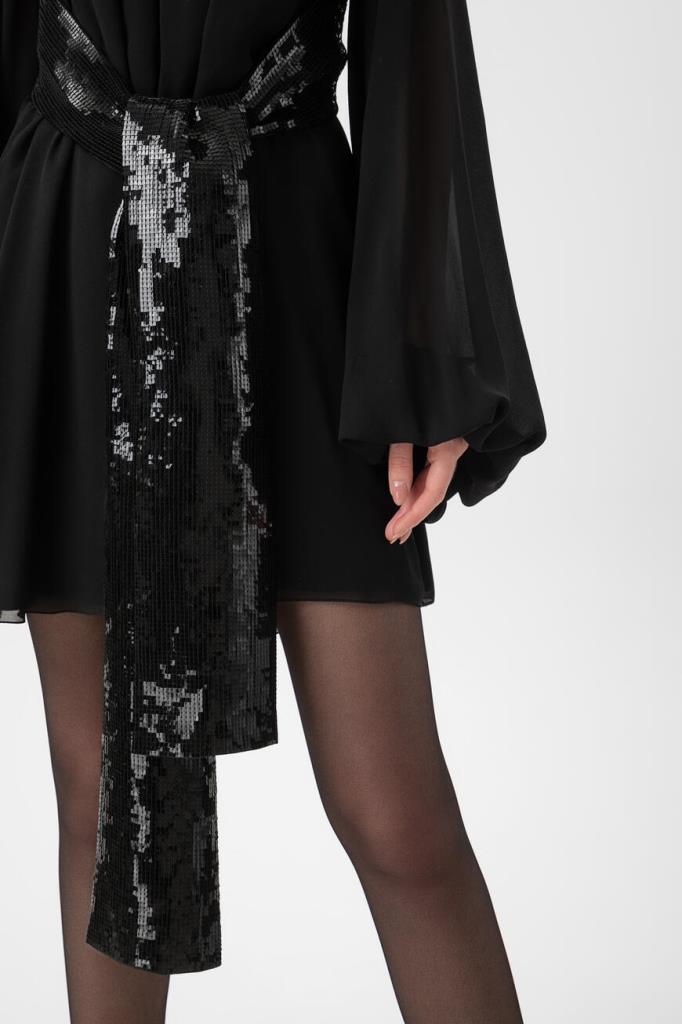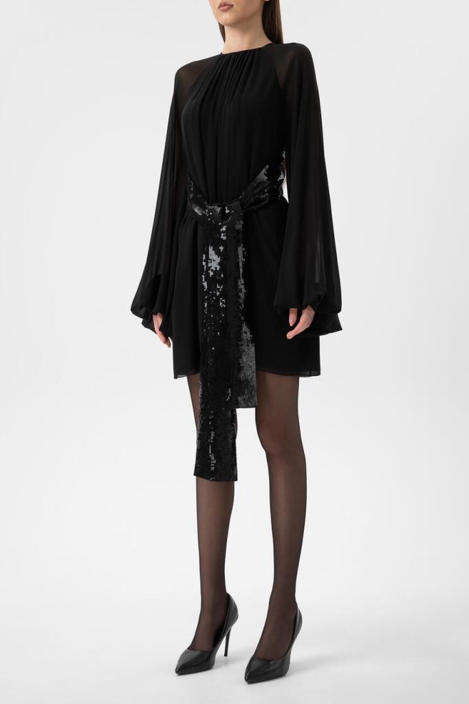 Платье Saint Laurent выполнено из чистого шелка черного цвета. Модель длины мини интересна широкими епископскими рукавами и дизайнерским поясом, вышитым пайетками. Тонкий шелк, собранный в складки на горловине, свободно струится по фигуре. Маленькое черное платье станет отличным выбором для праздничного мероприятия. Дополните образ лодочками и сумкой модели Kate от Saint Laurent.