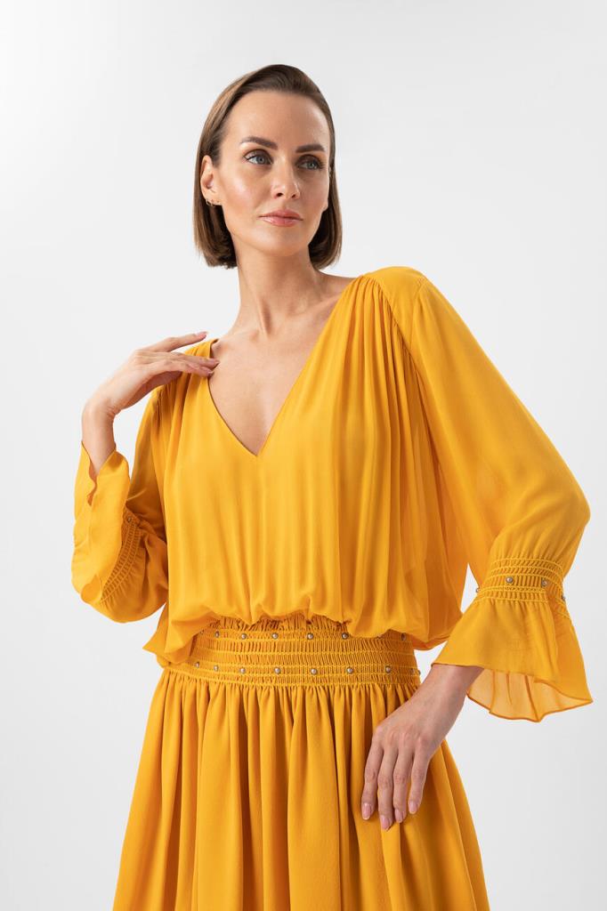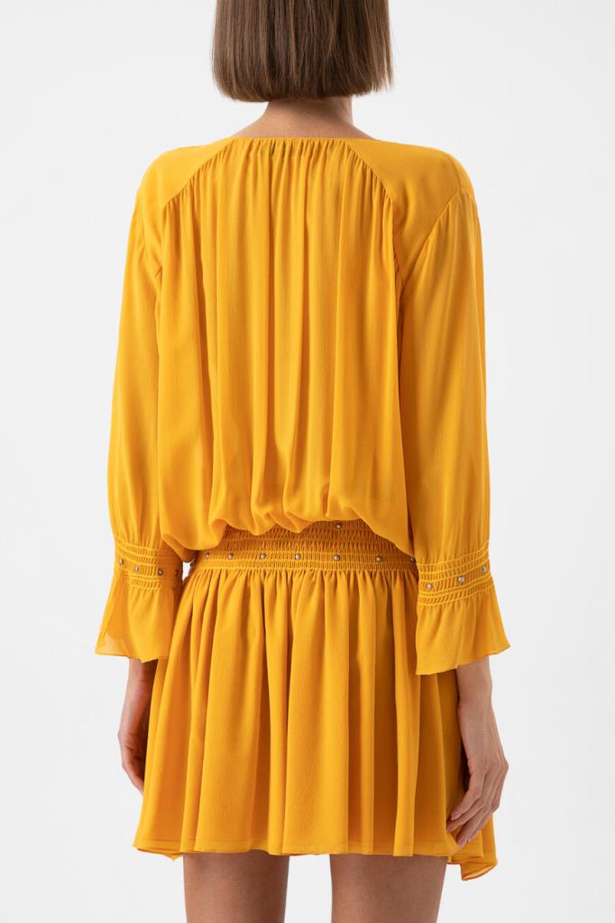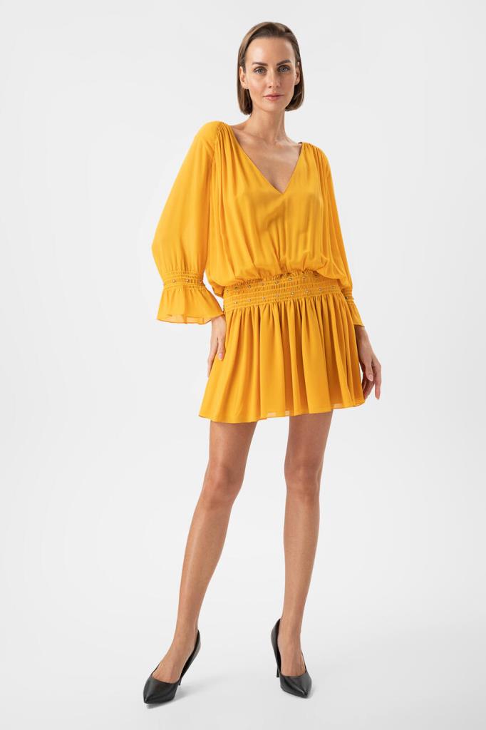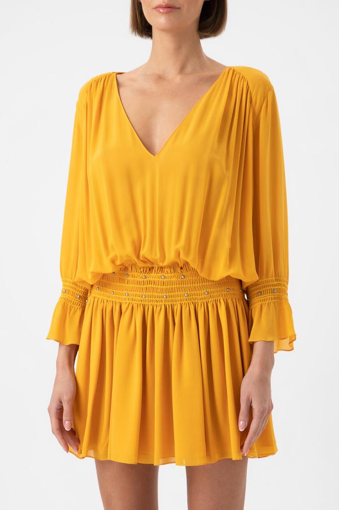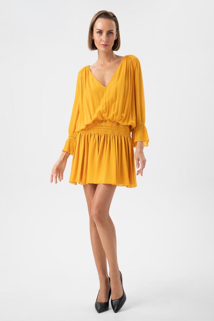 Желтое платье Saint Laurent выполнено из чистого шелка. Платье со множеством драпировок, складок и глубоким V-образным декольте напоминает древнегреческую тогу. Модель длины мини позволяет соблюсти баланс открытого тела благодаря длинным рукавам с воланами. Изделие станет основой интересного вечернего образа.