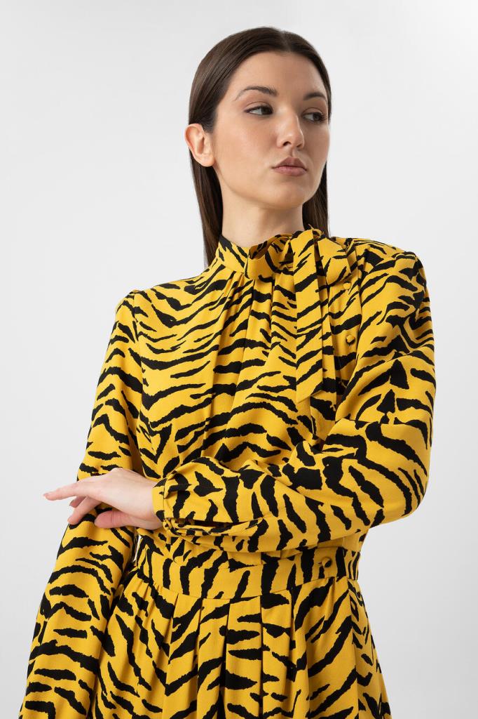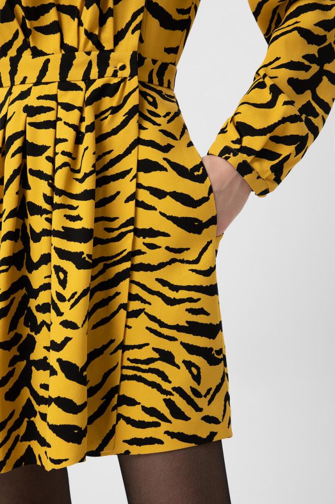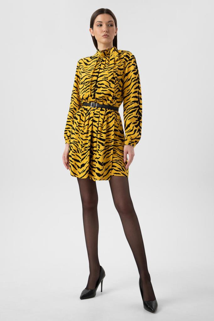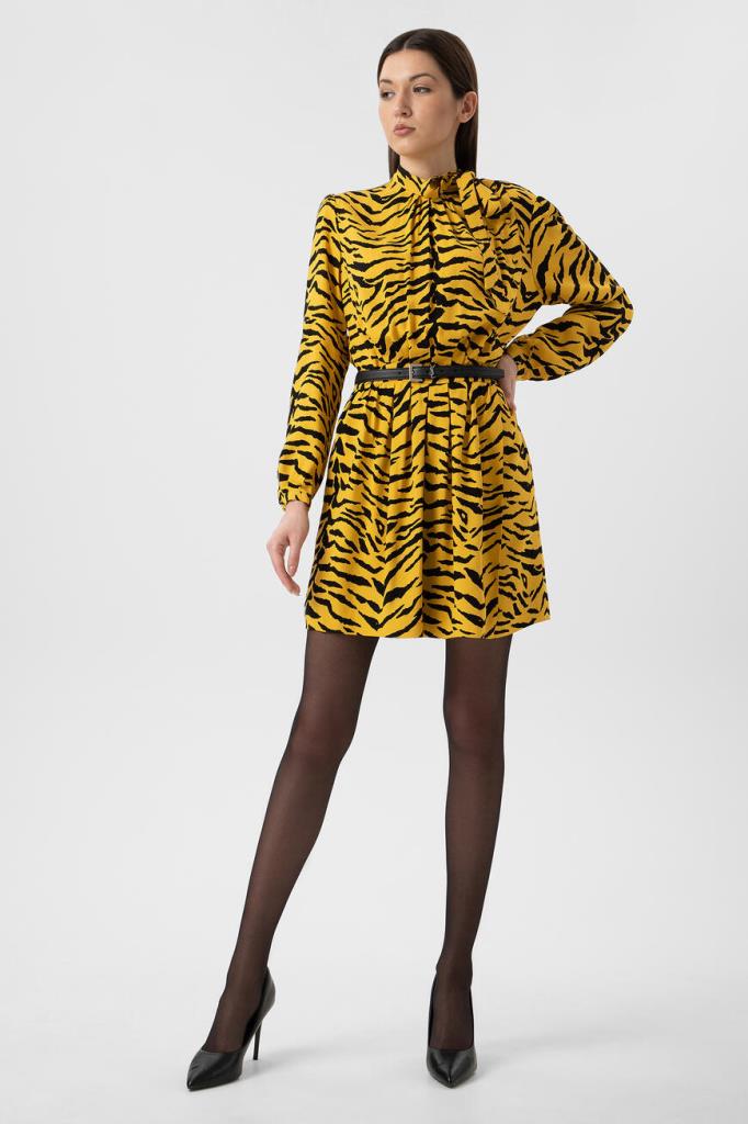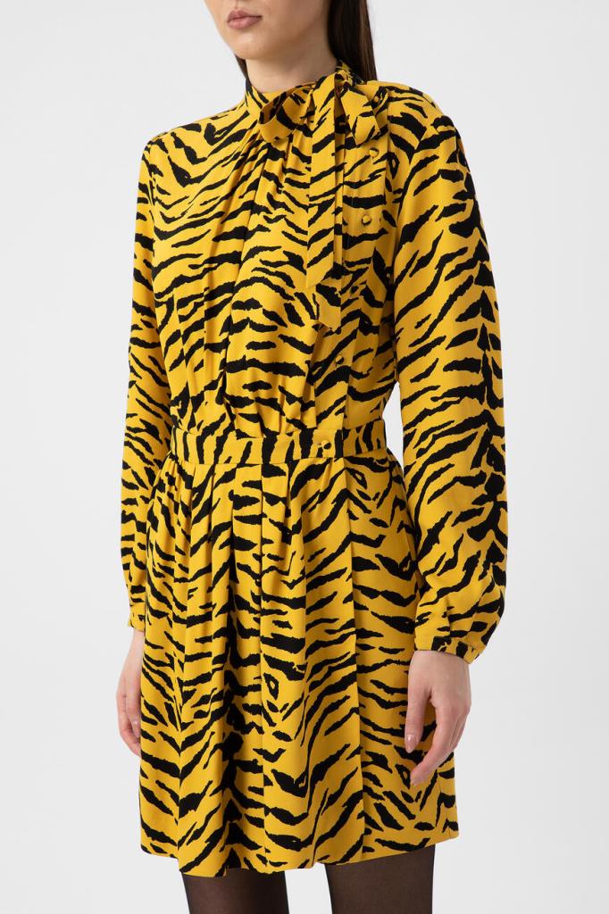 Короткое желтое платье Saint Laurent с анималистичным узором «зебра». Модель выполнена из вискозного крепа. Платье привлекает внимание не только ярким принтом, но и необычным дизайнерским кроем. Асимметричная застежка на пуговицы, воротник аскот и кокетка со сборкой на спинке позволят составить женственный образ. Дополните лук черным ремнем, лодочками и сумкой модели Sunset от Saint Laurent.