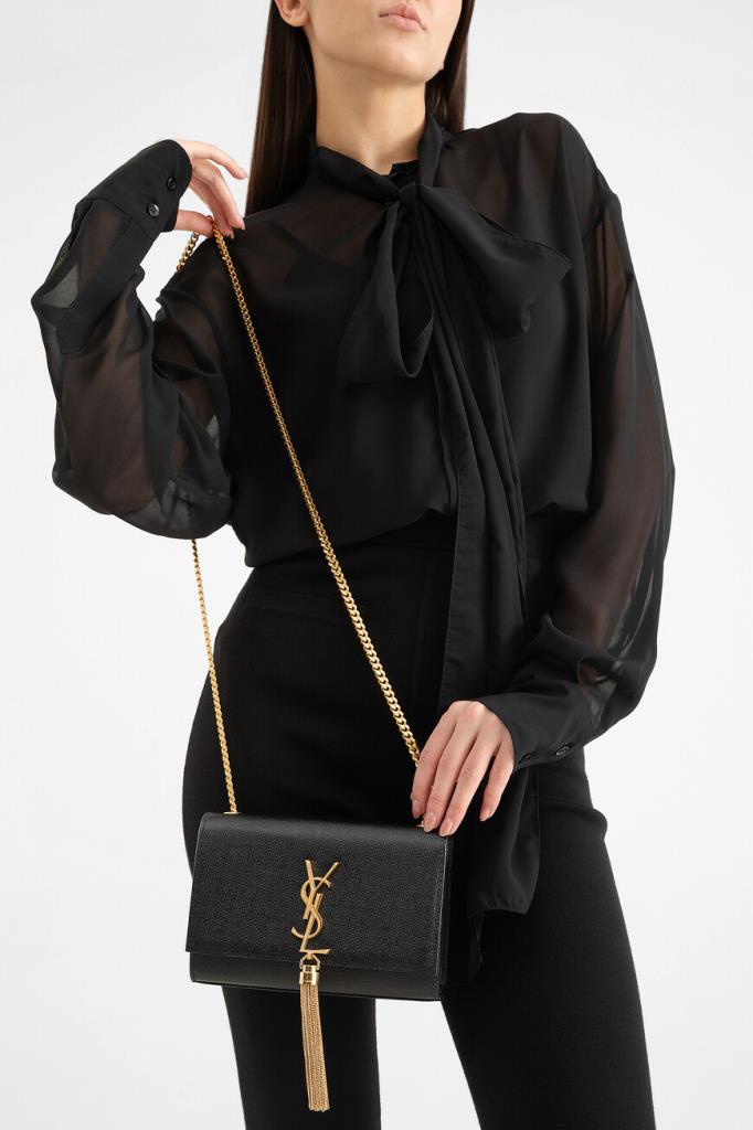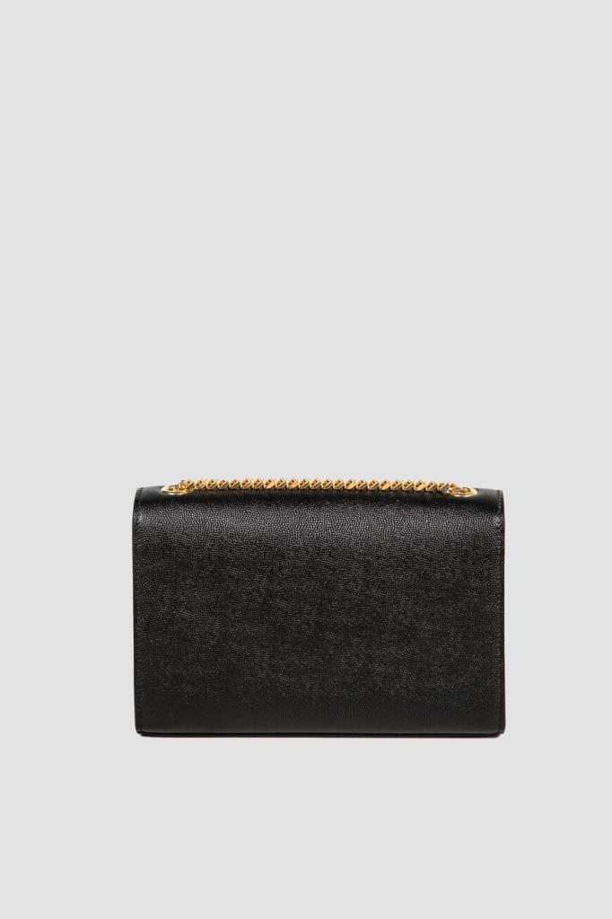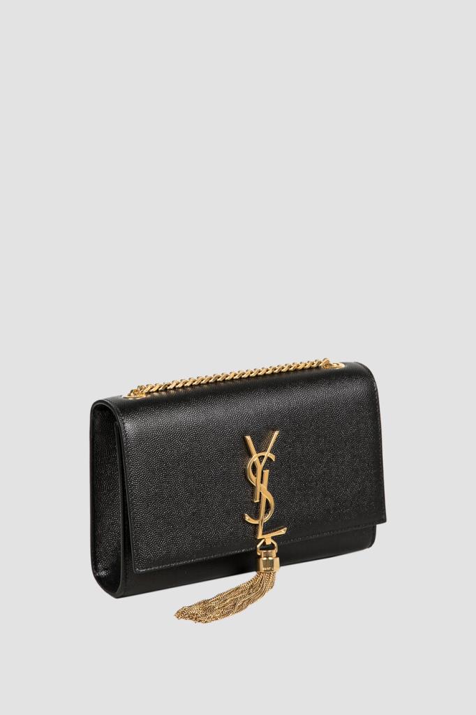 Cумка Saint Laurent Kate из чёрной кожи с тиснением GRAIN DE POUDRE. Изделие среднего формата дополнено скользящей плечевой цепочкой золотого оттенка для переноски и оснащено объёмным внутренним отделением с клапаном на потайной магнитной застёжке. Декором выступают крупная монограмма бренда и кисточка из цепочек спереди.