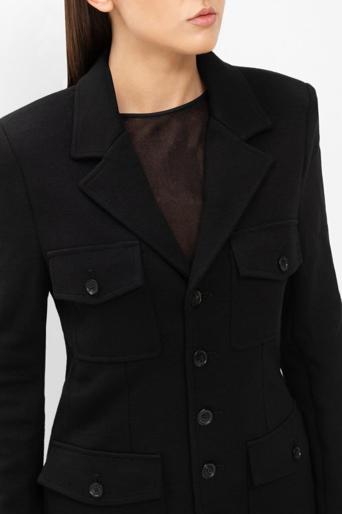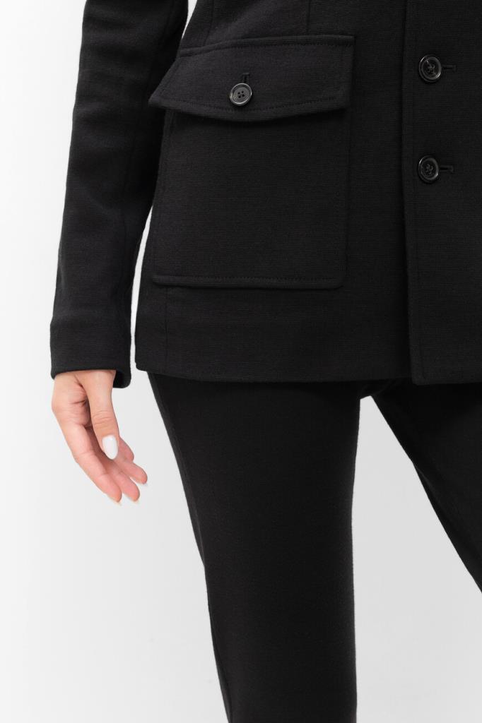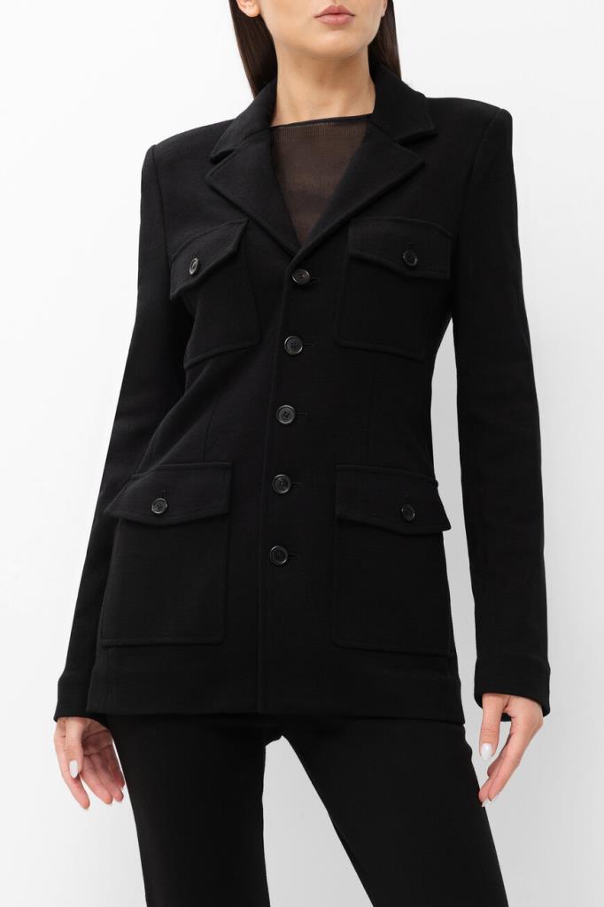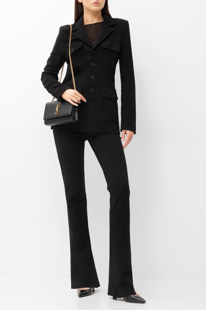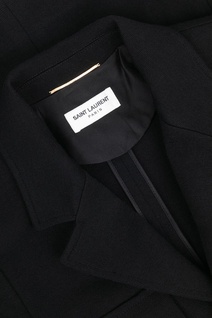 Чёрная куртка Saharienne от бренда Saint Laurent. Модель изготовлена из мягкого джерси на основе натуральной шерсти и прочного нейлона. Изделие застёгивается на роговые пуговицы и отличается четырьмя крупными накладными карманами с клапанами: двумя нагрудными и двумя основными по бокам. Особенностями жакета стали однобортный фасон и частичная шелковая подкладка.