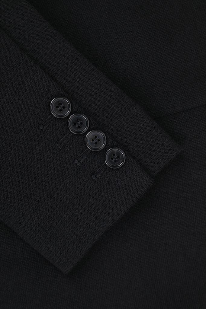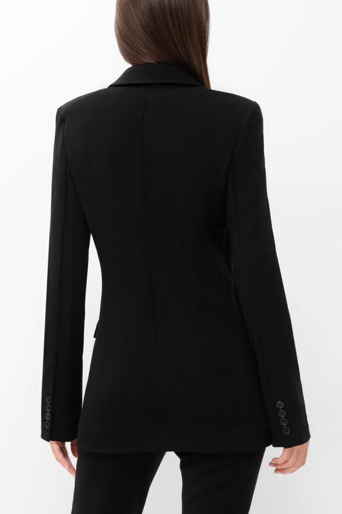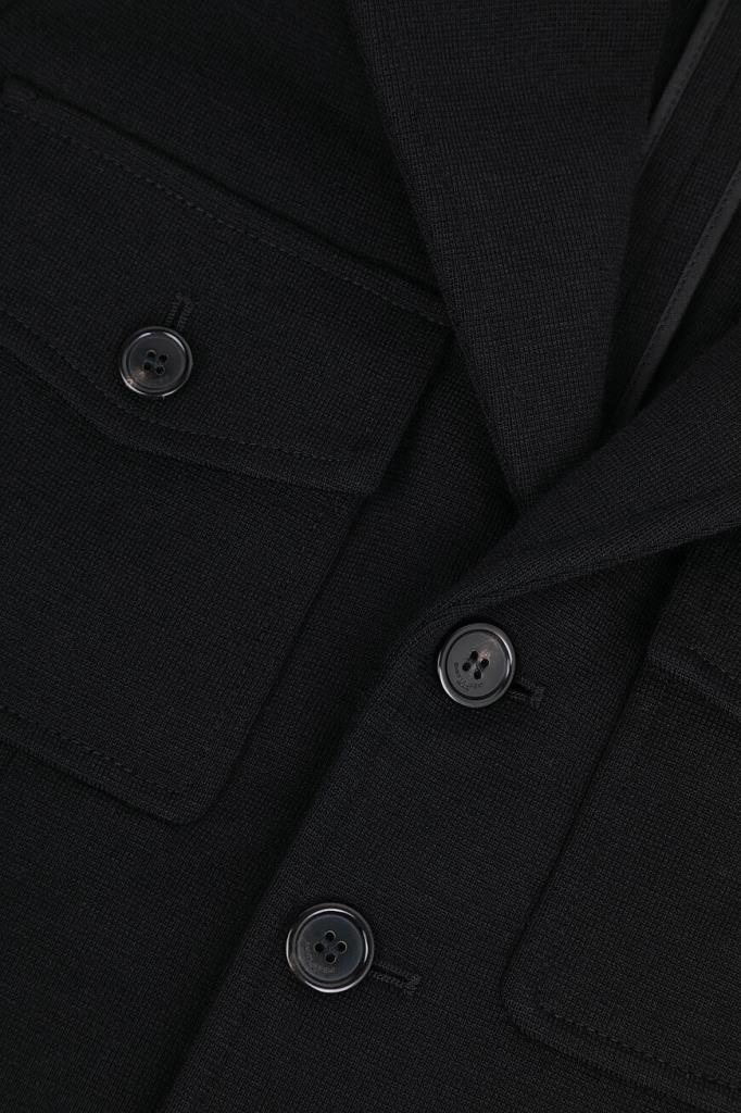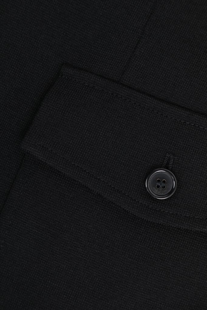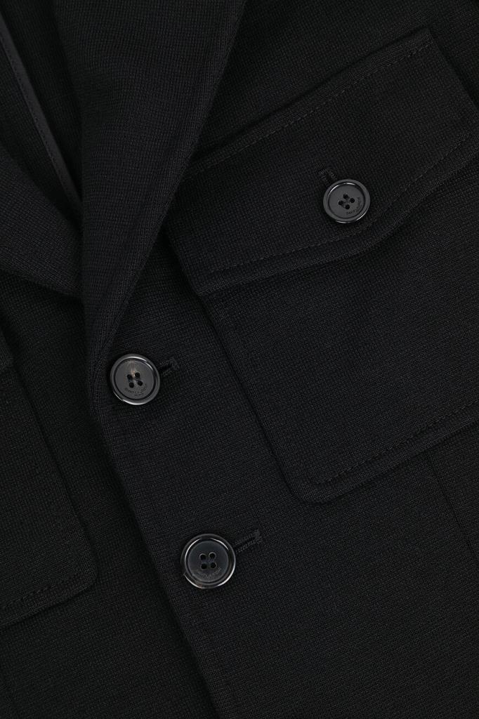 Чёрная куртка Saharienne от бренда Saint Laurent. Модель изготовлена из мягкого джерси на основе натуральной шерсти и прочного нейлона. Изделие застёгивается на роговые пуговицы и отличается четырьмя крупными накладными карманами с клапанами: двумя нагрудными и двумя основными по бокам. Особенностями жакета стали однобортный фасон и частичная шелковая подкладка.