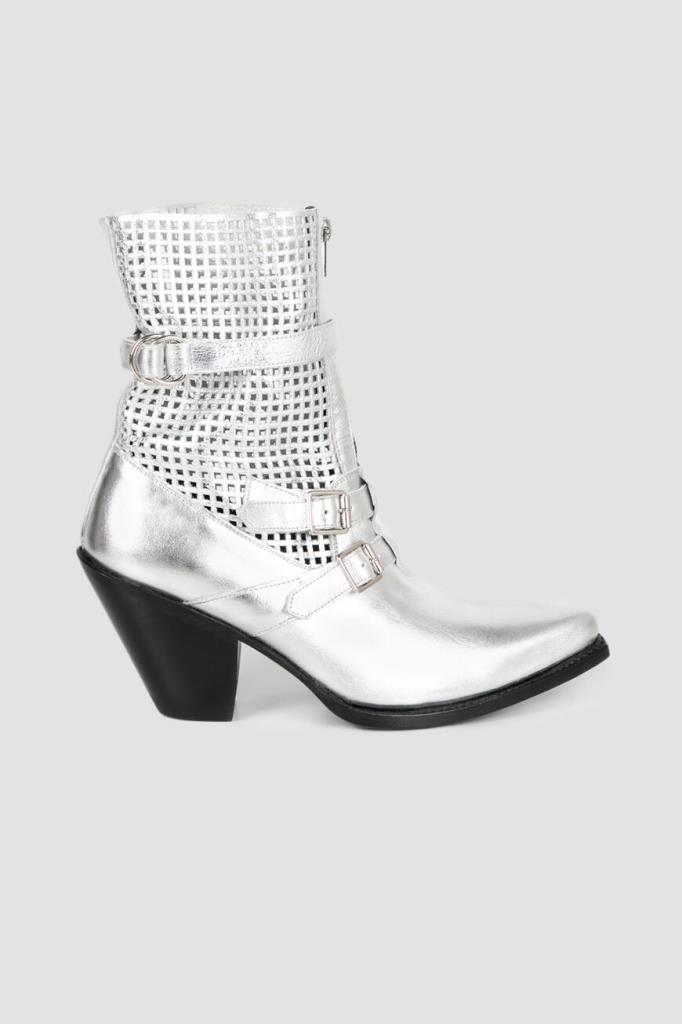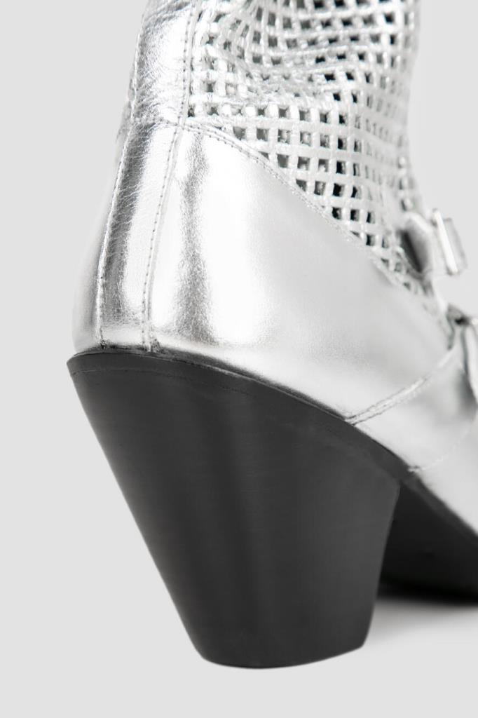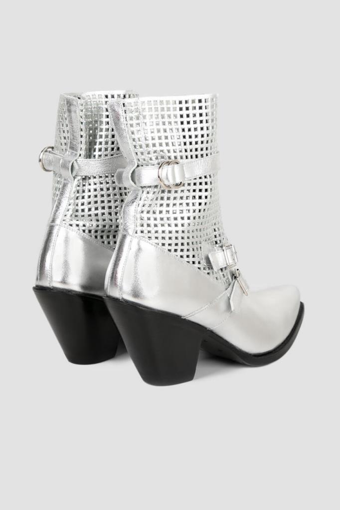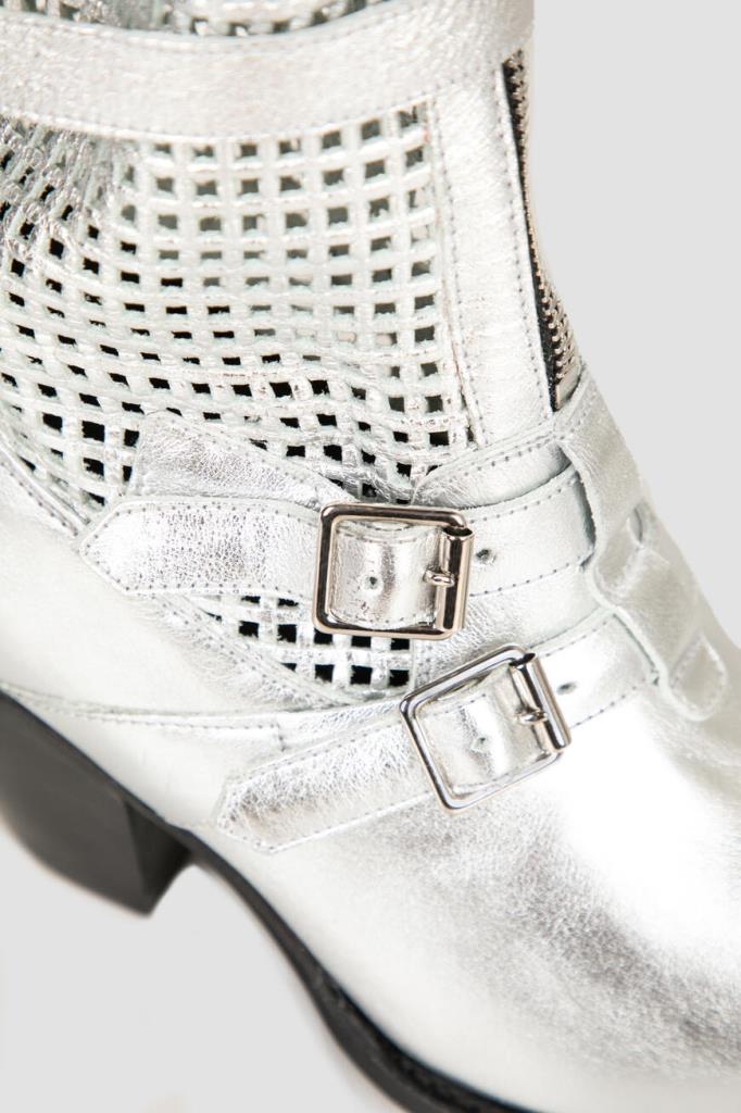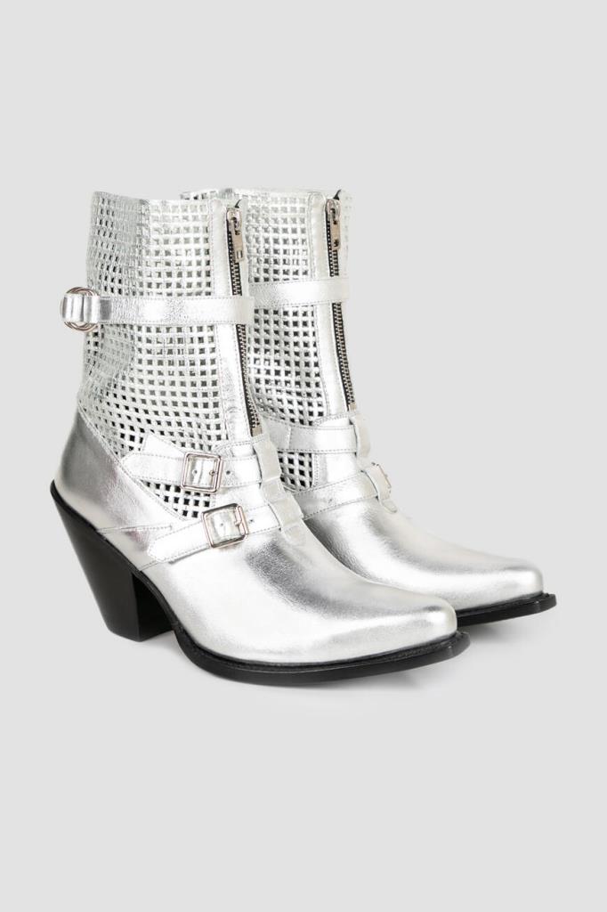 Женские сапоги CELINE из ламинированной серебристой кожи. Модель в ковбойском стиле имеет комфортную среднюю колодку, вытянутые чуть зауженные носки и скошенные наборные каблуки. Фишка модели: ажурный узор голенища, застёжка-молния спереди и декоративные ремешки с пряжками.