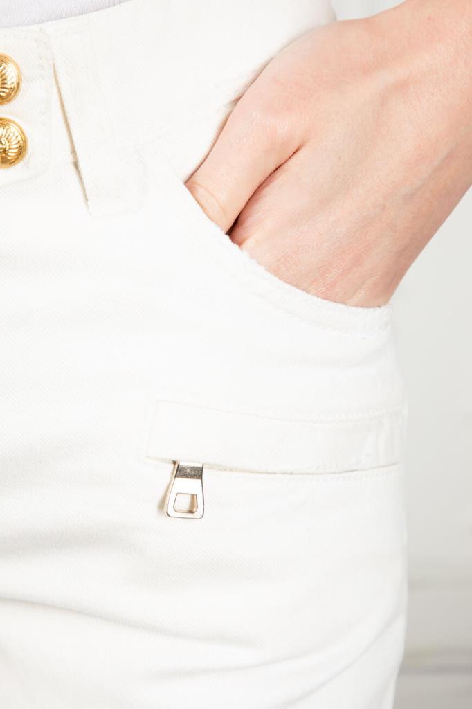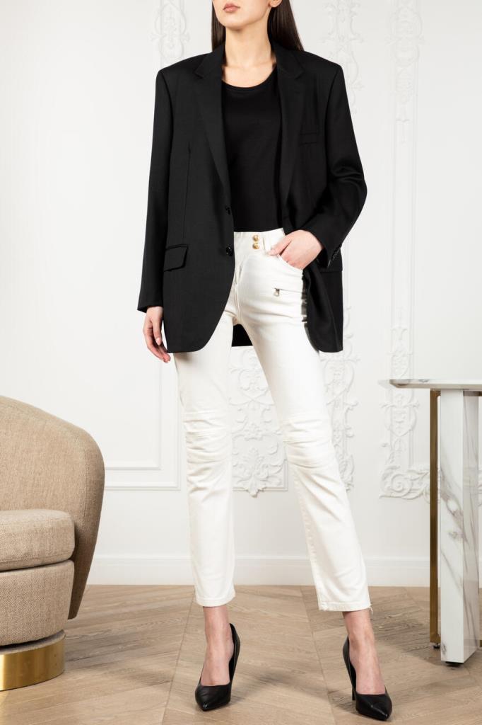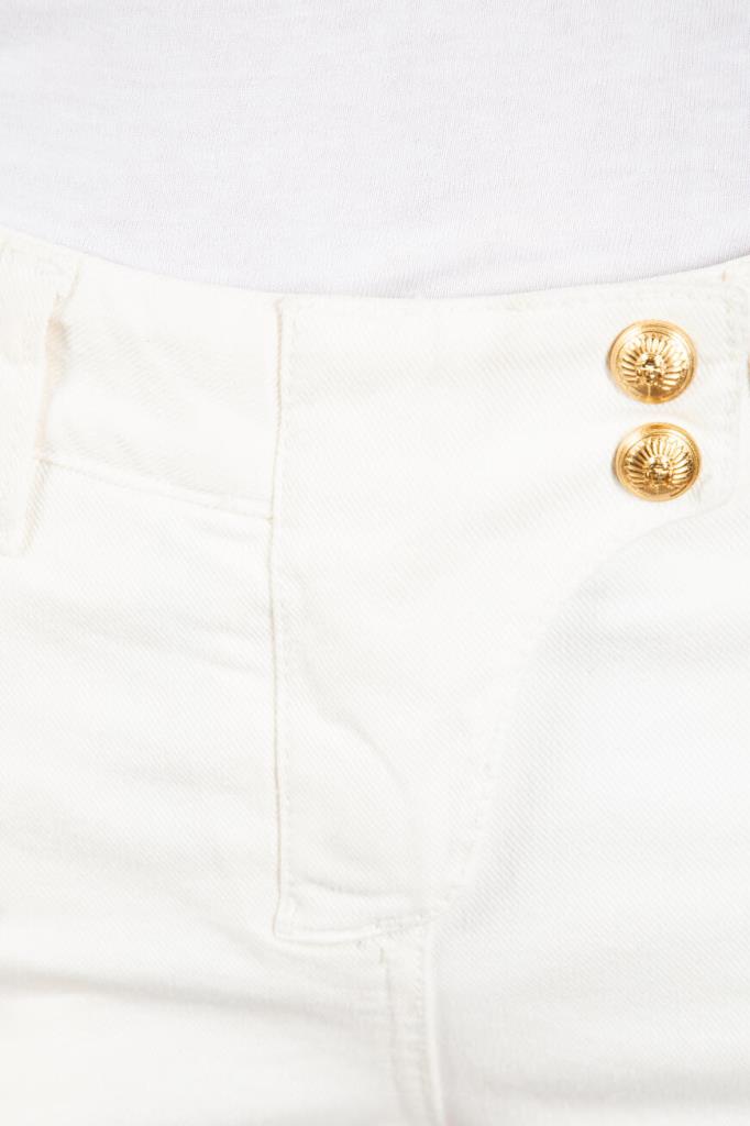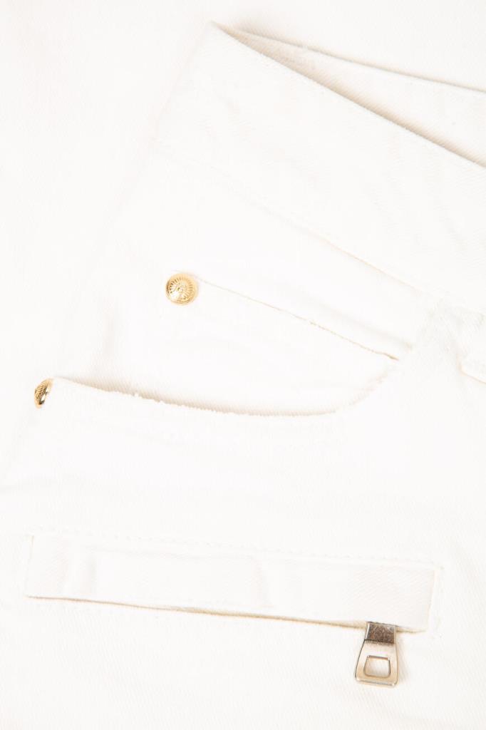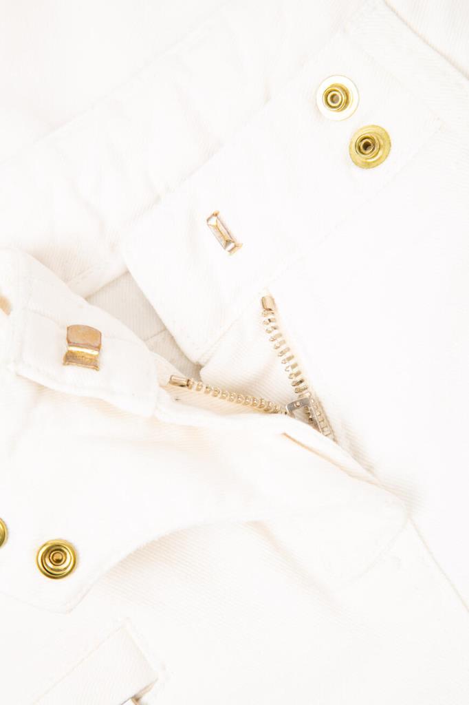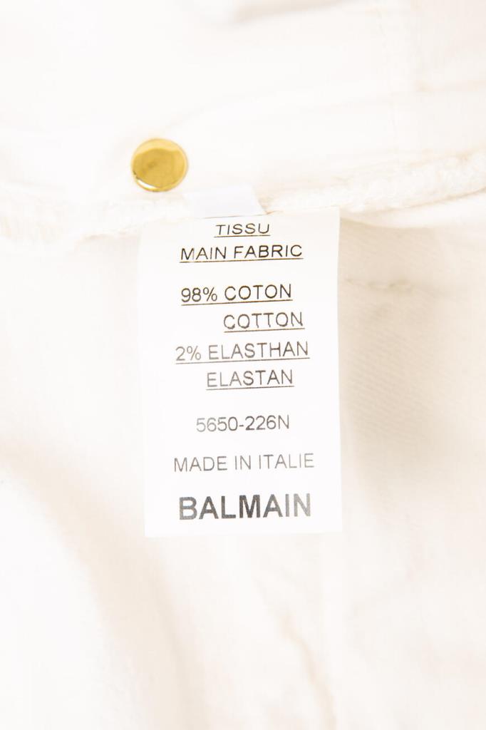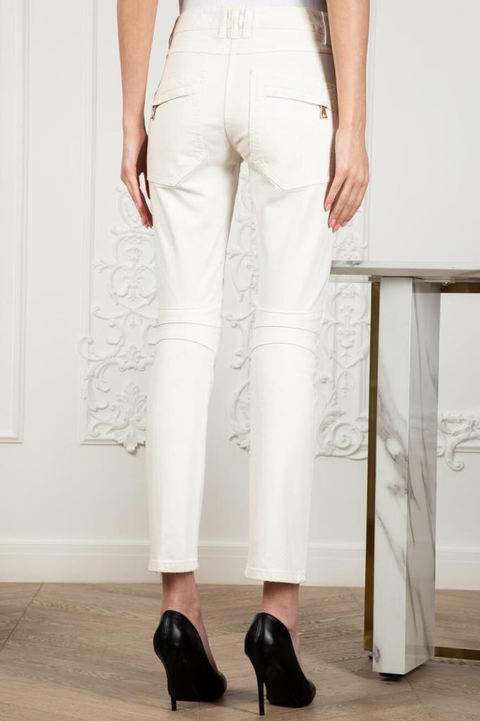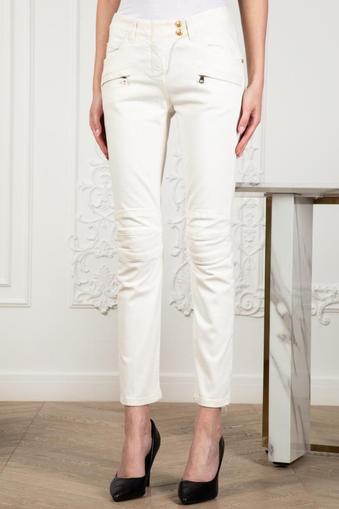 Эффектные женские джинсы BALMAIN из мягкого эластичного хлопкового денима универсального белого цвета. Стильная, слегка укороченная модель ультраоблегающего кроя, с плотным поясом со шлевками под ремень, оригинальной застёжкой на молнию, крючок и фирменные брендированные металлические клёпки с планкой, двумя традиционными джинсовыми карманами спереди по бокам и маленьким прорезным кармашком справа, дополнительными прорезными карманами на молнии спереди чуть ниже и накладными карманами на молнии сзади. Фишка изделия: декоративная рельефная прострочка полосами спереди и сзади на уровне колен.