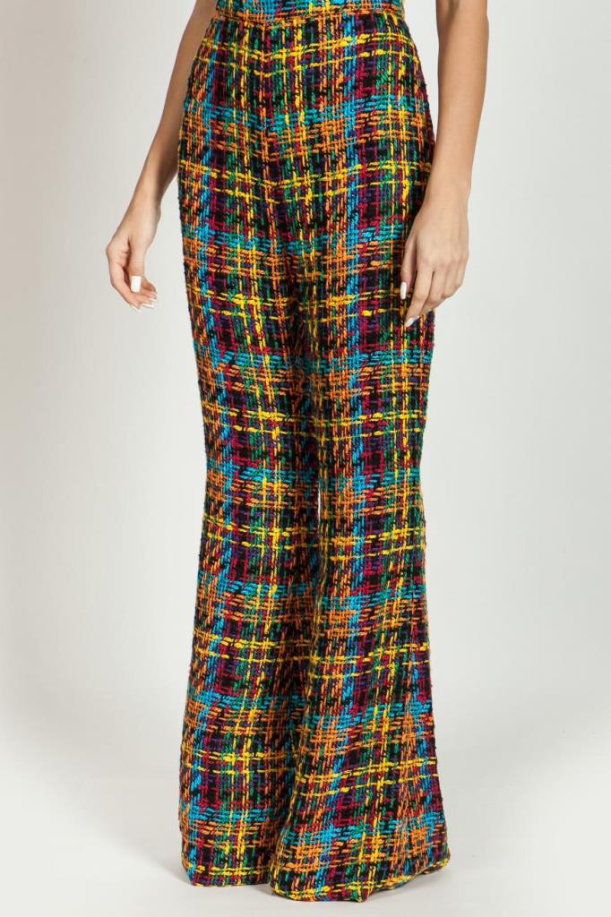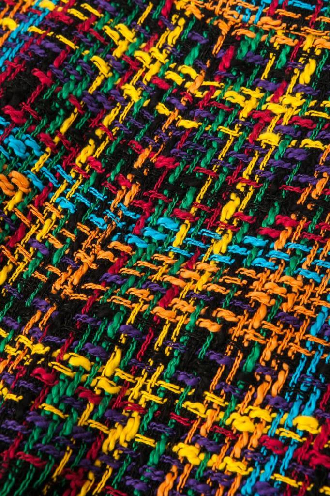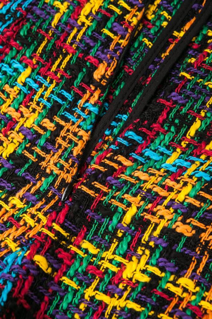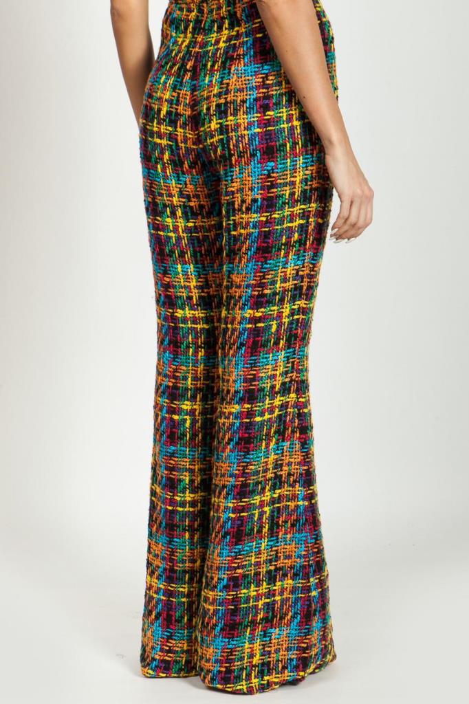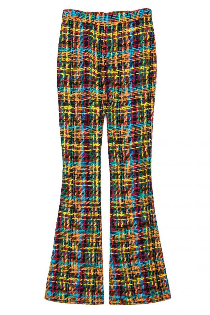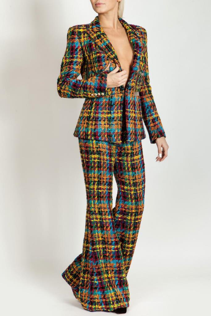 Женские твидовые брюки от французской марки Balmain. Изготовлены из хлопкового микса. Ткань объемная, фактурная. Переплетение цветных нитей создаёт оригинальный узор. Верхняя часть брюк плотно облегает фигуру. Хорошую посадку обеспечивает крой, узкий плотный пояс без шлевок и застёжка на потайную молнию. Брючины свободного фасона сильно расширяются книзу, плавно обтекая силуэт. Идеально сочетаются с пиджаком из той же коллекции.