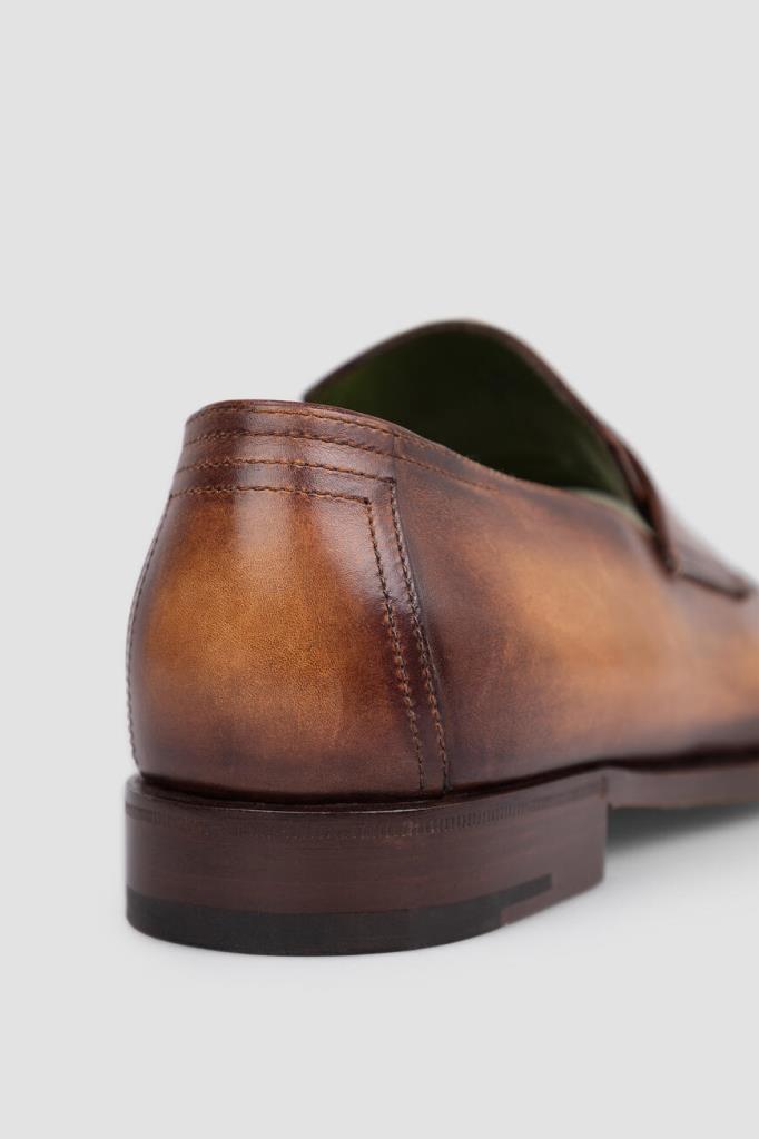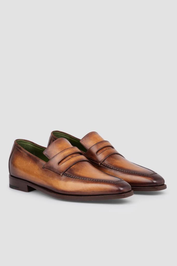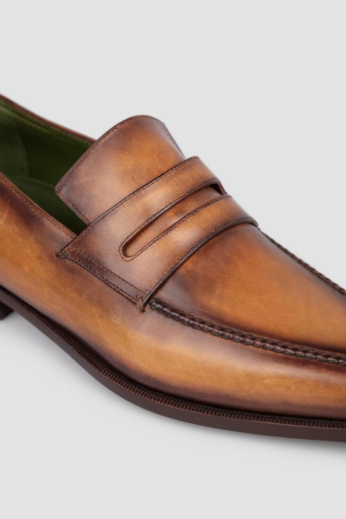 Мужские пенни-лоферы Andy Démesure от Berluti из патинированной кожи Venezia. Модель универсального коричневого цвета изнутри отделана зеленой кожей. Подошва декорирована перфорацией с логотипом бренда.