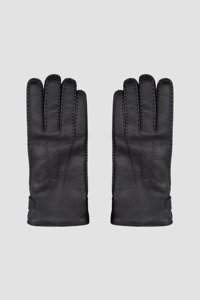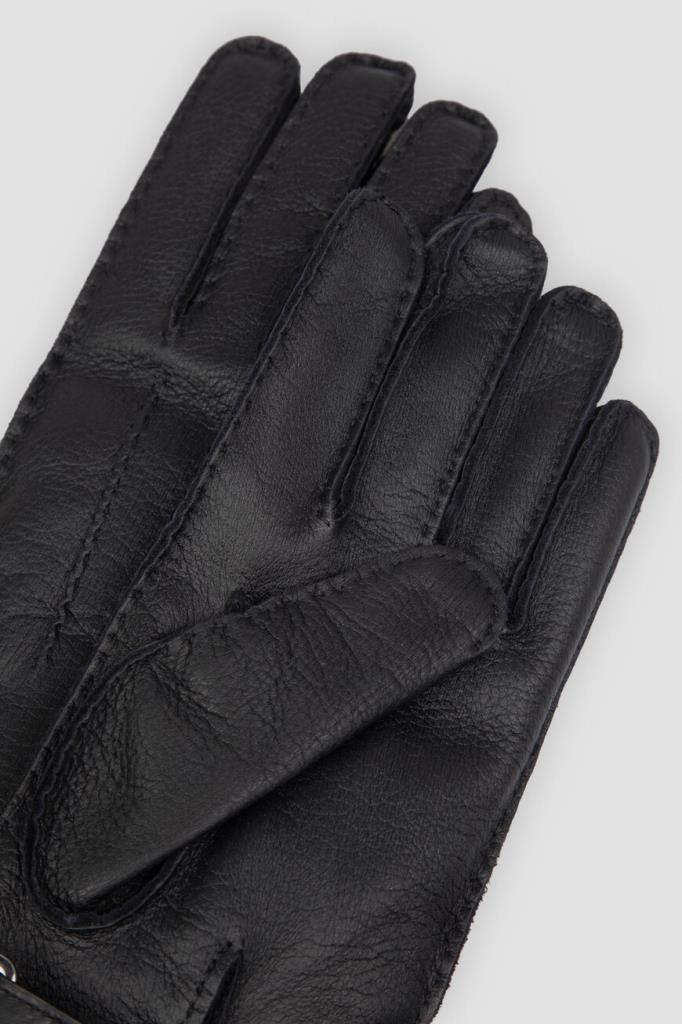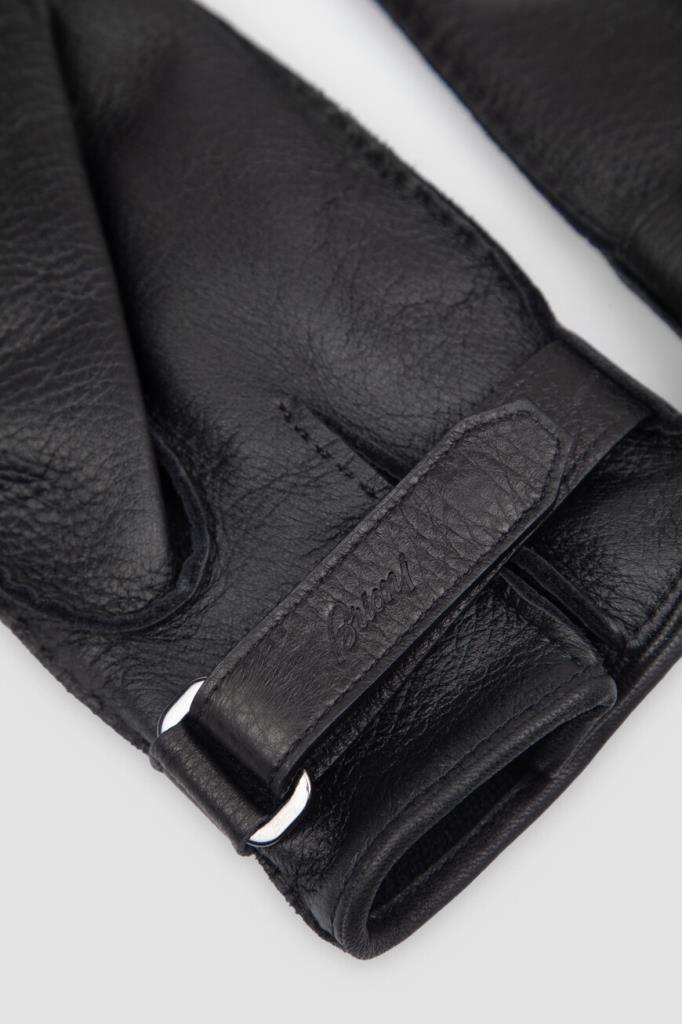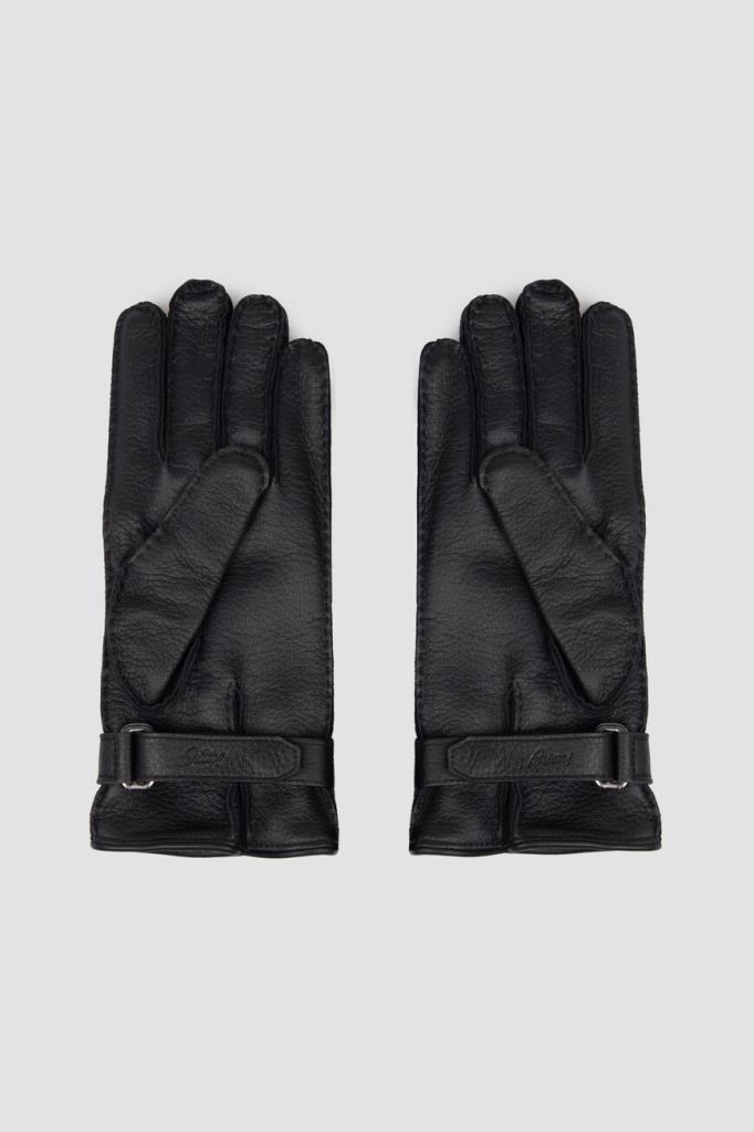 Кожаные перчатки Brioni с рельефной дизайнерской строчкой. Изделие выполнено в чёрном базовом цвете и дополнено изящными разрезами и фиксирующим ремешком на уровне запястья. Отличительной деталью стал тиснёный логотип Дома на ремешке.