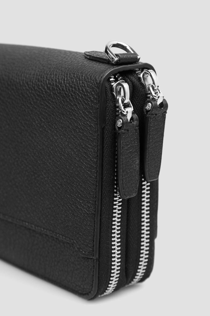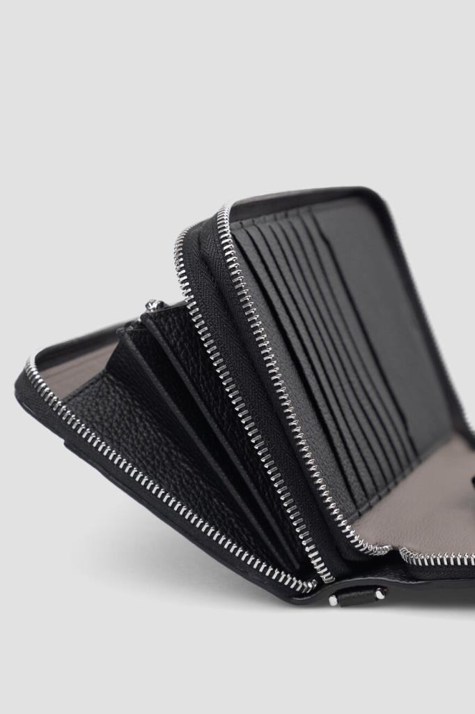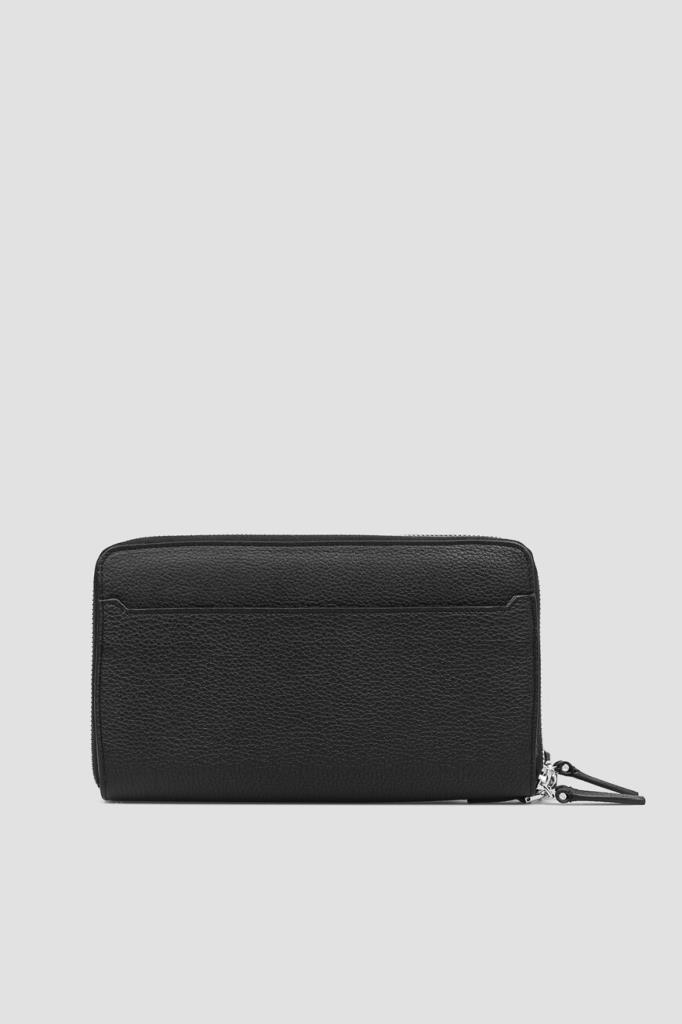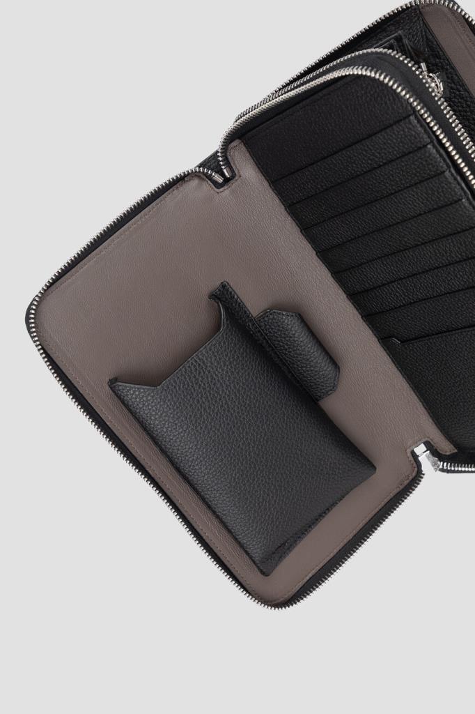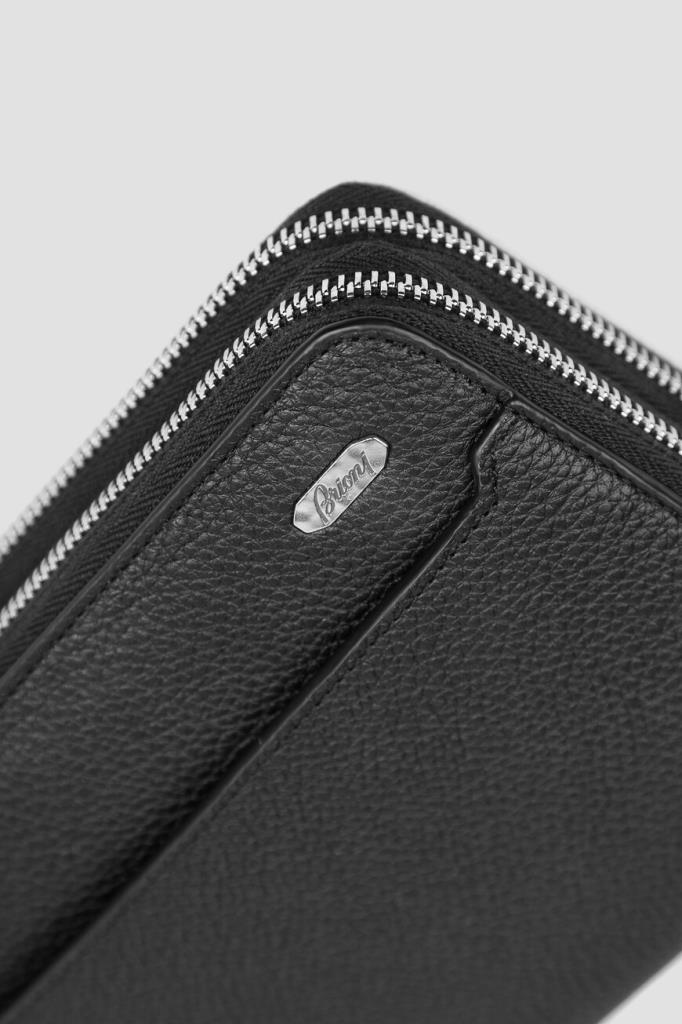 Портмоне из мягкой зернистой кожи телёнка от Brioni. Материал чёрного цвета устойчив к появлению потёртостей и царапин. Аксессуар оснащён двумя объёмными внутренними отделениями на молнии и плоскими карманами без застёжки спереди и сзади. Культовый восьмиугольный лейбл с логотипом Дома полностью углублён в кожу, благодаря чему изделие легко помещается в карман. Эта лёгкая и компактная модель идеально подходит для ежедневного использования и путешествий.