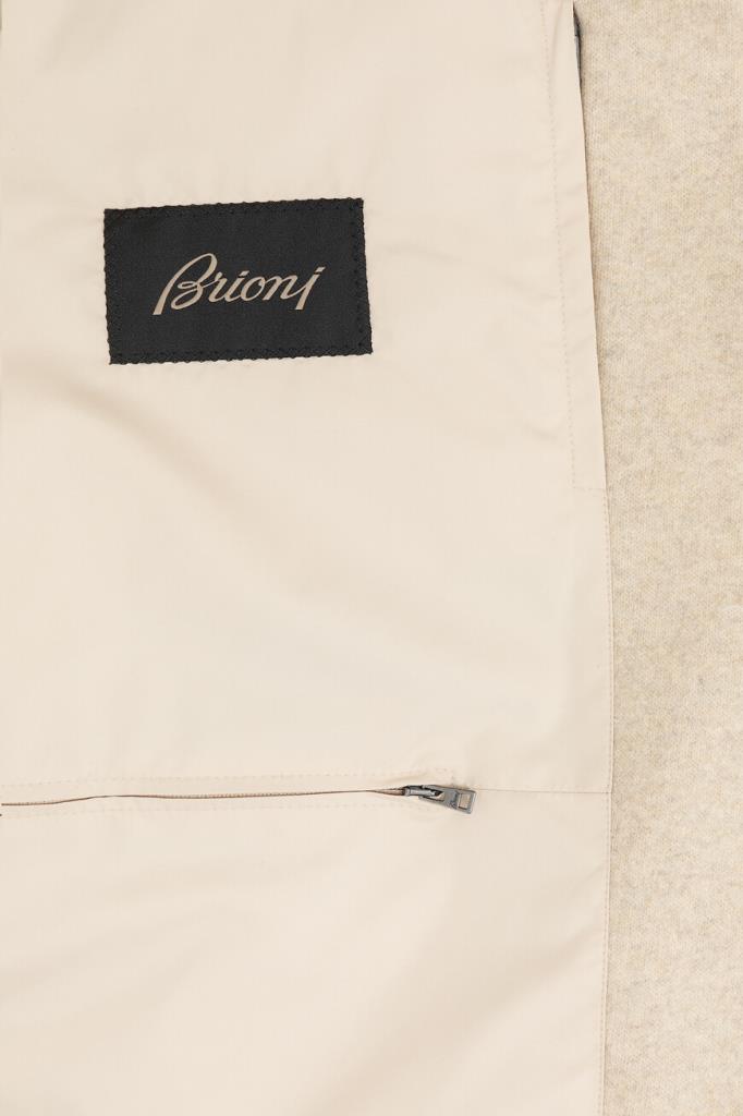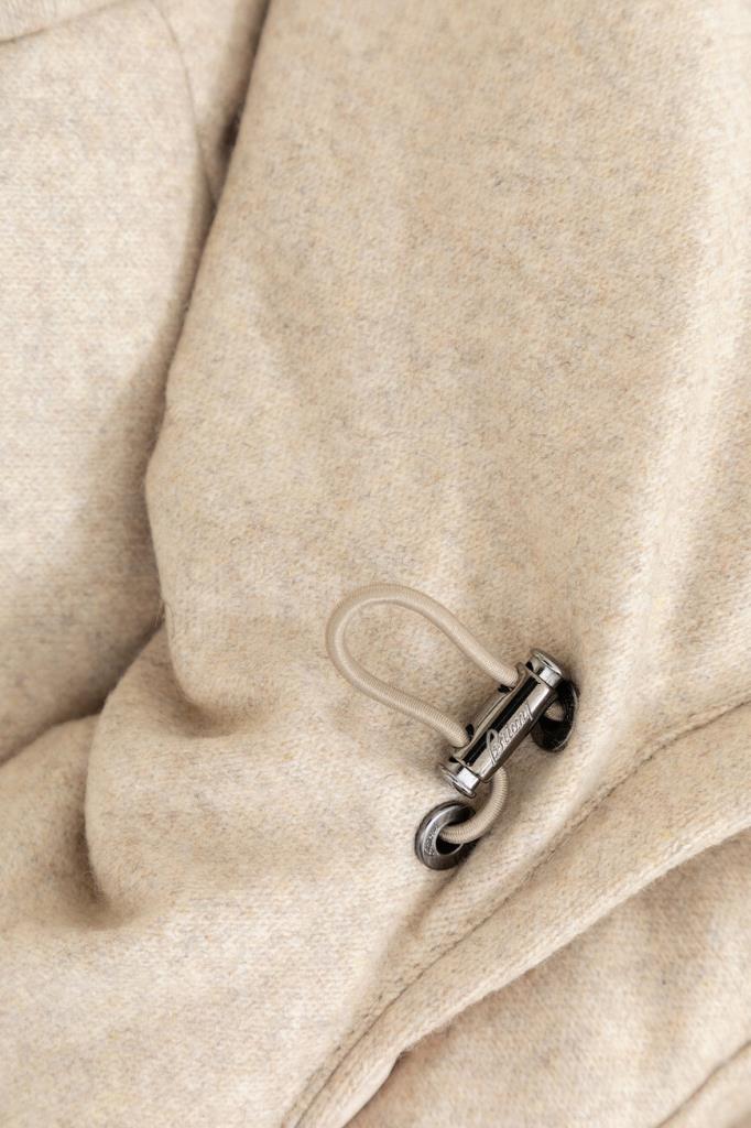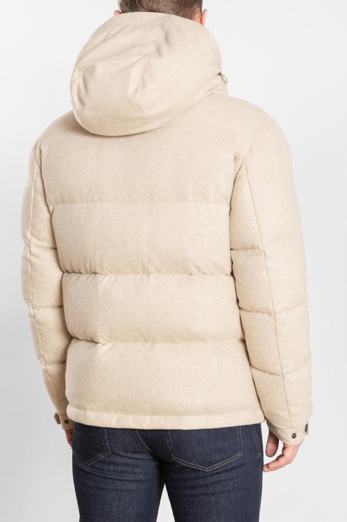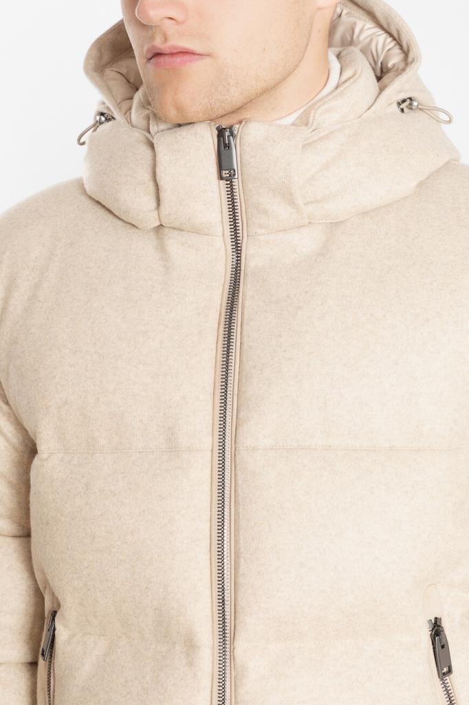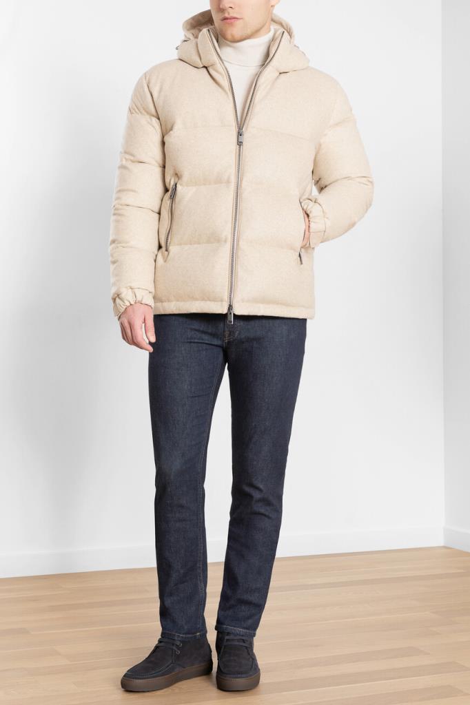 Светло-бежевый пуховик с горизонтальной стёжкой от Brioni. Фасон изделия из мягкого трикотажа на основе натуральной шерсти и кашемира предполагает прямой крой и объёмный капюшон на кулиске. Модель застёгивается на молнию с двумя бегунками и сочетается с кашемировой водолазкой, тёмно-синими джинсами и ботинками из той же коллекции.