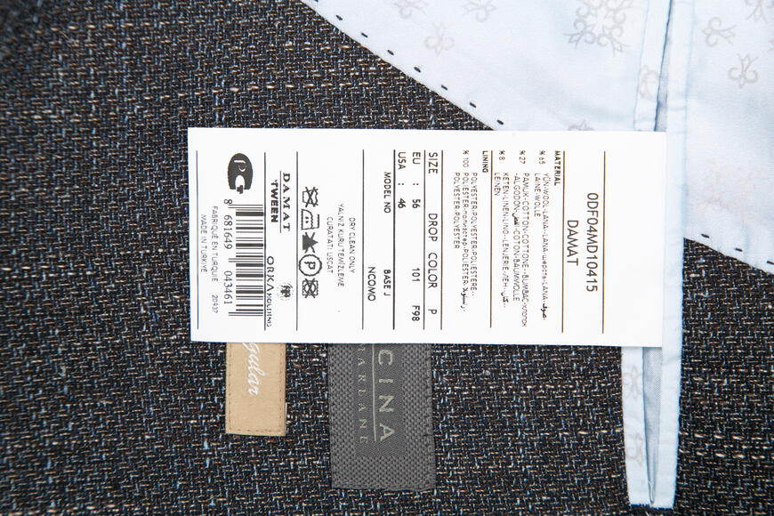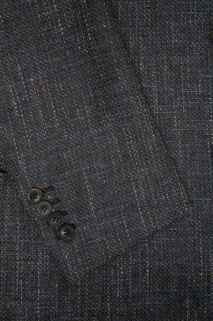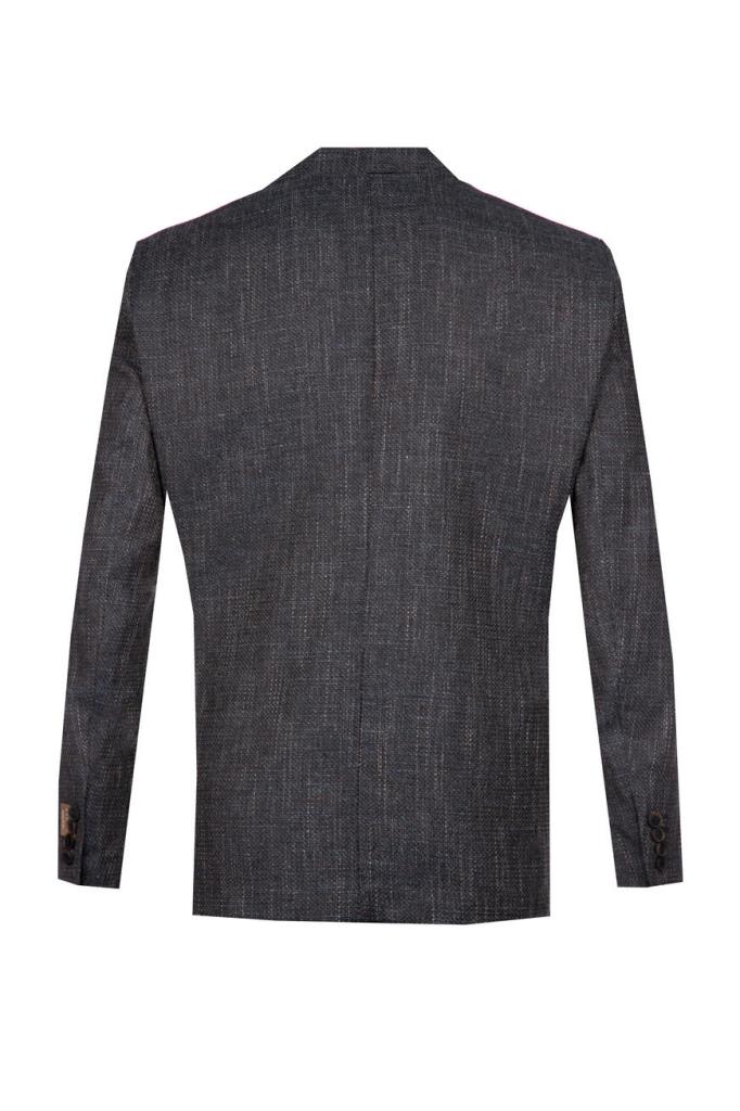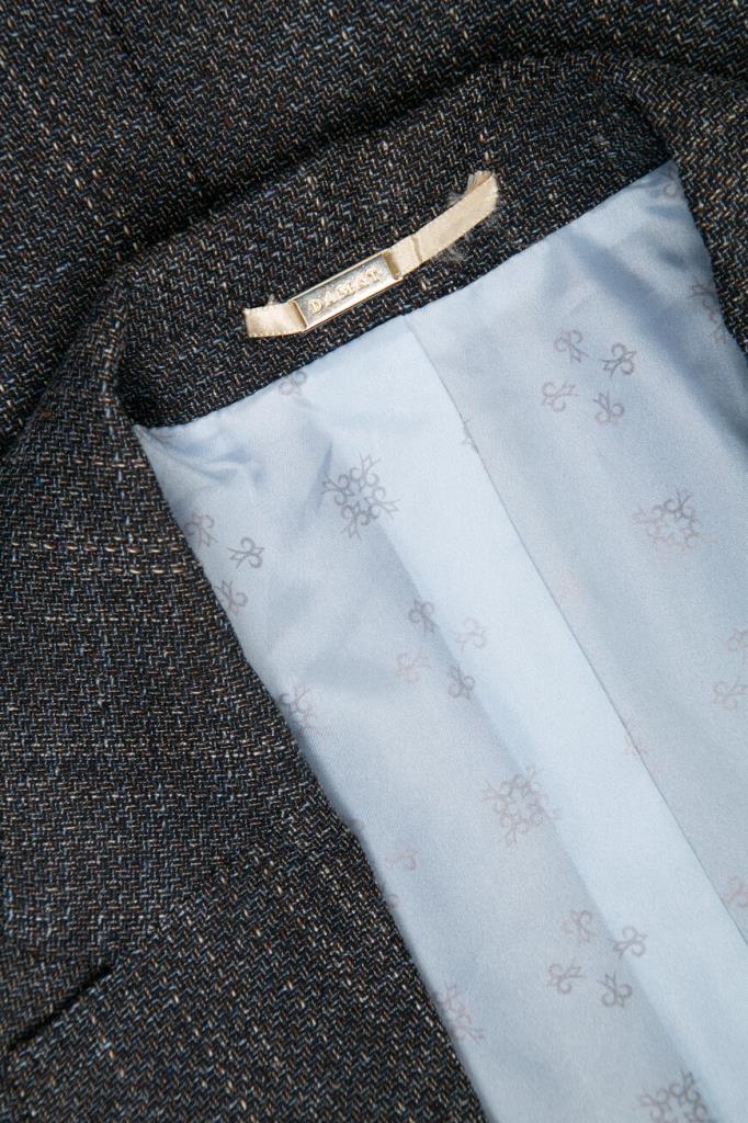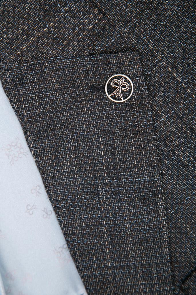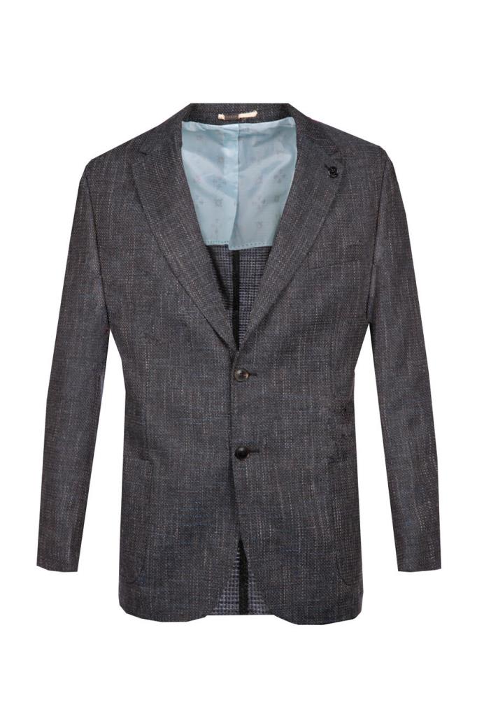 Стильный мужской пиджак DAMAT из мягкого трикотажа на основе натуральной шерсти, хлопка и льна серого цвета с оригинальным контрастным разноцветным меланжевым узором по всей поверхности изделия.