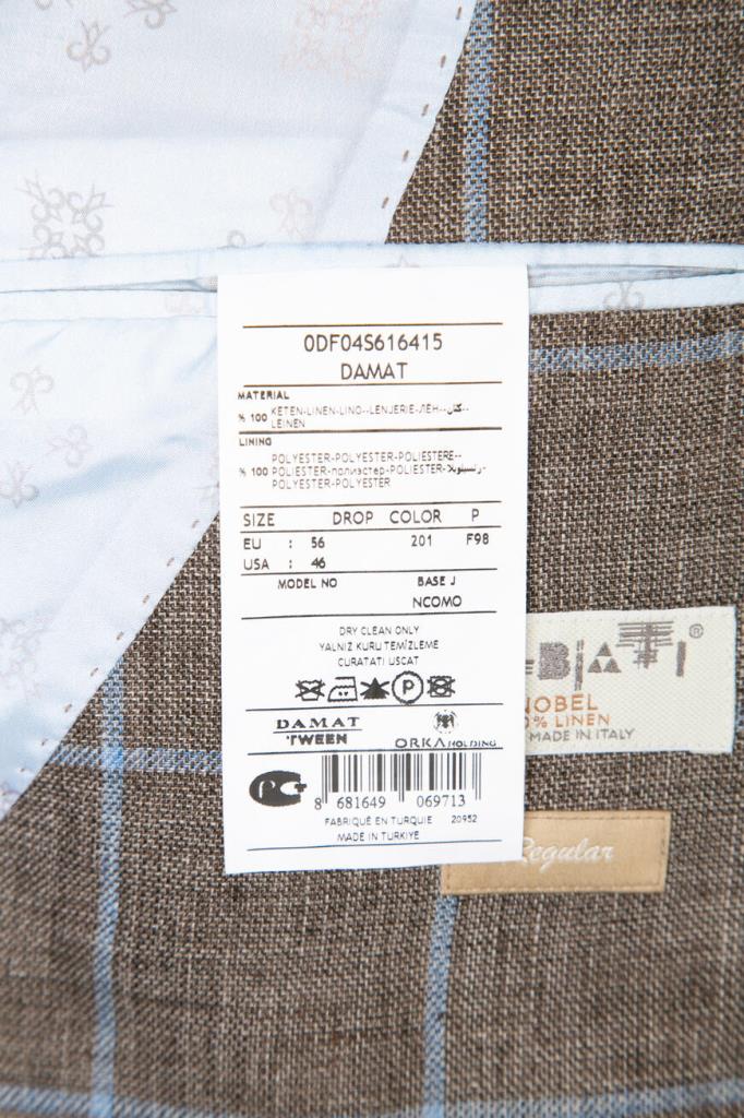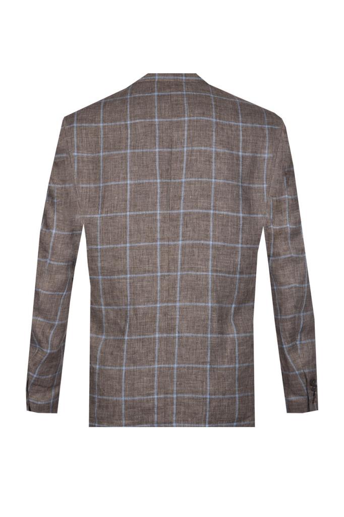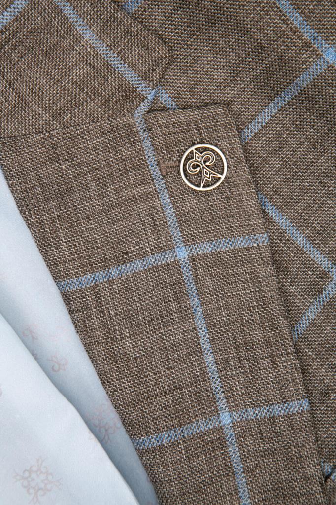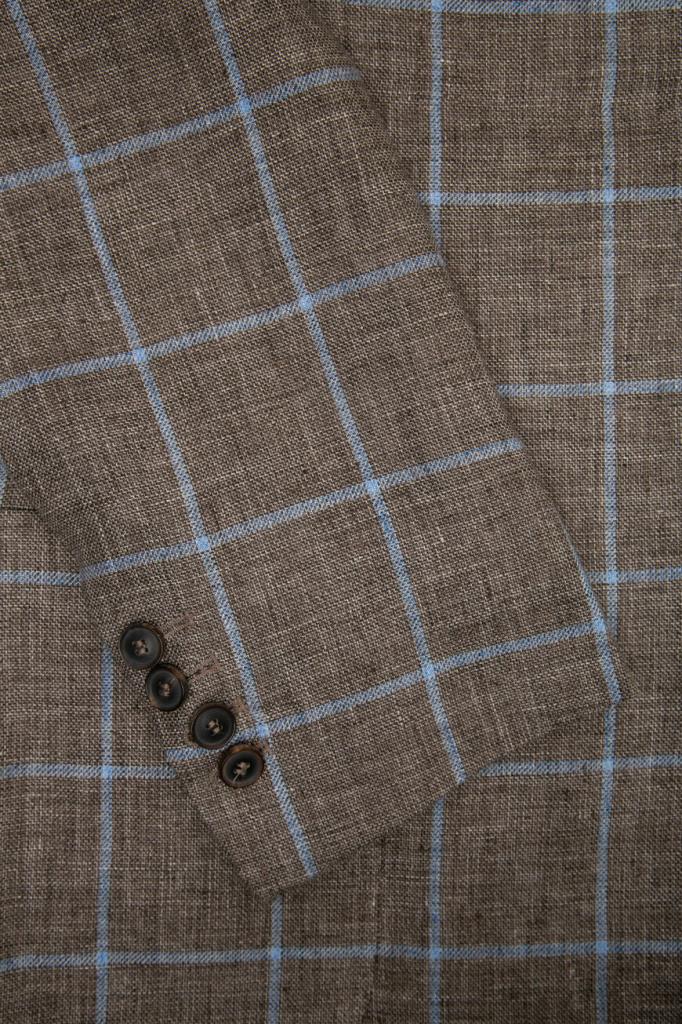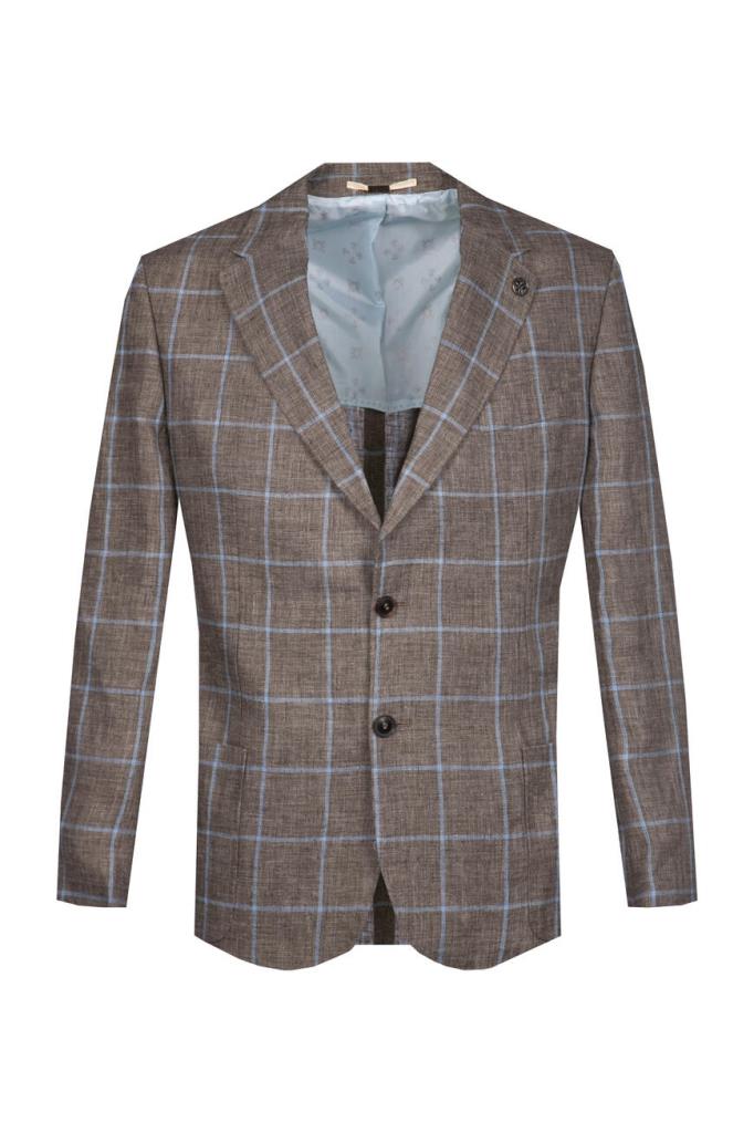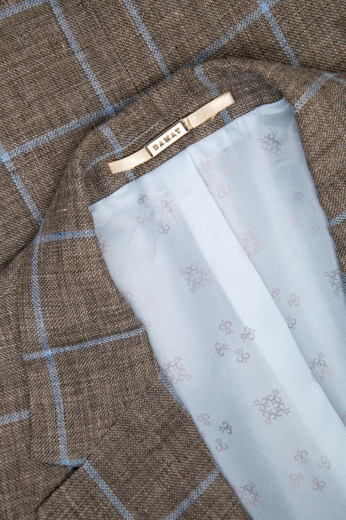 Стильный мужской пиджак DAMAT из лёгкого мягкого льна коричневого оттенка с заметным меланжем и оригинальным контрастным геометрическим узором в крупную голубую клетку по всей поверхности изделия.