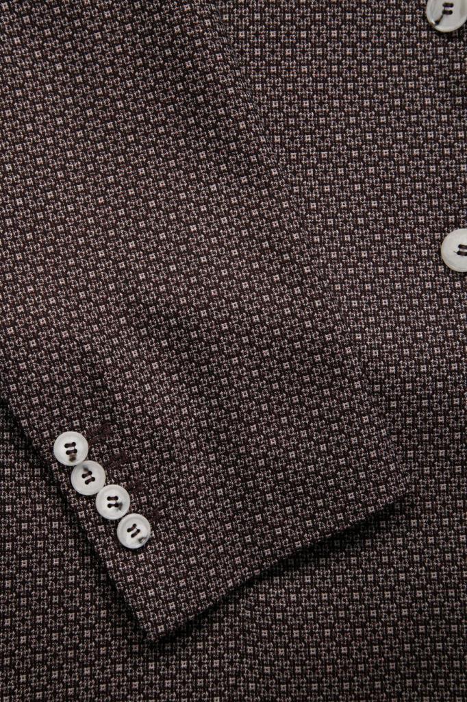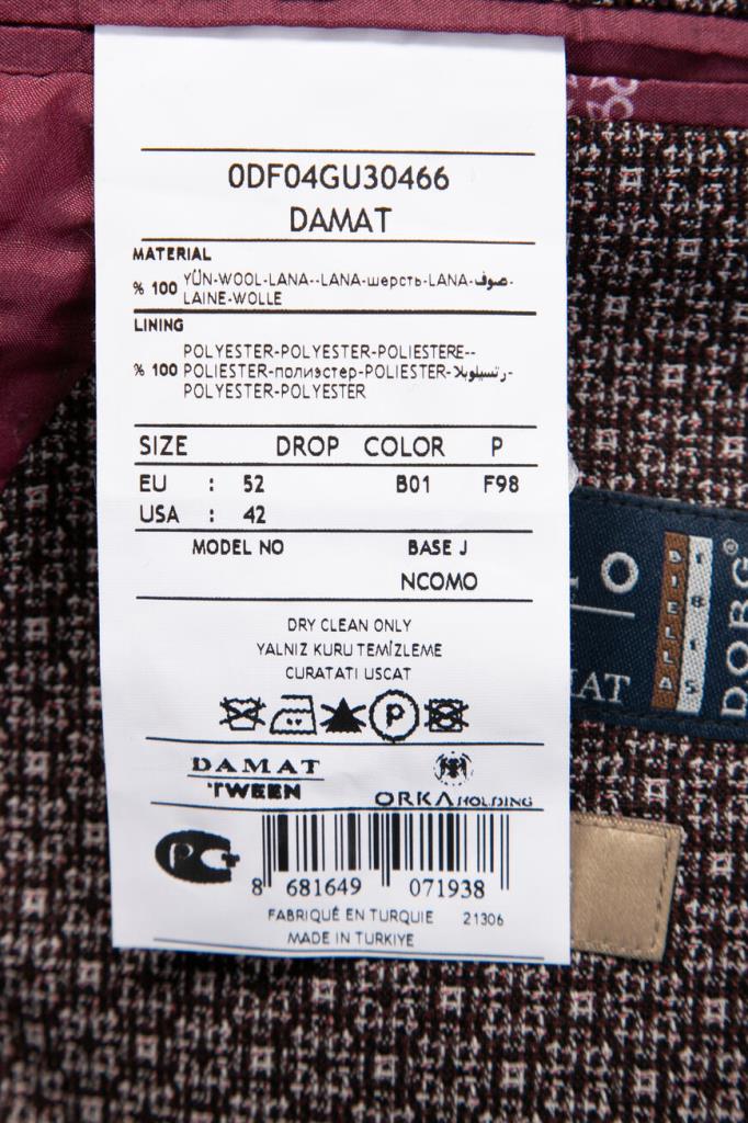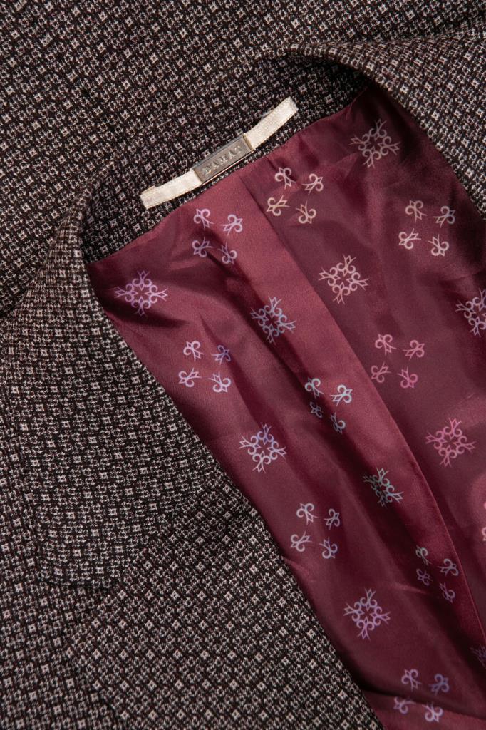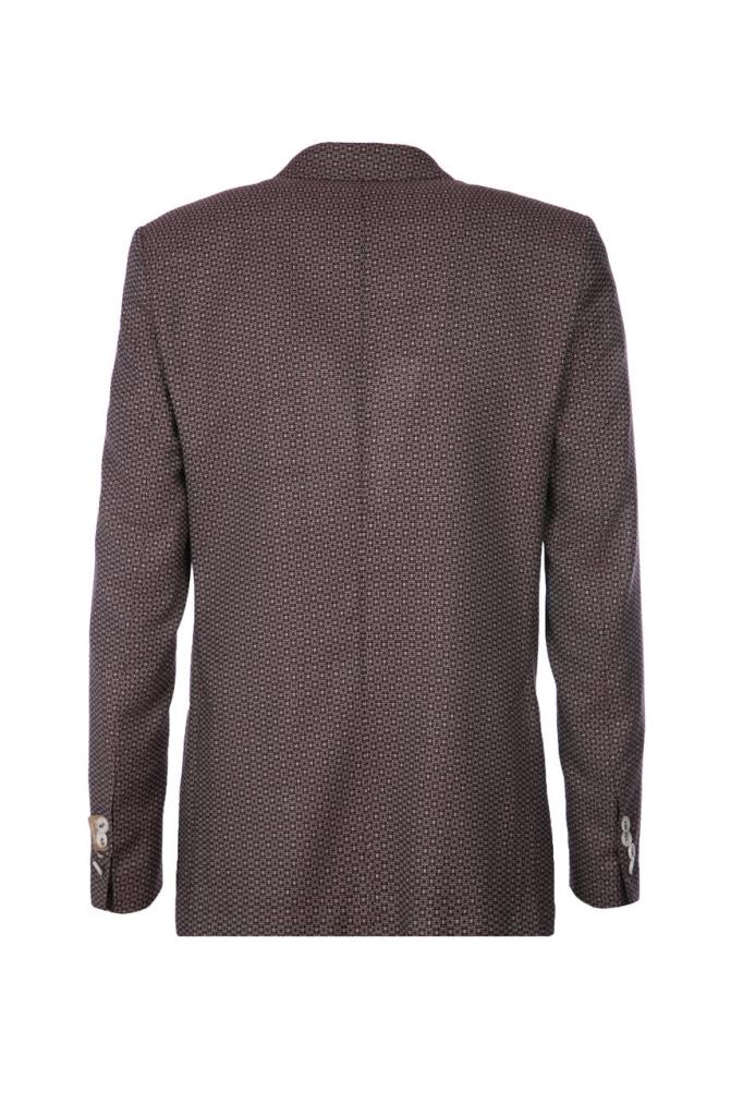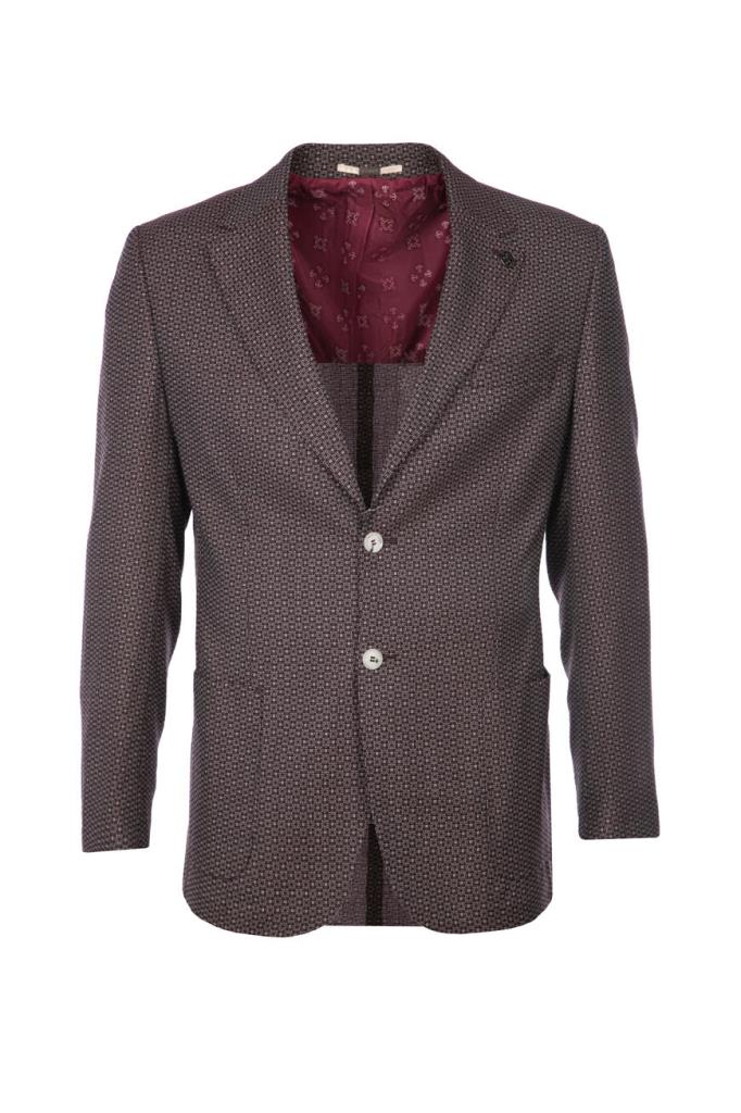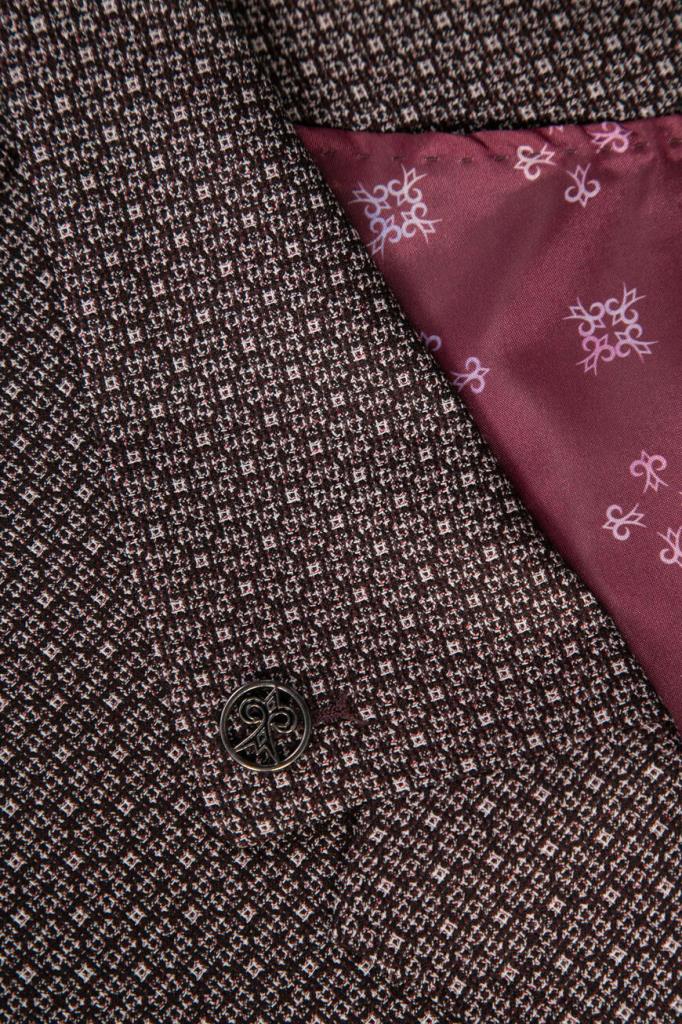Шикарный мужской пиджак DAMAT выполнен из мягкой натуральной шерсти и дополнен оригинальным контрастным геометрическим узором в изысканной серо-бордовой гамме по всей поверхности изделия.