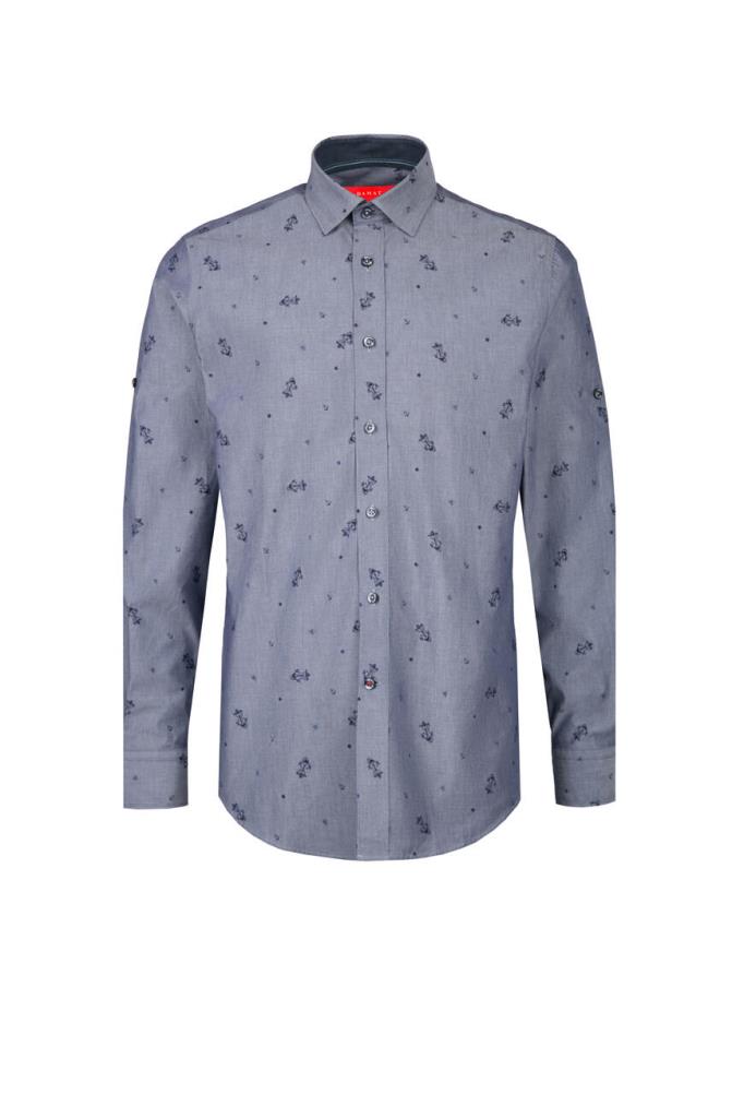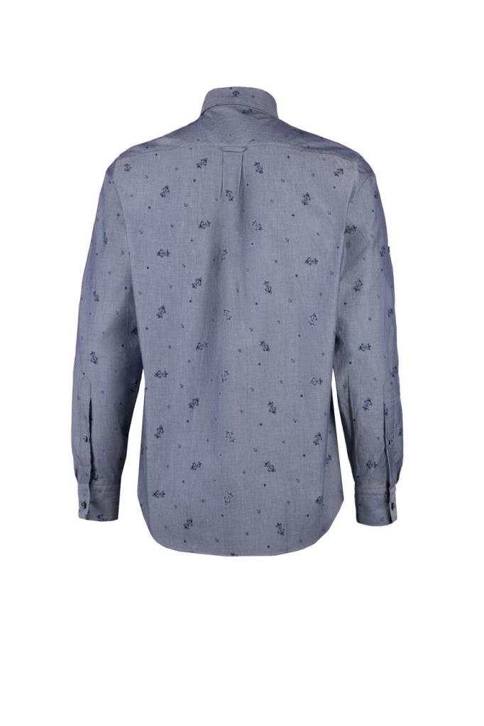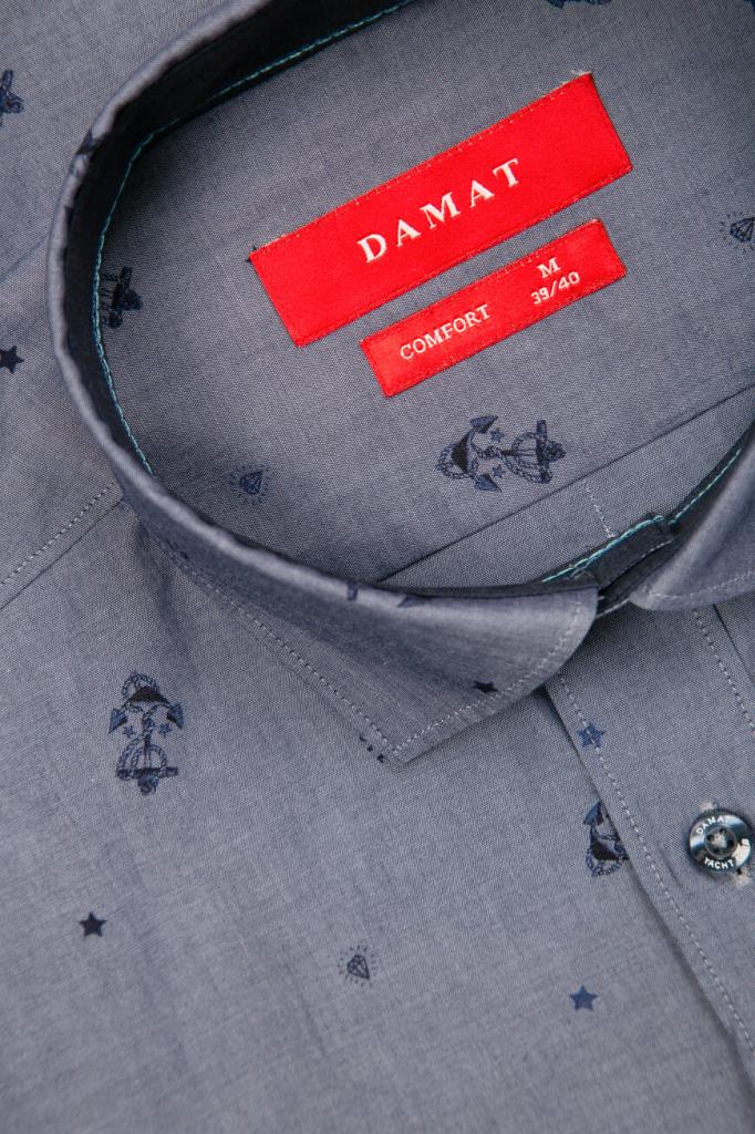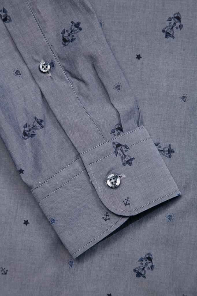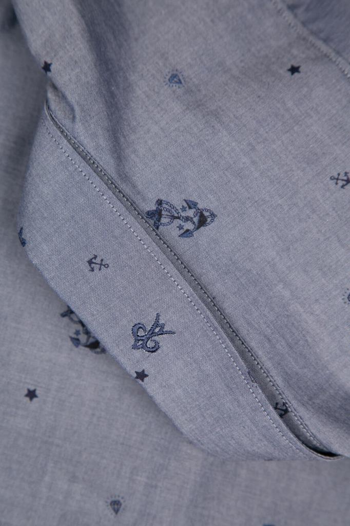 Стильная мужская рубашка DAMAT из мягкого хлопкового трикотажа серого цвета с оригинальным контрастным тёмно-синим геометрическим узором-вышивкой в виде якорей, звёздочек и алмазов по всей поверхности изделия.