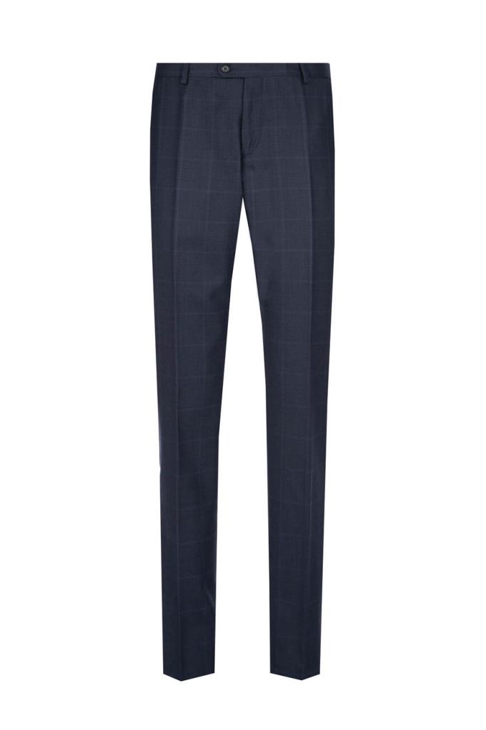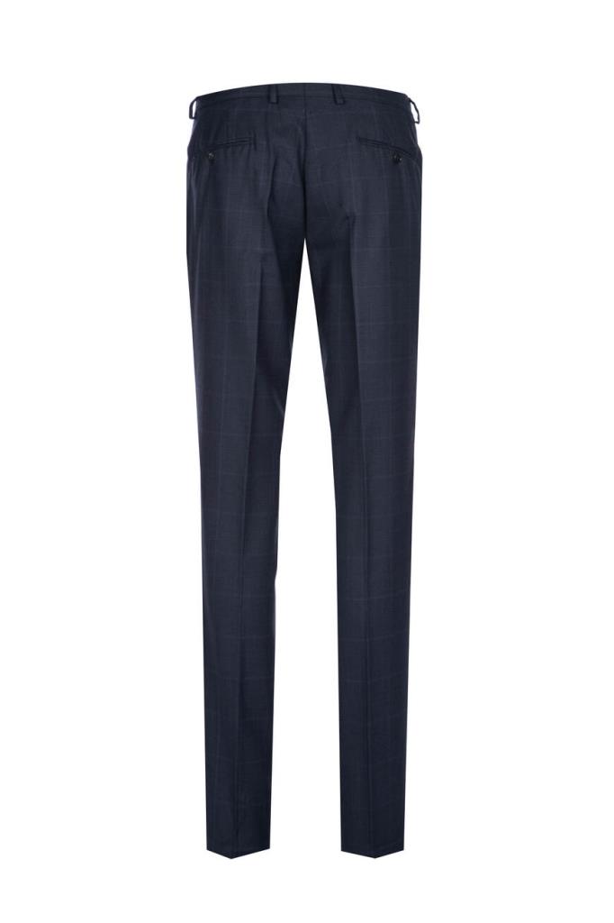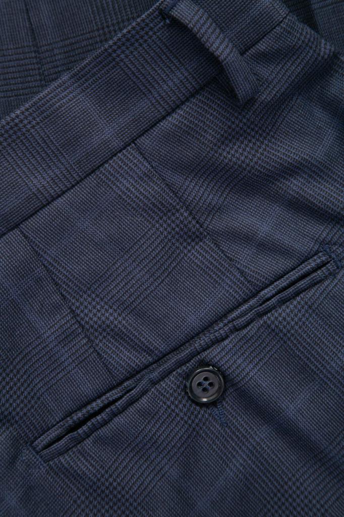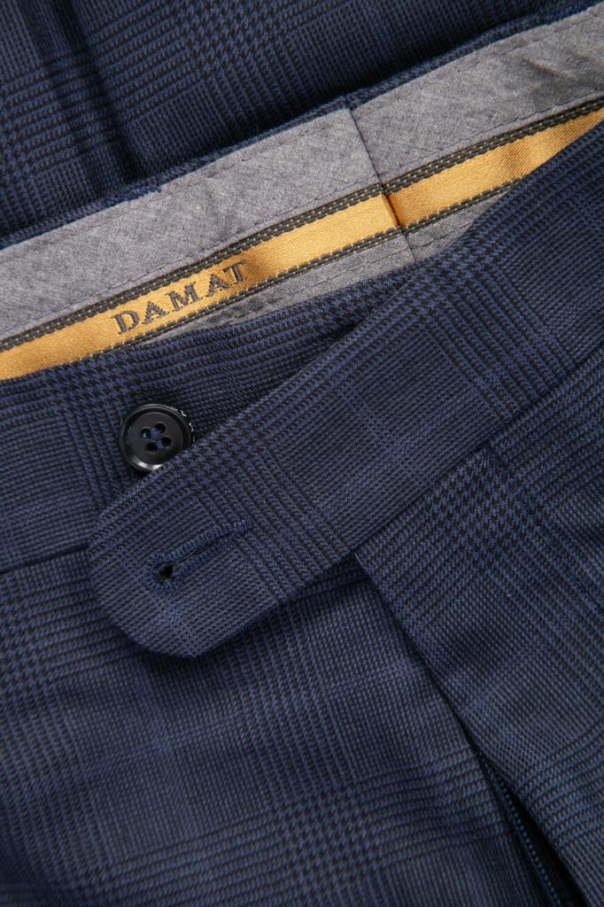 Стильные мужские классические брюки DAMAT из мягкой натуральной шерсти тёмно-синего цвета с оригинальным контрастным разноцветным геометрическим узором в клетку в универсальной чёрно-синей гамме по всей поверхности изделия.