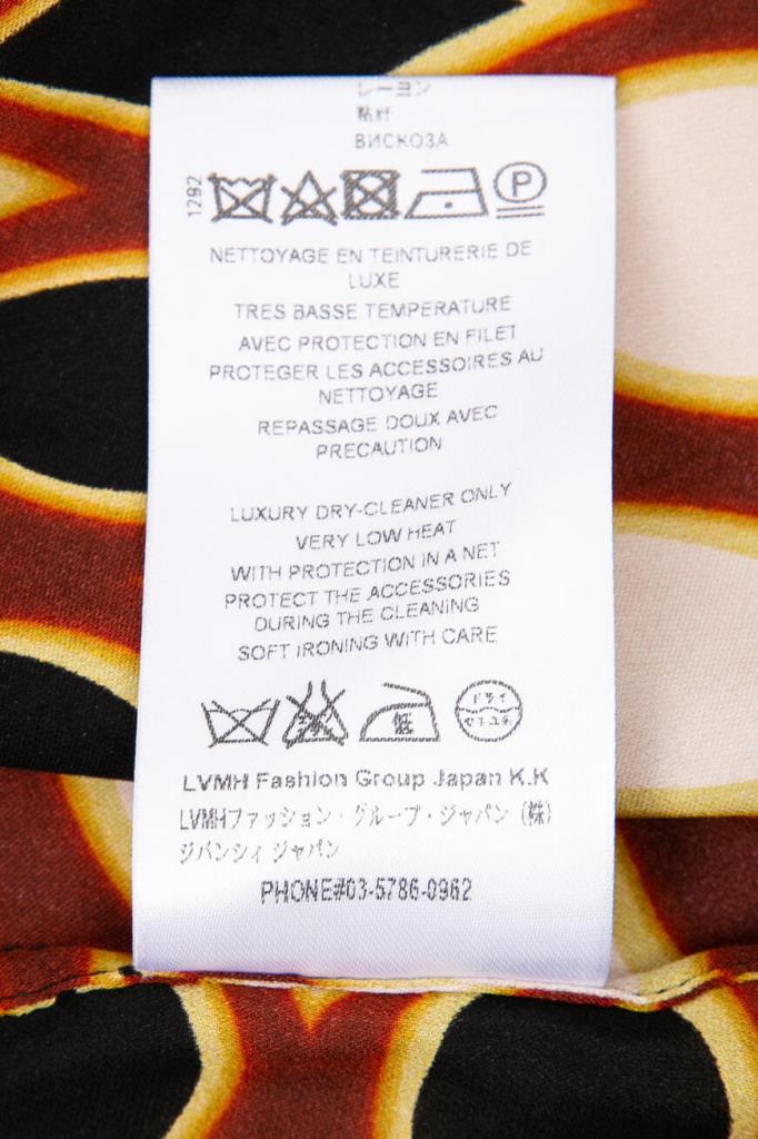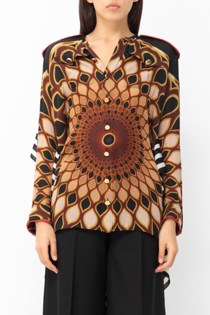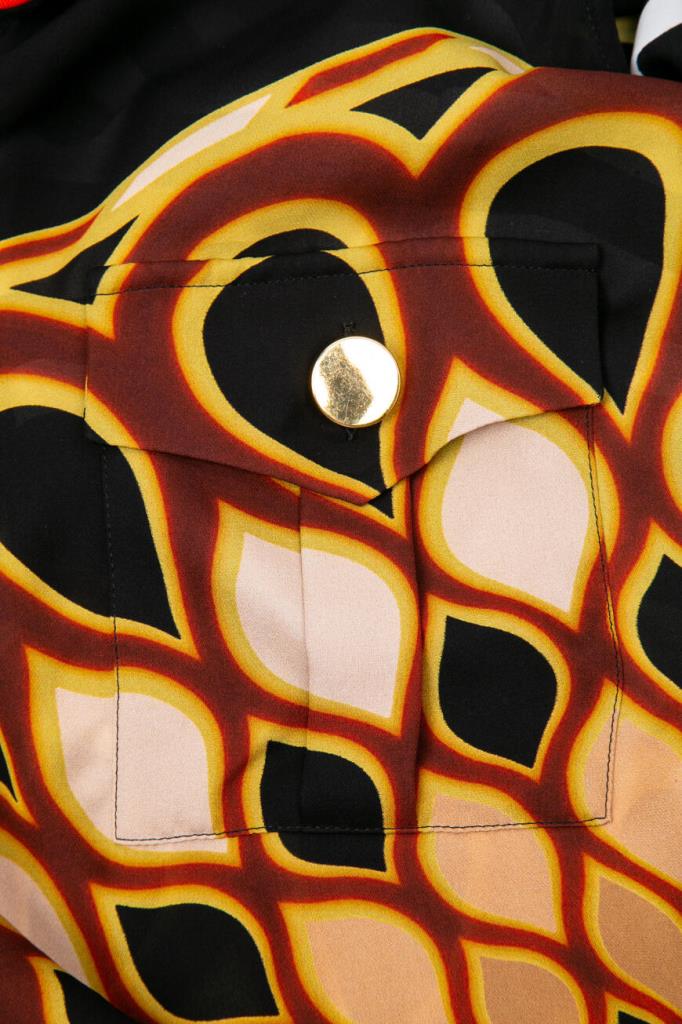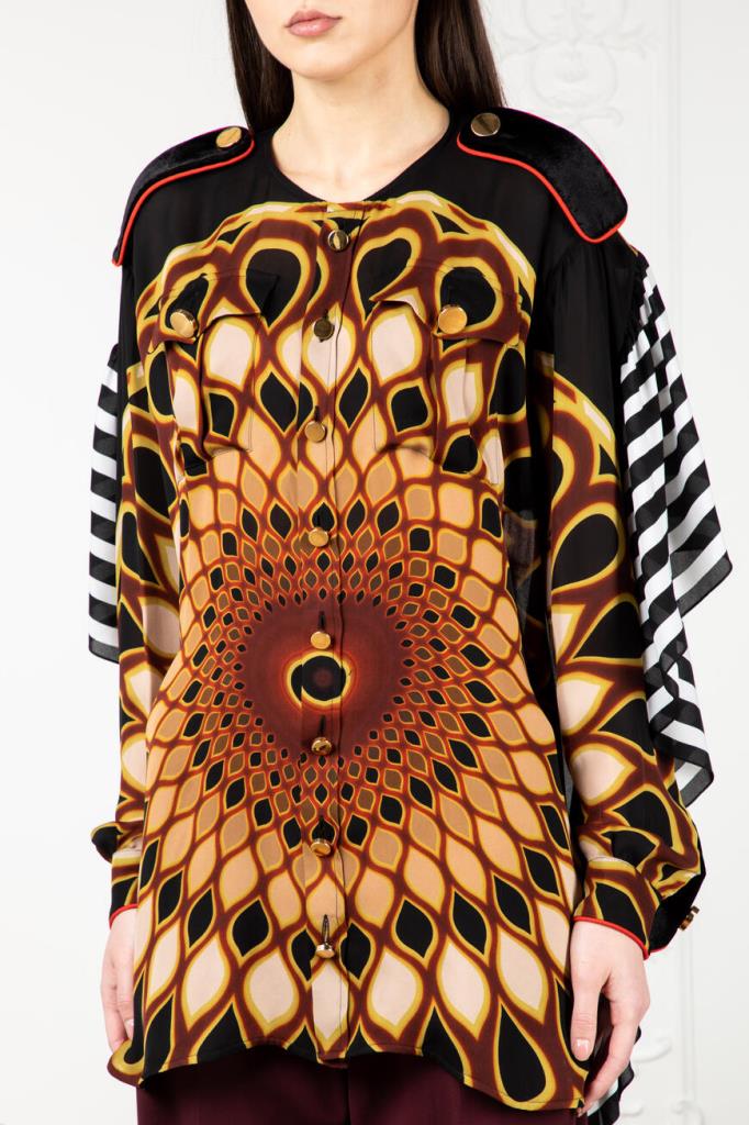 Стильная блуза от французской марки GIVENCHY. Изготовлена из натурального шелка. Материал лёгкий, прохладны, приятный на ощупь. Натуральный шелк – один из самых комфортных и ценных видов ткани. Он отлично впитывает влагу тела и быстро испаряет её, оставаясь сухим и комфортным. Этот материал также благотворно влияет на кожу. Модель подиумная, участвовавшая в показе, рамках парижской недели моды. Черного цвета с геометрическим рисунком в тёплых коричнево-бежевых тонах, свободного силуэта. С лёгкой тканью основы контрастируют погоны и отделка манжет, выполненные из плотной велюровой ткани ярко-красного цвета. Особого внимания заслуживает спинка необычного дизайнерского кроя. Очень стильная и необычная модель. Сочетается с брюками и джинсами из той же коллекции. Отлично будет смотреться с узкой юбкой или брюками-skinny.