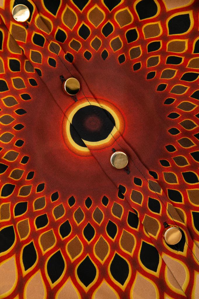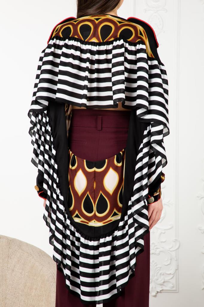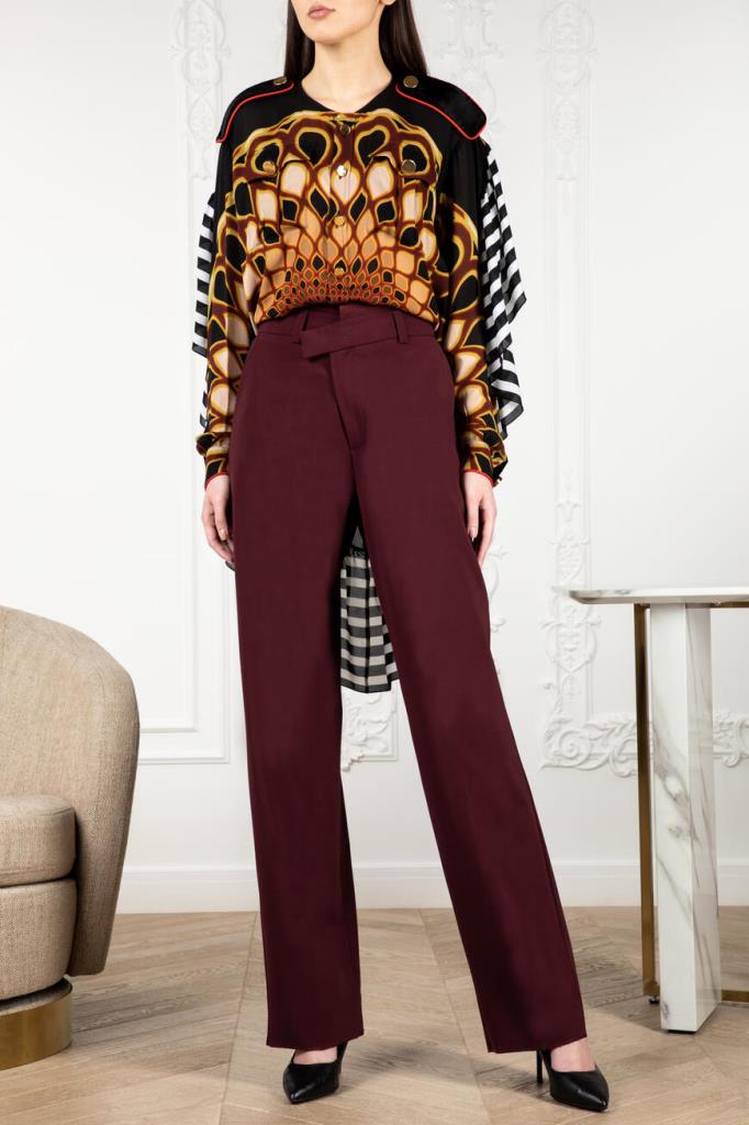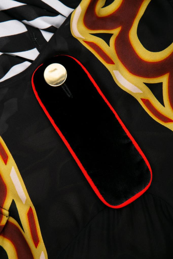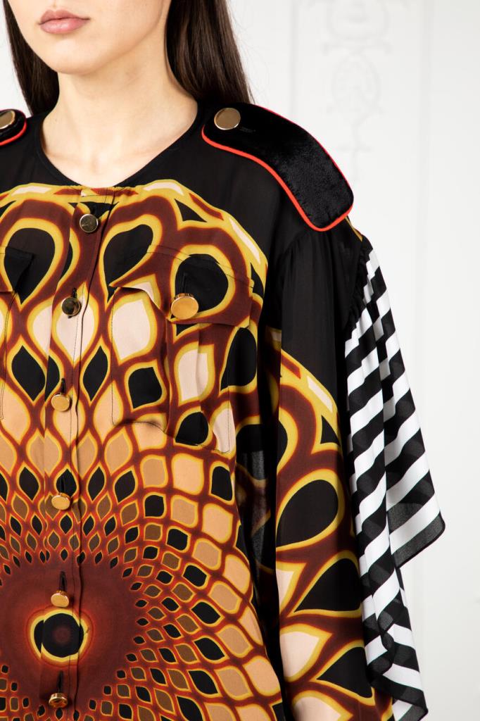 Стильная блуза от французской марки GIVENCHY. Изготовлена из натурального шелка. Материал лёгкий, прохладны, приятный на ощупь. Натуральный шелк – один из самых комфортных и ценных видов ткани. Он отлично впитывает влагу тела и быстро испаряет её, оставаясь сухим и комфортным. Этот материал также благотворно влияет на кожу. Модель подиумная, участвовавшая в показе, рамках парижской недели моды. Черного цвета с геометрическим рисунком в тёплых коричнево-бежевых тонах, свободного силуэта. С лёгкой тканью основы контрастируют погоны и отделка манжет, выполненные из плотной велюровой ткани ярко-красного цвета. Особого внимания заслуживает спинка необычного дизайнерского кроя. Очень стильная и необычная модель. Сочетается с брюками и джинсами из той же коллекции. Отлично будет смотреться с узкой юбкой или брюками-skinny.