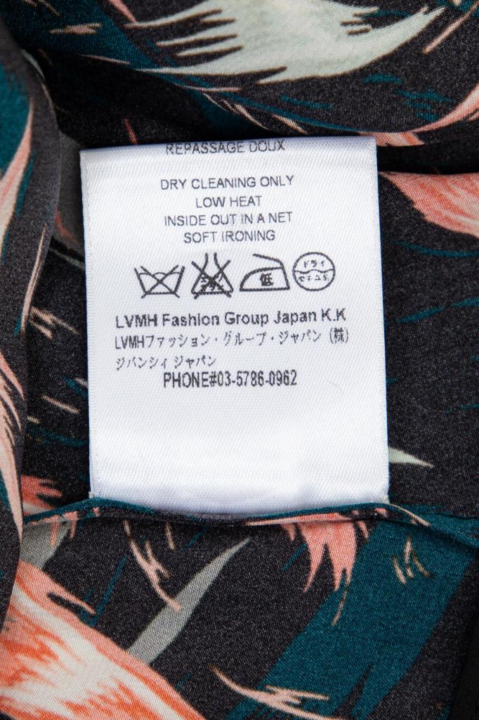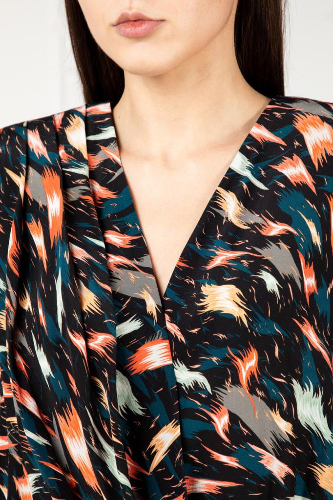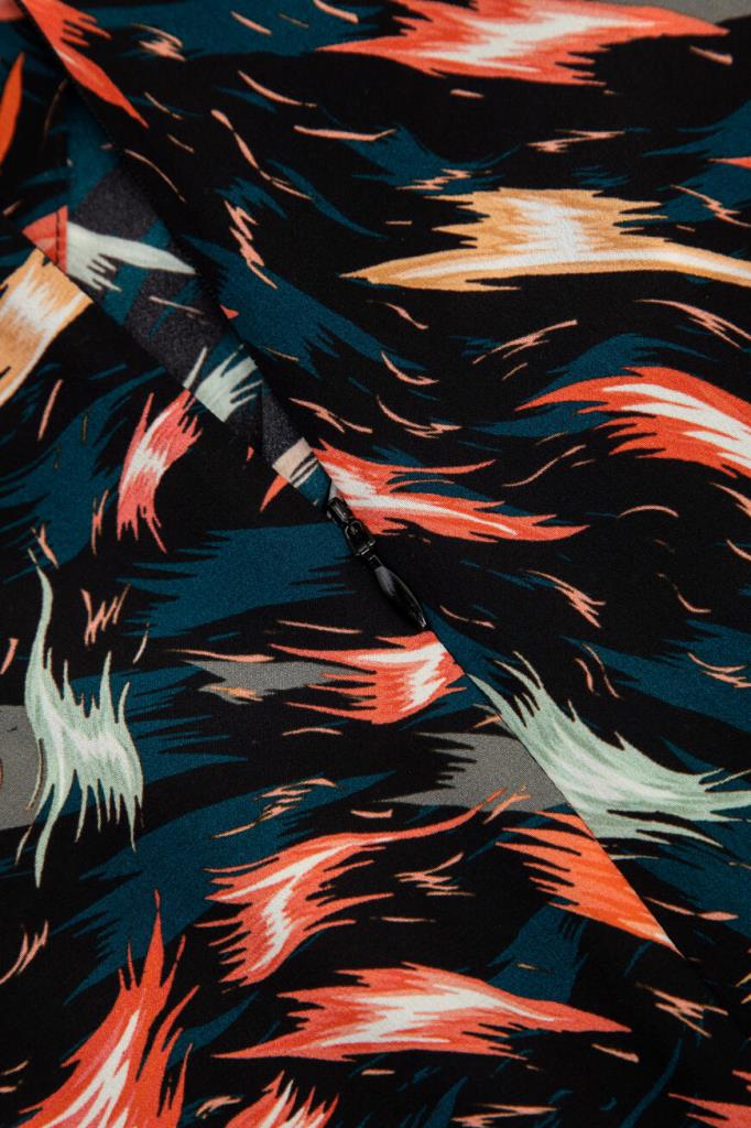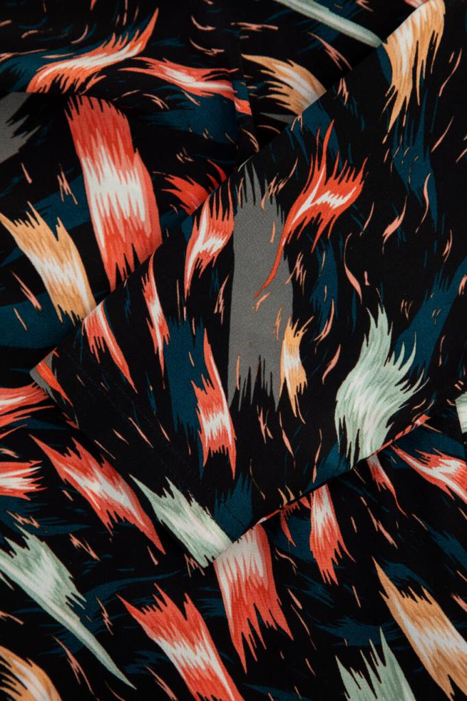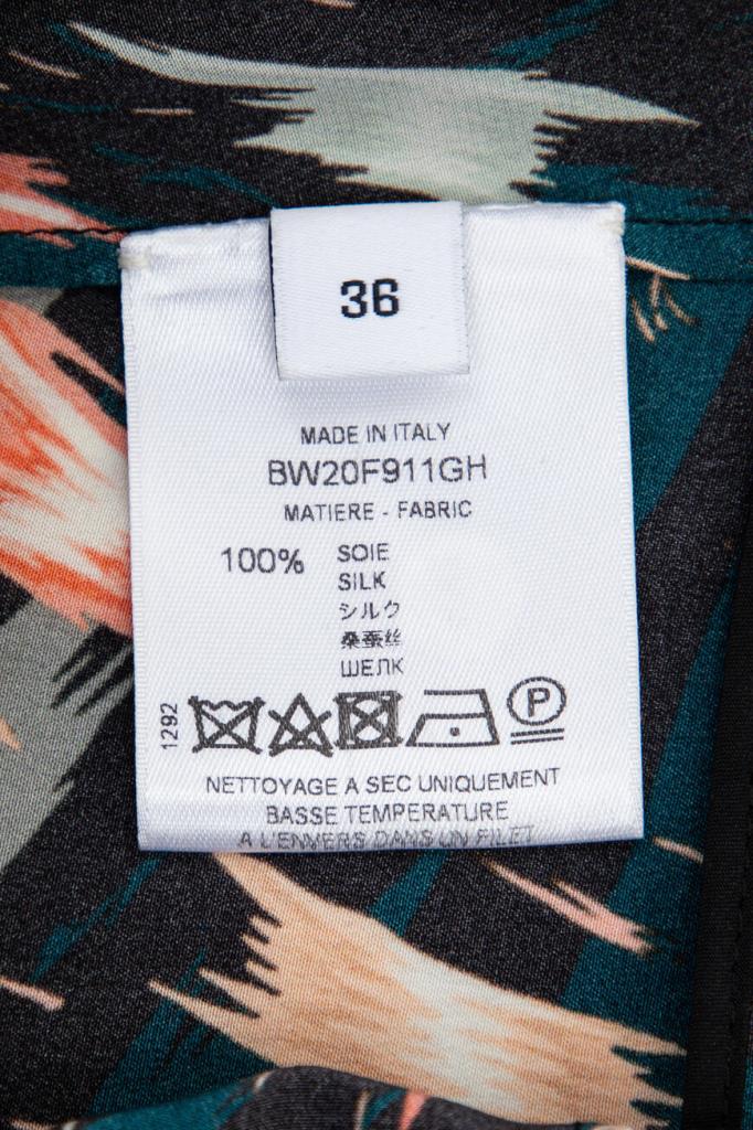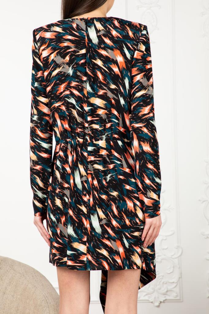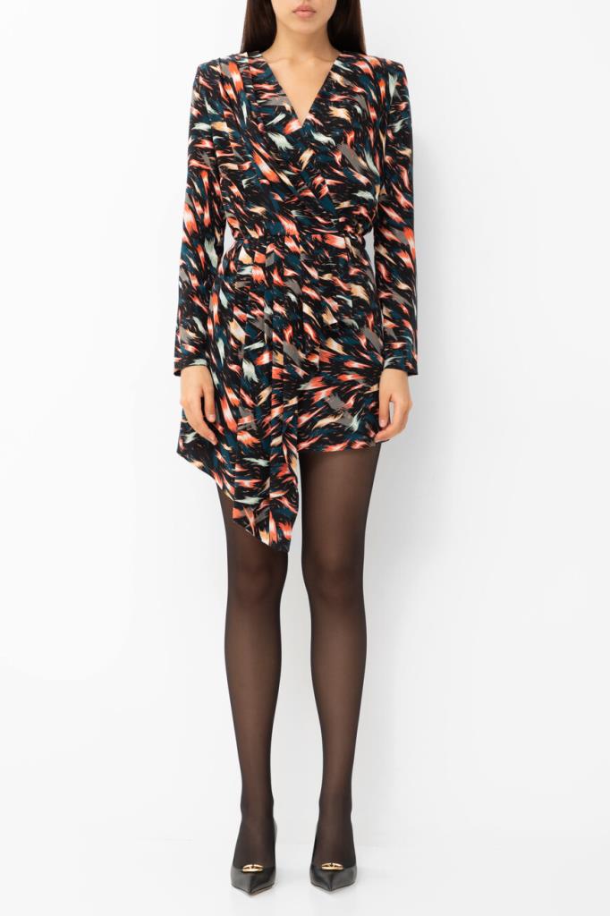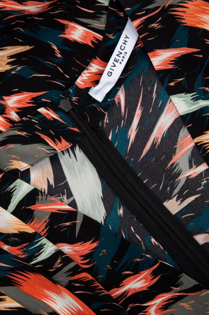 Лёгкое шелковое платье GIVENCHY черного цвета с контрастным абстрактным принтом. Модель приталенного кроя, с v-образным декольте, запАхом и дизайнерским асимметричным подолом.