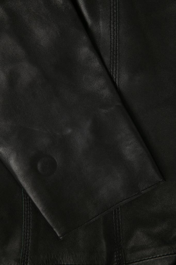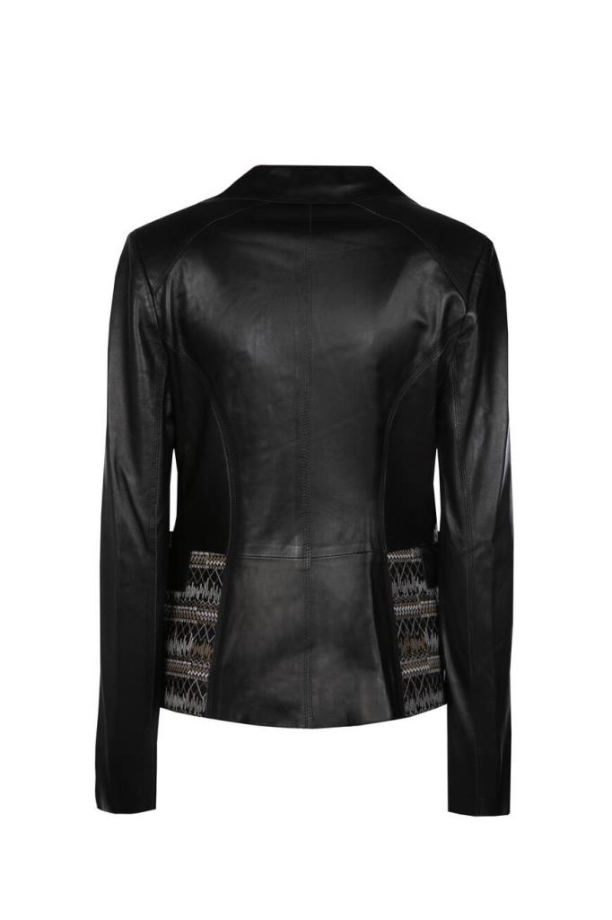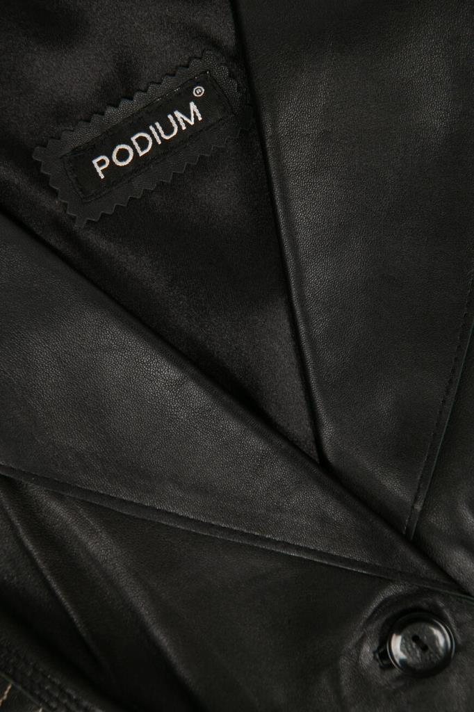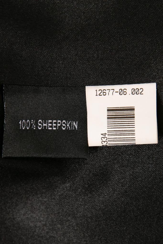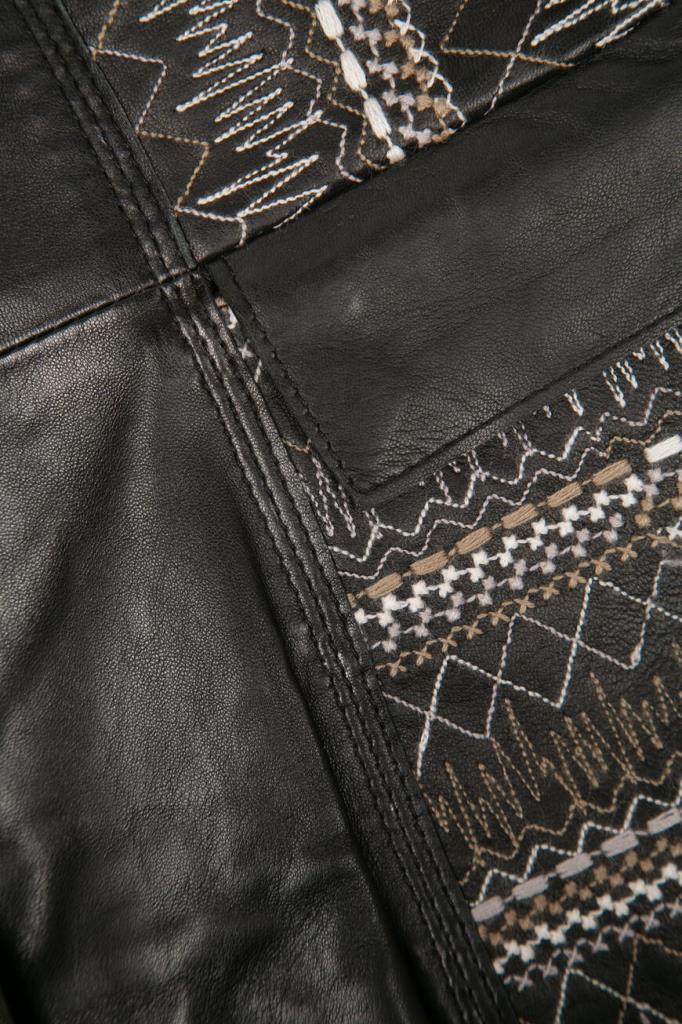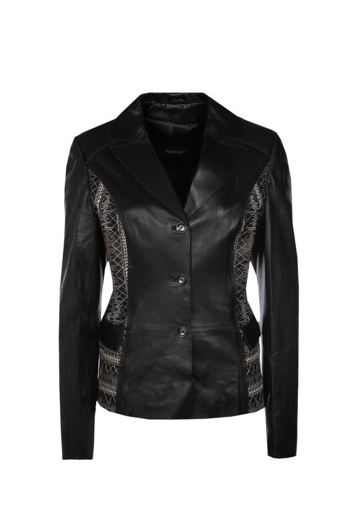 Шикарная женская куртка Podium из мягкой натуральной овчины чёрного цвета с эффектными дизайнерскими вставками с оригинальной контрастной разноцветной геометрической вышивкой по бокам.