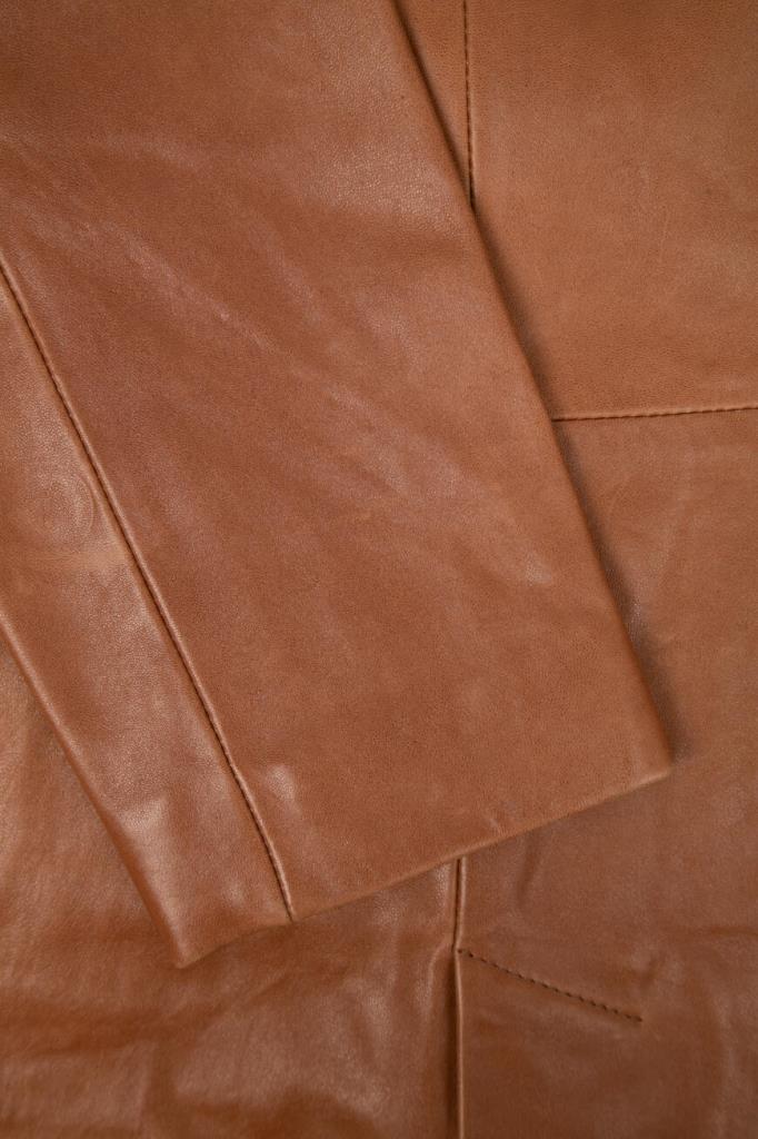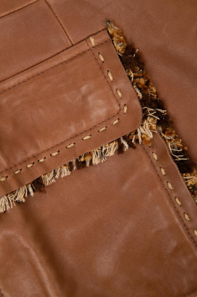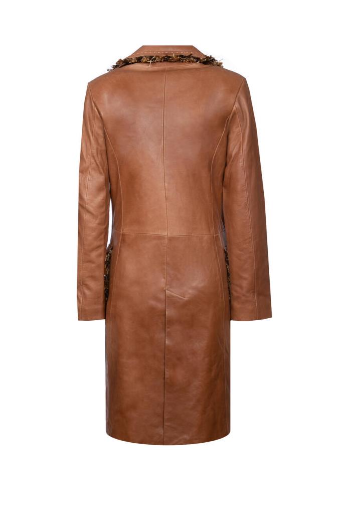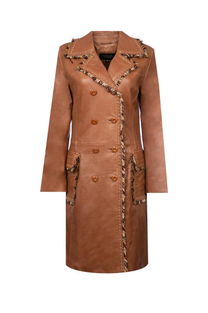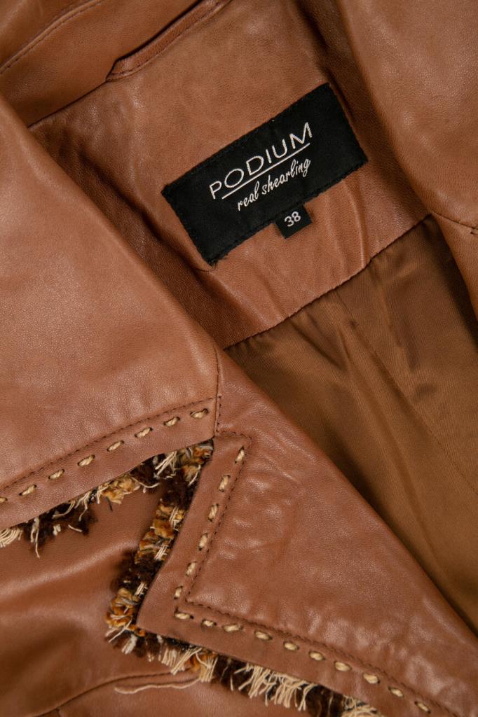 Роскошное женское пальто-френч Podium из мягкой натуральной овчины коричневого цвета с оригинальной контрастной разноцветной бахромой по всей поверхности изделия (обрамляет воротник, лацканы, застёжку и карманы).