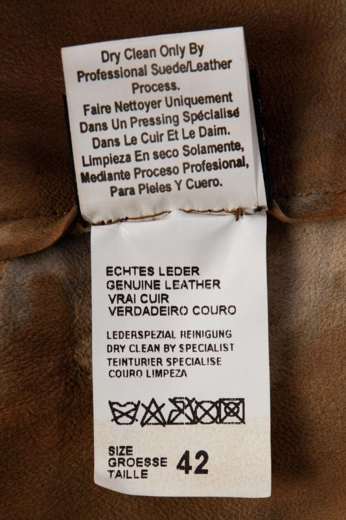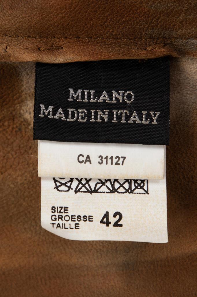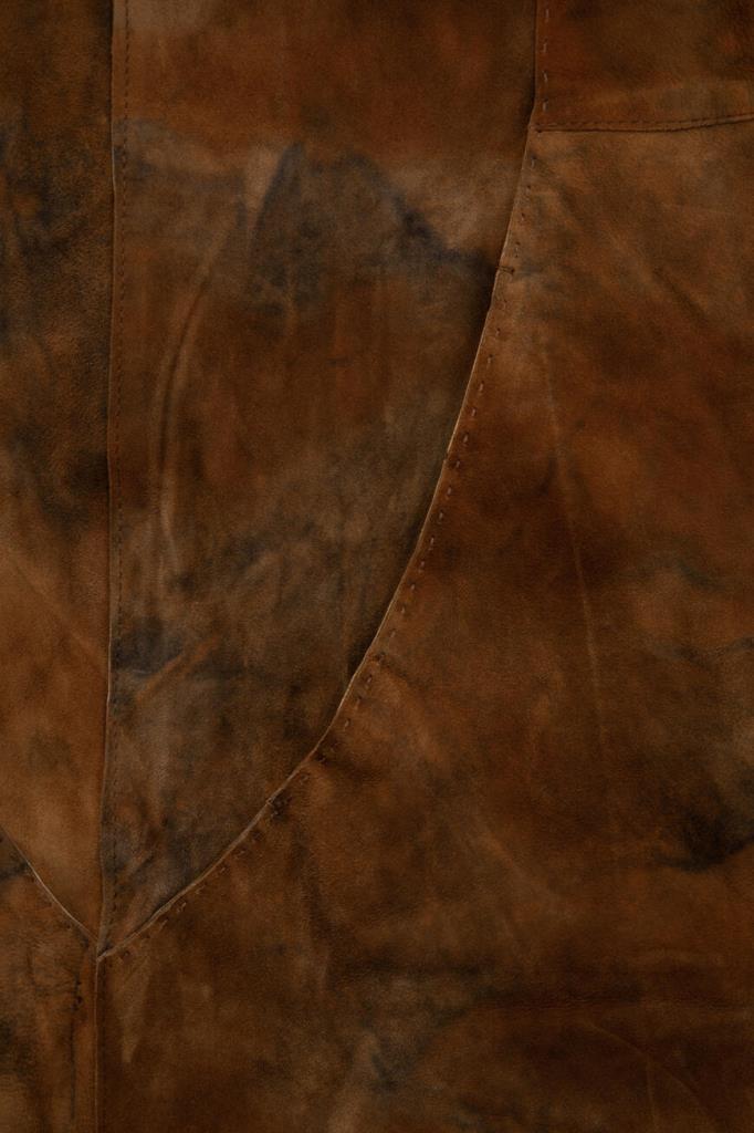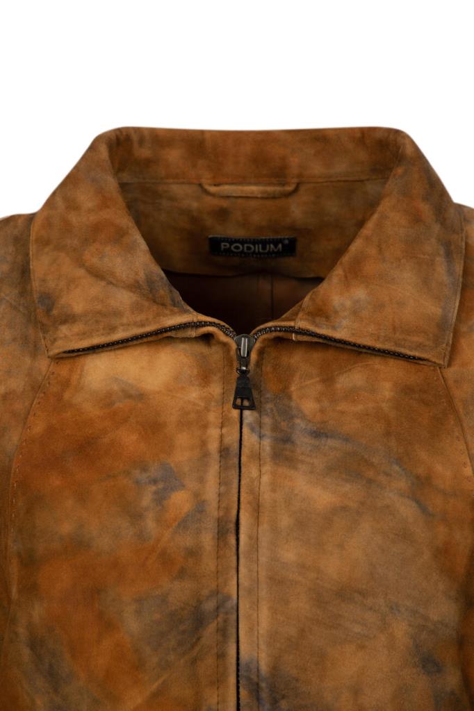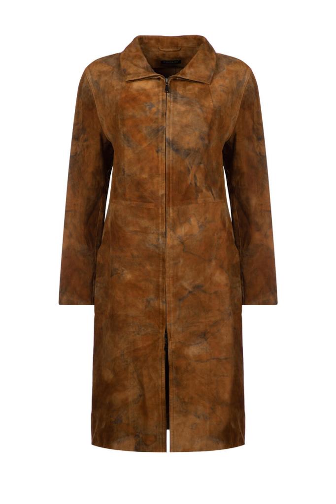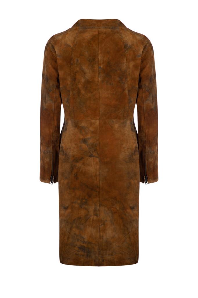 Роскошное женское пальто Podium из мягкой натуральной телячьей кожи коричневого оттенка с эффектным неоднородным серым узором по всей поверхности изделия.