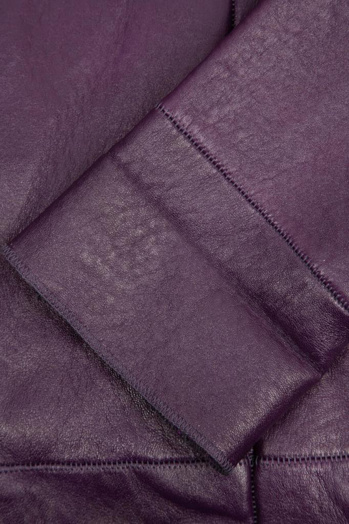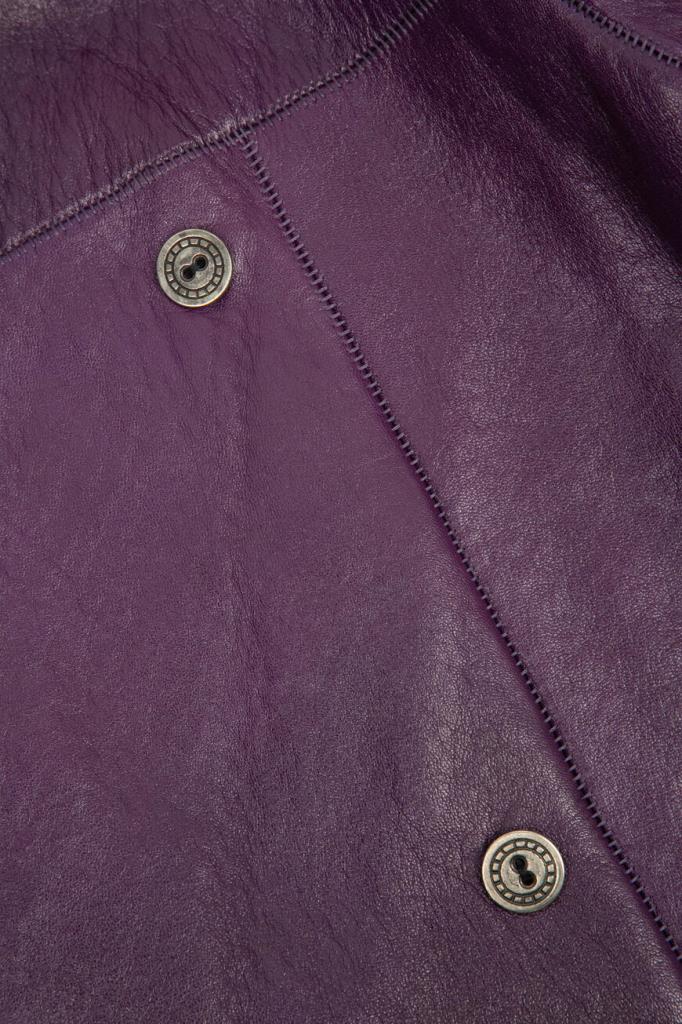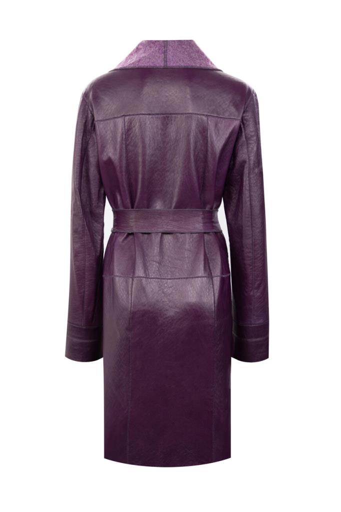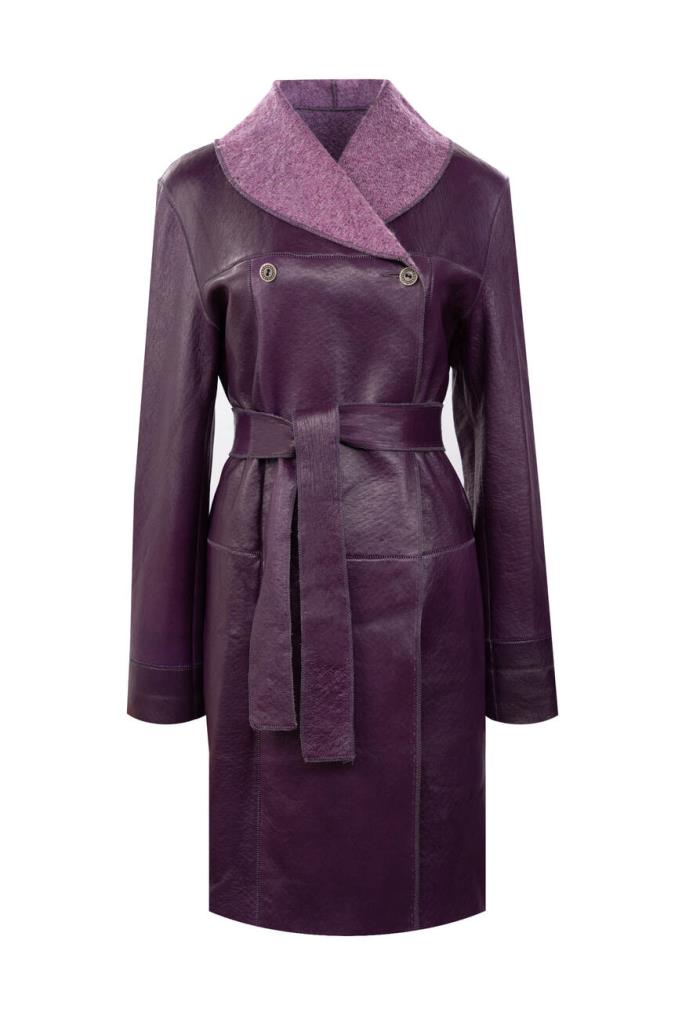 Шикарное женское пальто-френч Podium выполнено из мягкой натуральной телячьей кожи изысканного насыщенного фиолетового оттенка и дополнено контрастным воротником с оригинальным разноцветным меланжевым узором.