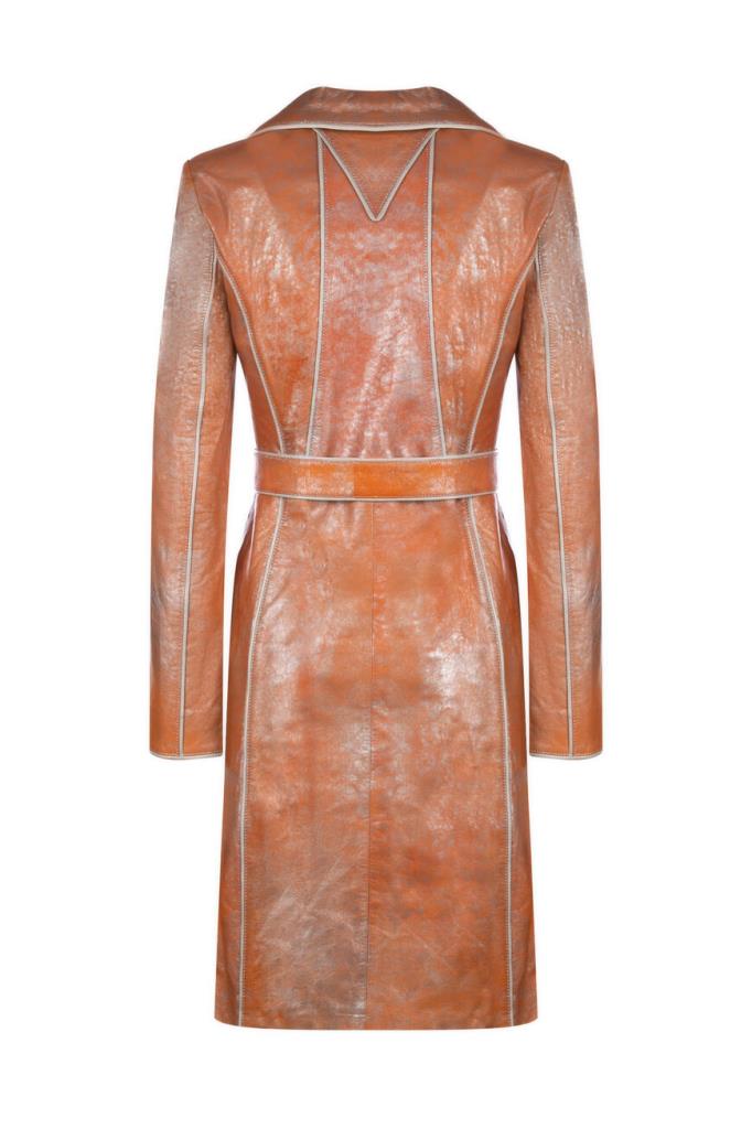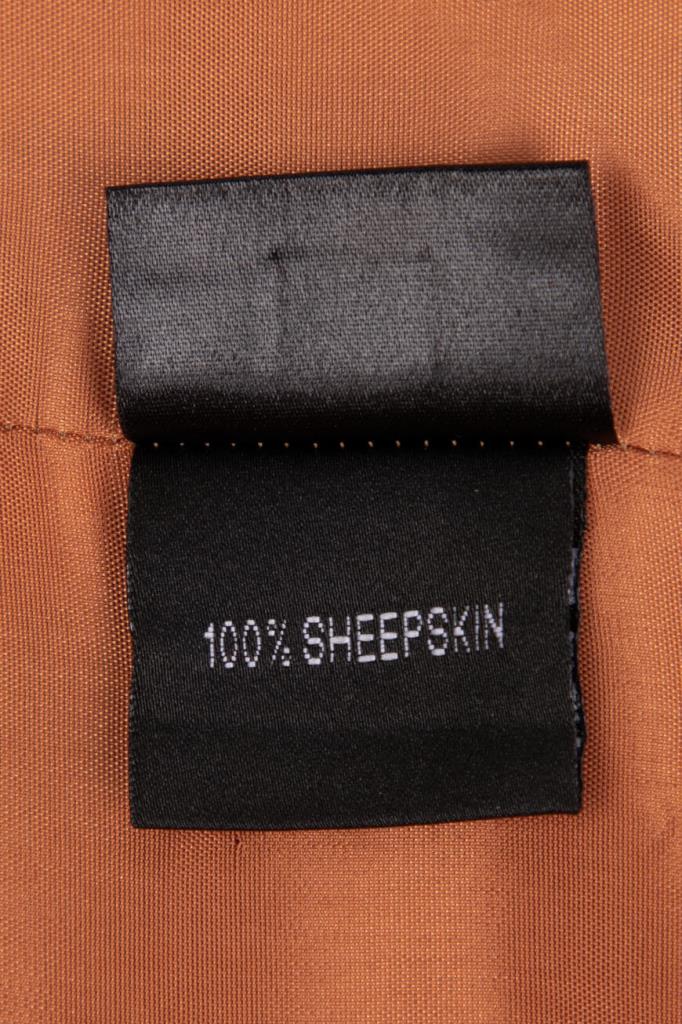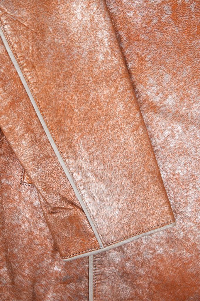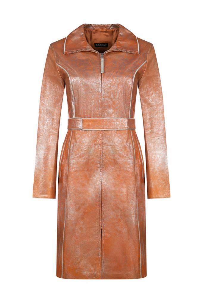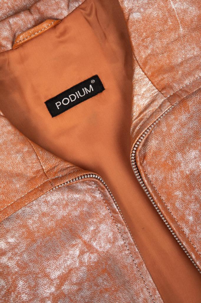Роскошное женское пальто-френч от бренда Podium выполнено из мягкой натуральной овчины изысканного оранжевого оттенка с эффектным неоднородным серебристым узором и дополнено контрастной белой отделкой-окантовкой по всей поверхности изделия.