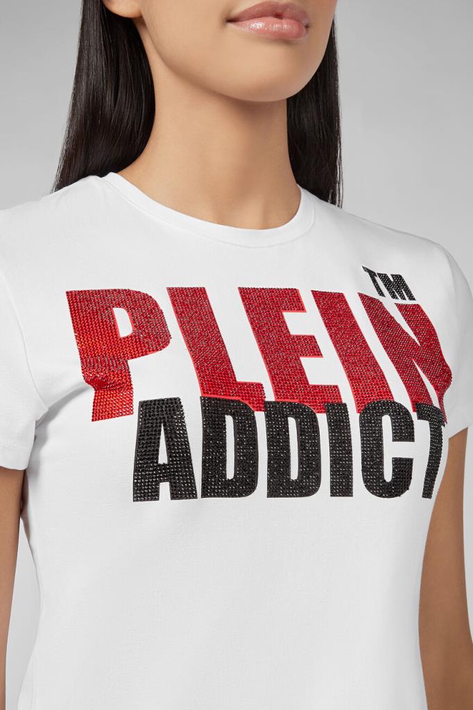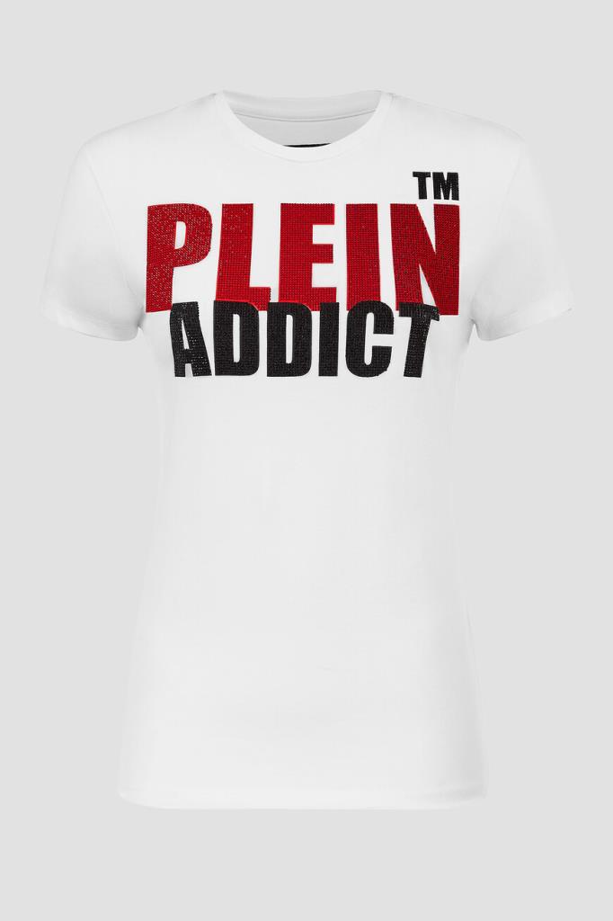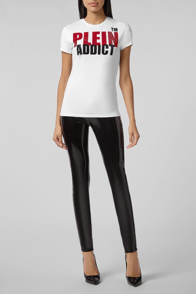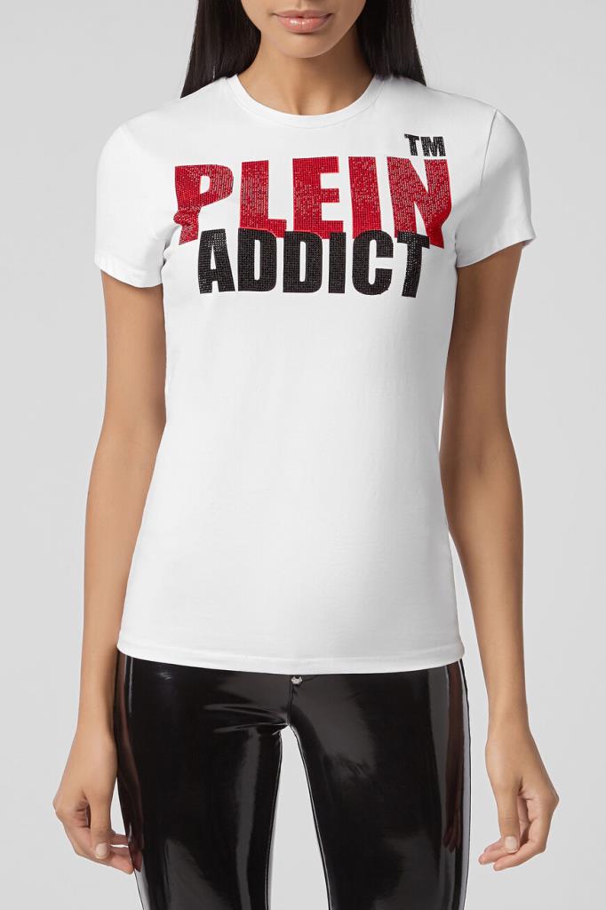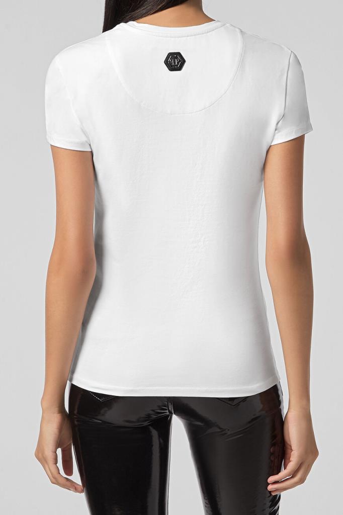 Женская облегающая футболка Philipp Plein из лёгкого хлопкового джерси белого цвета с контрастным принтом-лого, украшенным стразами. Кожаный шестигранник с лого на спинке под воротником.