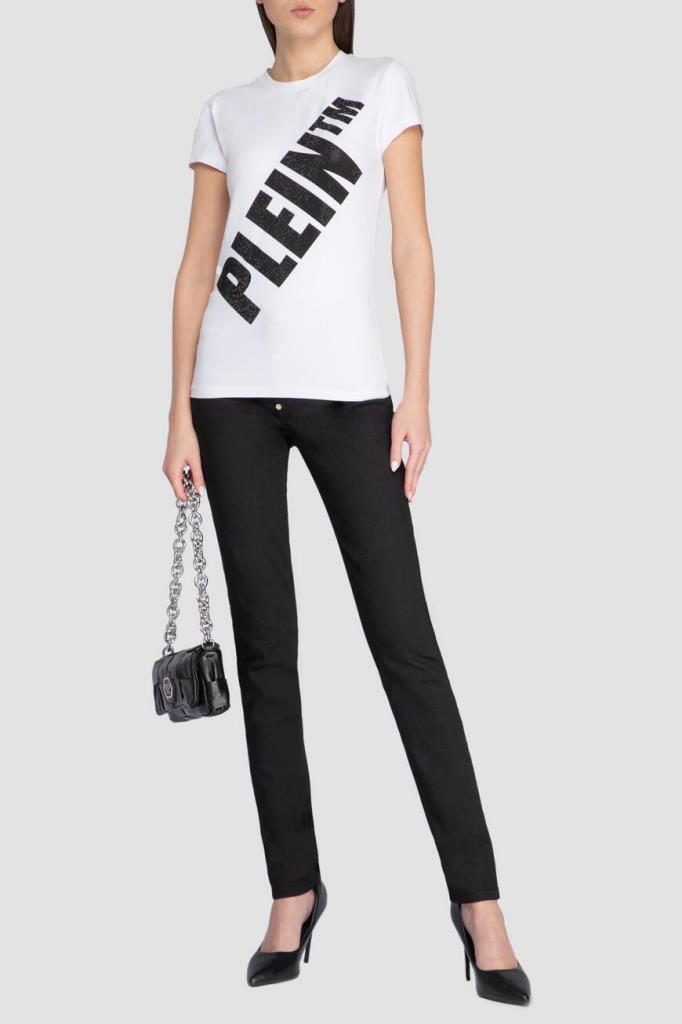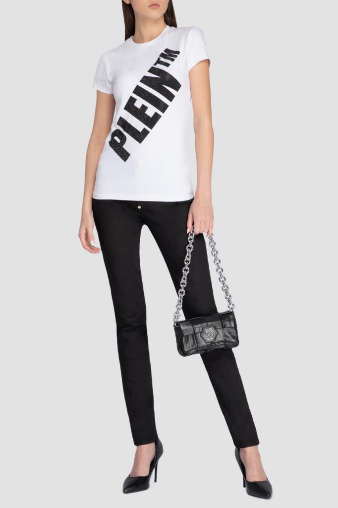 Женская футболка Philipp Plein из мягкого белого трикотажа. Модель прямого кроя, с короткими рукавами. Грудь и спинку украшает принт-лого из чёрных страз. На спинке под воротником - фирменный кожаный лейбл с металлическим лого.