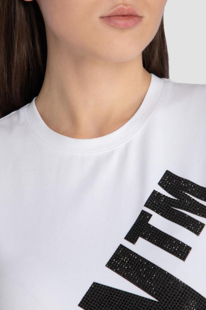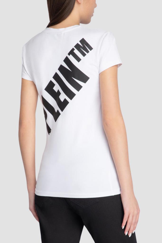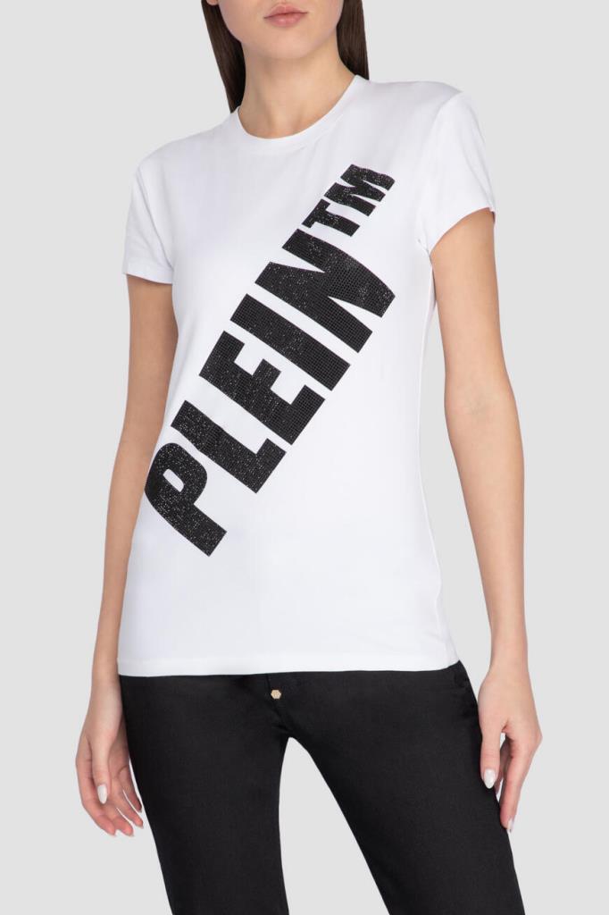 Женская футболка Philipp Plein из мягкого белого трикотажа. Модель прямого кроя, с короткими рукавами. Грудь и спинку украшает принт-лого из чёрных страз. На спинке под воротником - фирменный кожаный лейбл с металлическим лого.