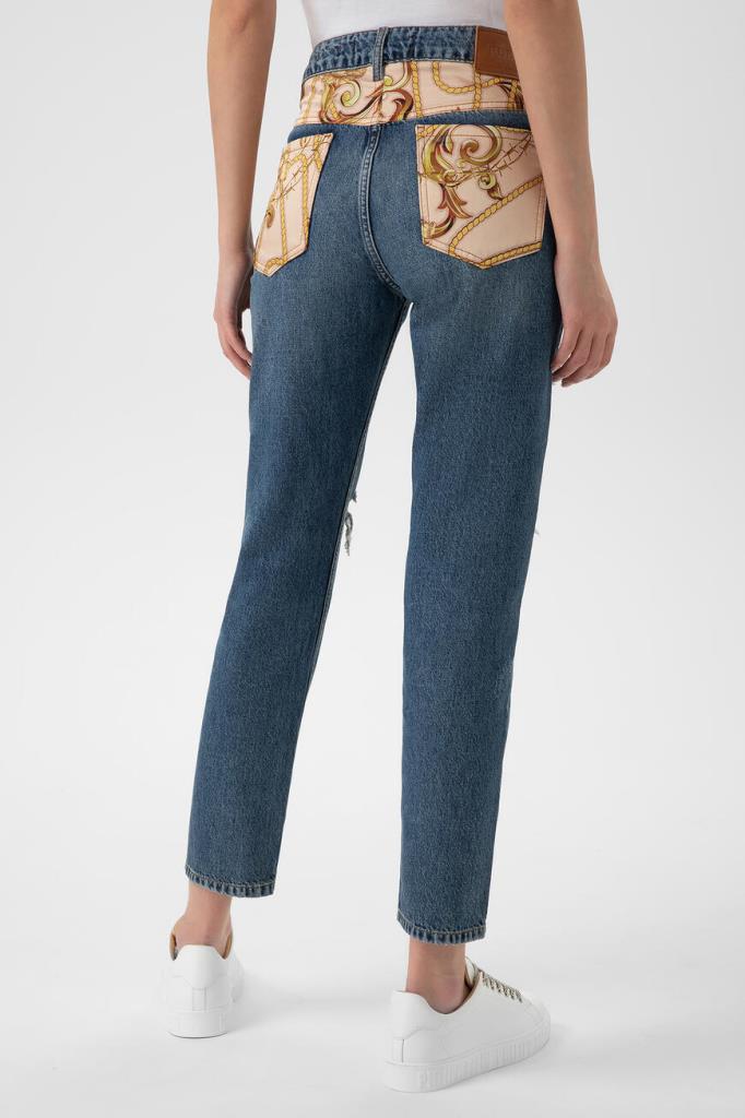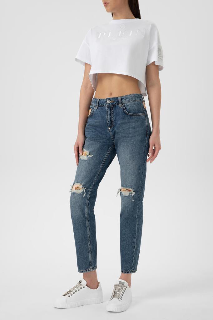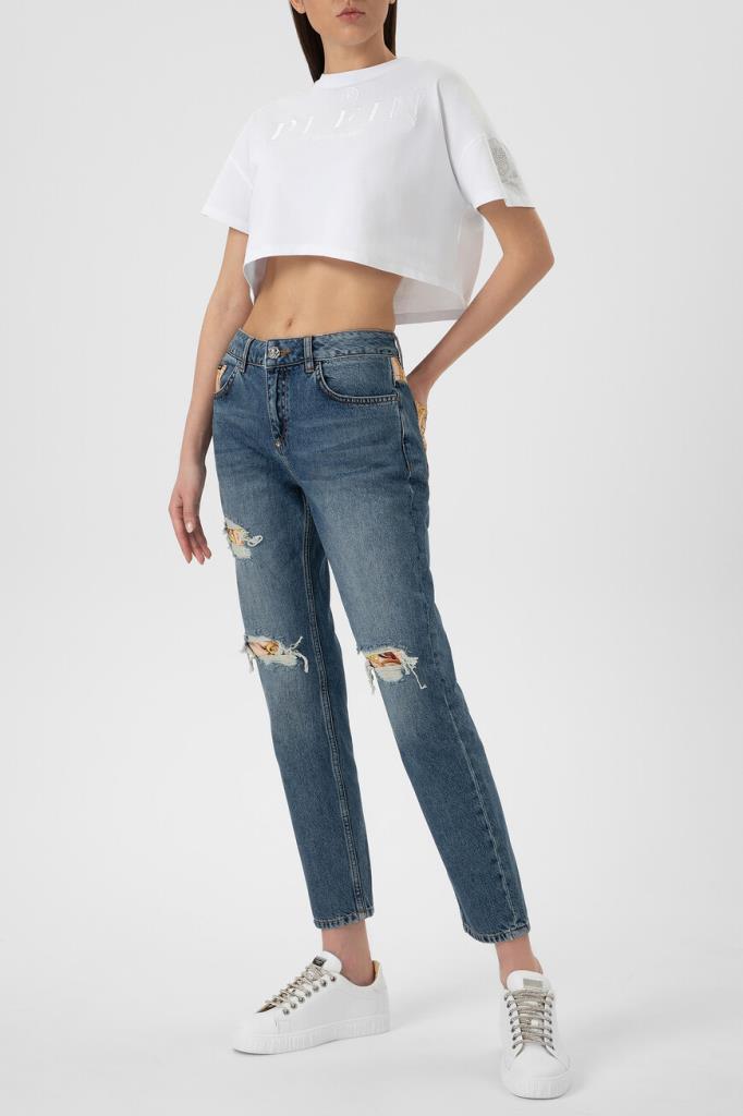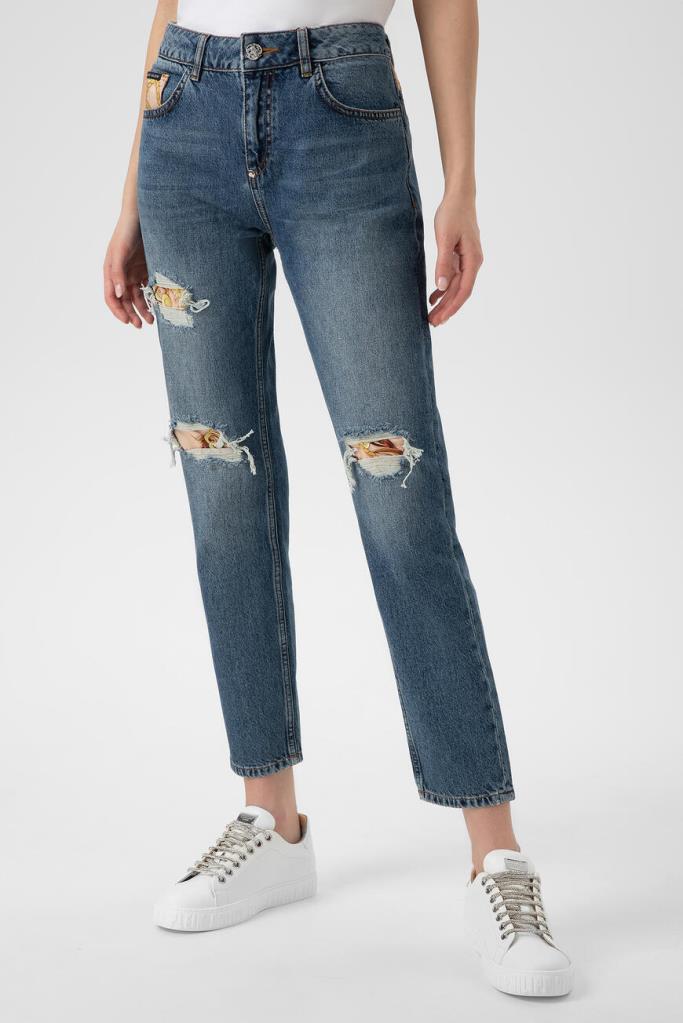 Женские джинсы-бойфренды Philipp Plein из мягкого хлопкового денима изысканного голубого оттенка с эффектными дизайнерскими потёртостями и разрывами. Ультрамодная модель комфортного свободного кроя, с плотным поясом со шлевками под ремень, удобной застёжкой на молнию и крупную фирменную металлическую пуговицу, контрастной оранжевой прострочкой по всей поверхности изделия и традиционными джинсовыми карманами. На поясе сзади красуется контрастная коричневая кожаная нашивка с фирменным логотипом бренда и тремя нитями в цвет итальянского флага сбоку. Изделие также дополнено оригинальными разноцветными контрастными вставками в стиле «Новое барокко» по всей поверхности и голубой подкладкой из мягкого трикотажа на основе хлопка и прочного синтетического износостойкого материала.