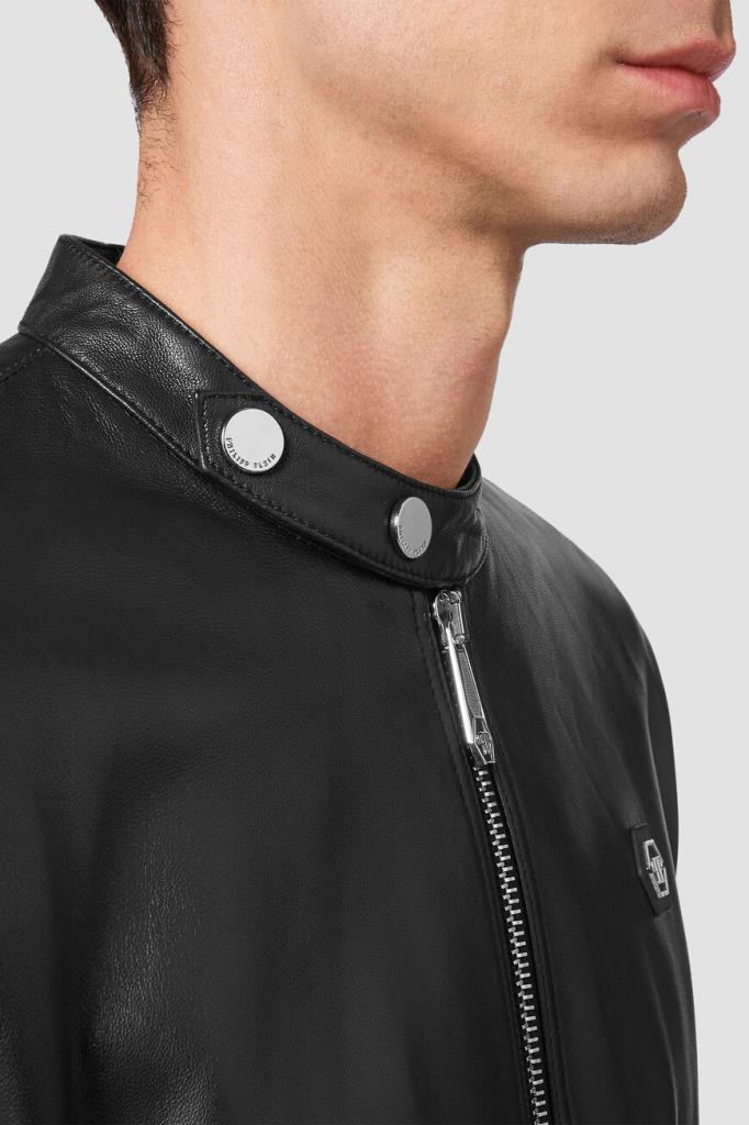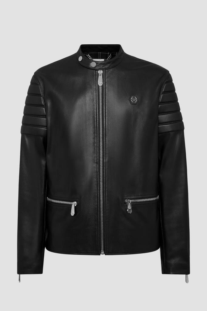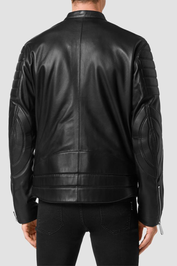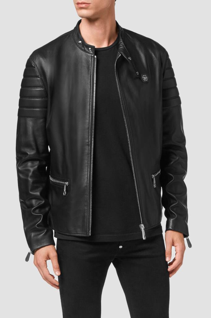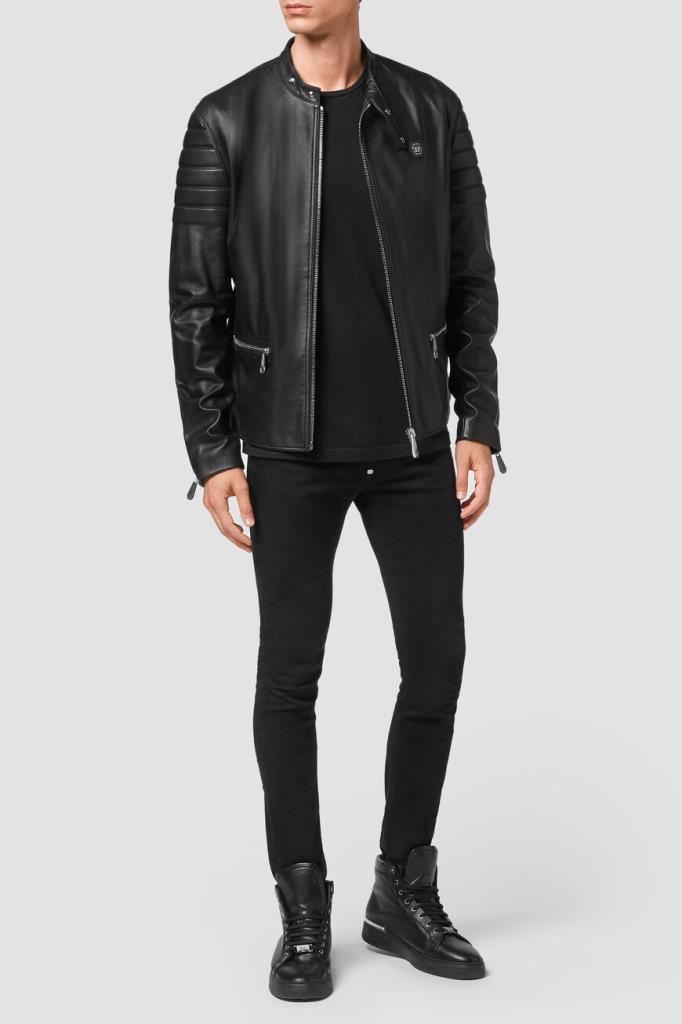 Эффектная мужская байкерская куртка-жакет от бренда Philipp Plein выполнена из мягкой натуральной гладкой кожи наппа универсального чёрного цвета с лёгким глянцевым отливом и оригинальными рельефными стёгаными вставками-отделкой в складку («гармошкой») на рукавах и спинке снизу. Роскошная модель комфортного прямого кроя, с длинными рукавами с манжетами на молнии, невысоким воротником-стойкой на клёпках спереди, двумя прорезными карманами на молнии по бокам, удобной застёжкой на молнию с фирменным брендированным бегунком и ассиметричным низом (передняя часть немного короче задней). Слева на груди красуется нашивка из сафьяновой кожи PP Hexagon с серебристой металлической вставкой с фирменной монограммой бренда. Фишки изделия: контрастная разноцветная принтованная внутренняя подкладка и наполнитель на основе прочного синтетического износостойкого материала.