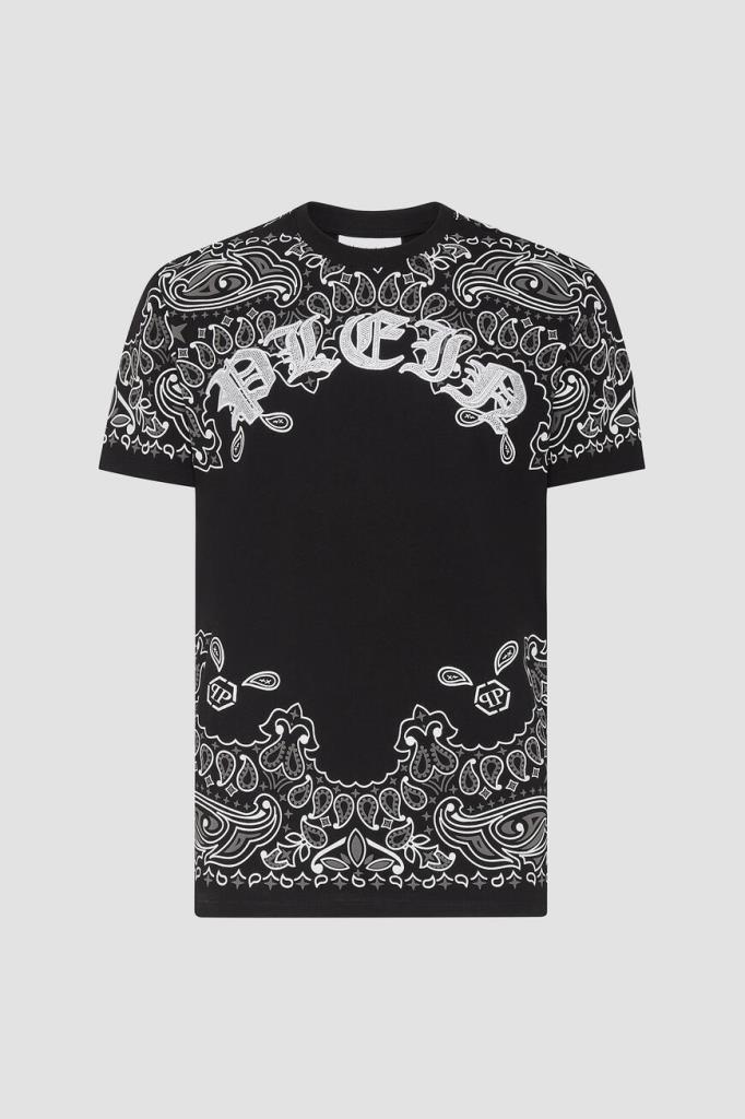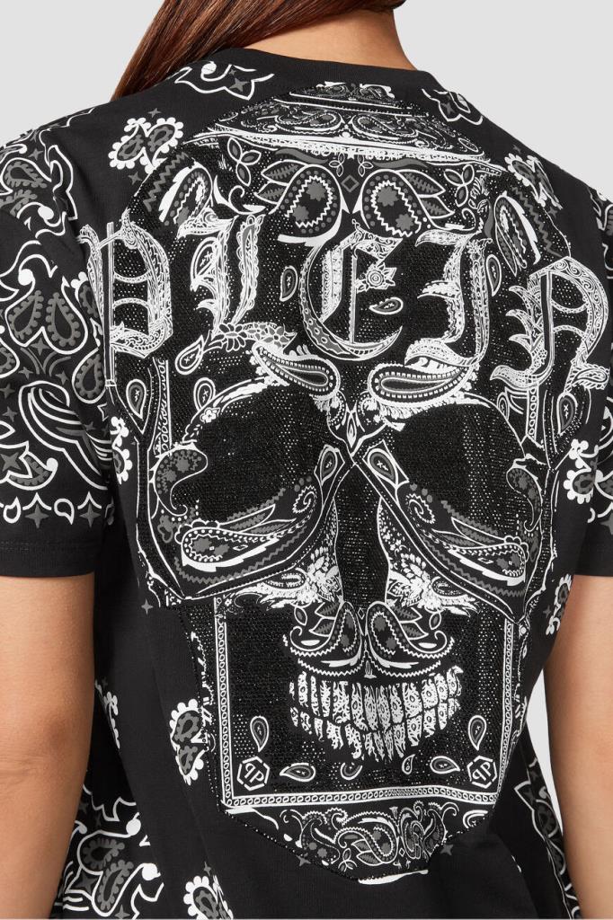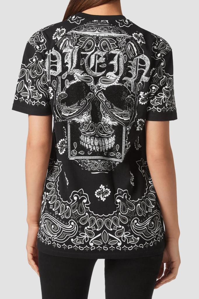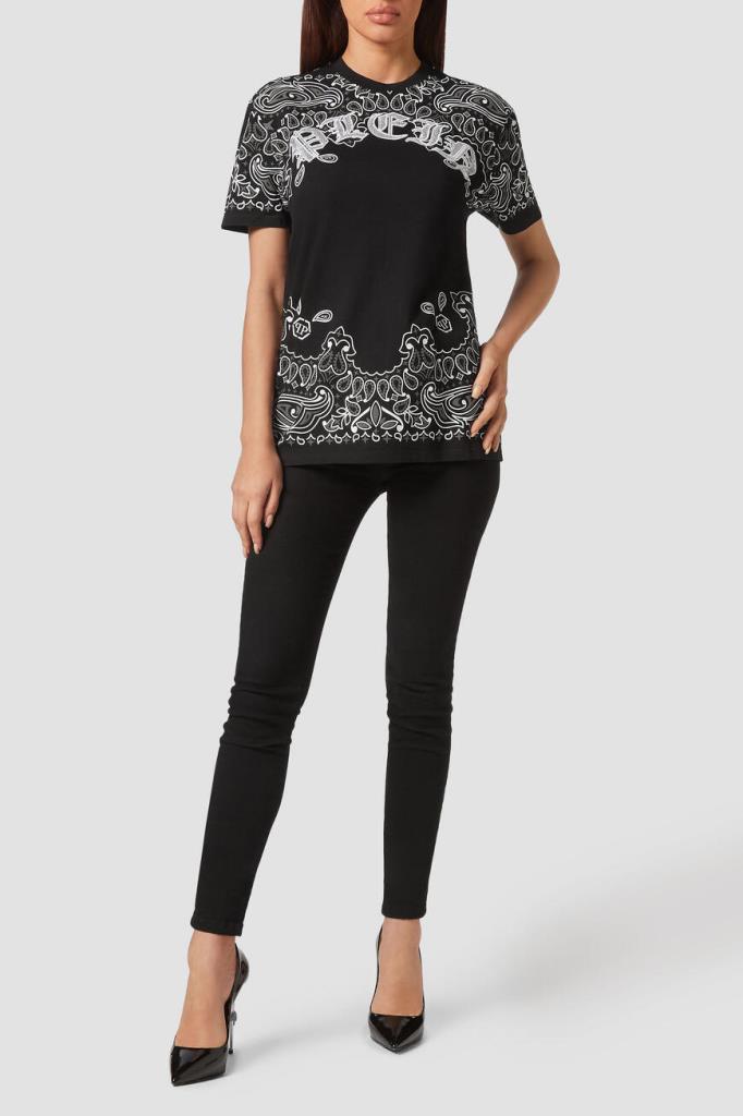 Футболка Philipp Plein из мягкого хлопкового трикотажа чёрного цвета. Модель украшена дизайнерским орнаментом пейсли в бело-серой гамме. Декор: изображение культового черепа с отделкой из блестящих переливающихся кристаллов сзади.