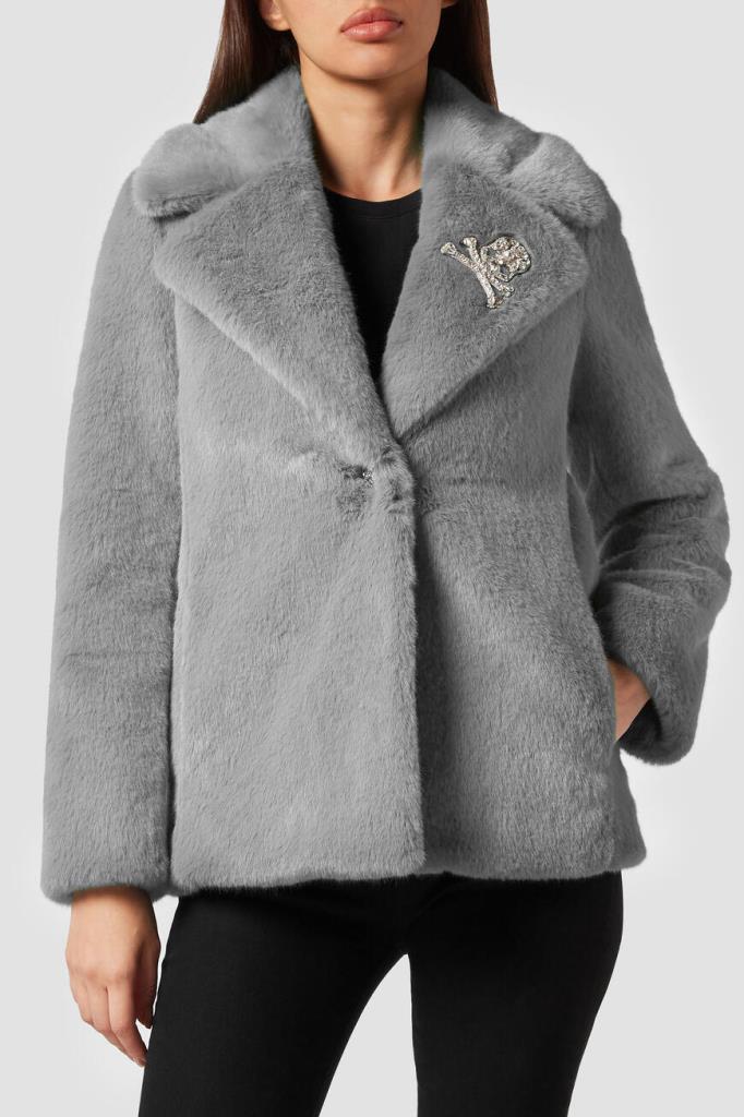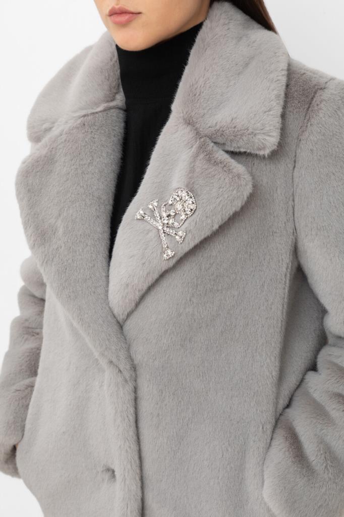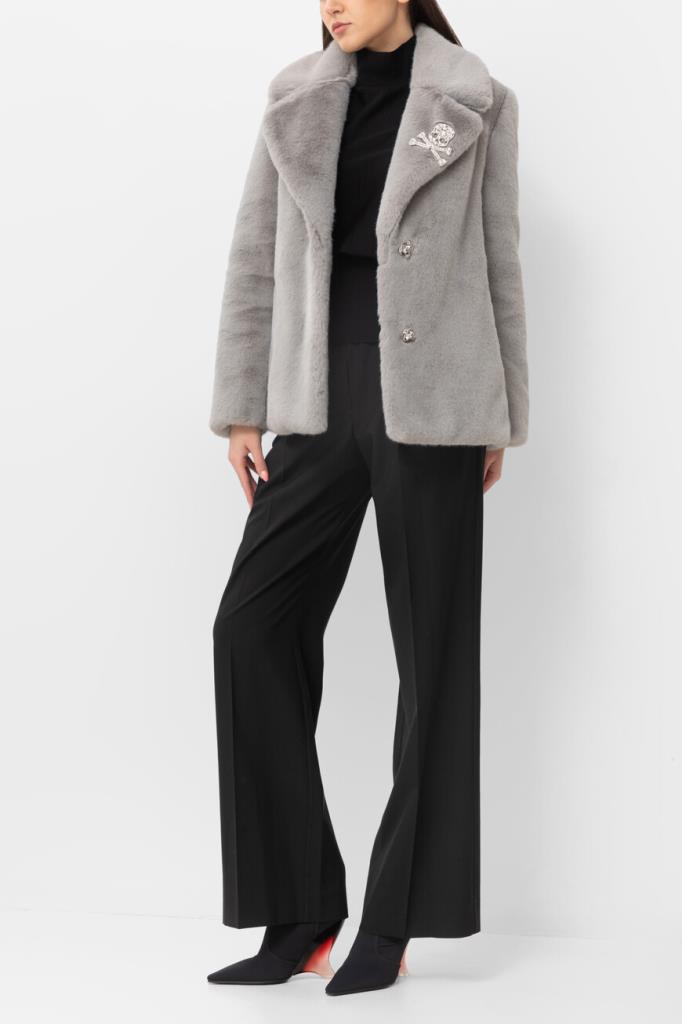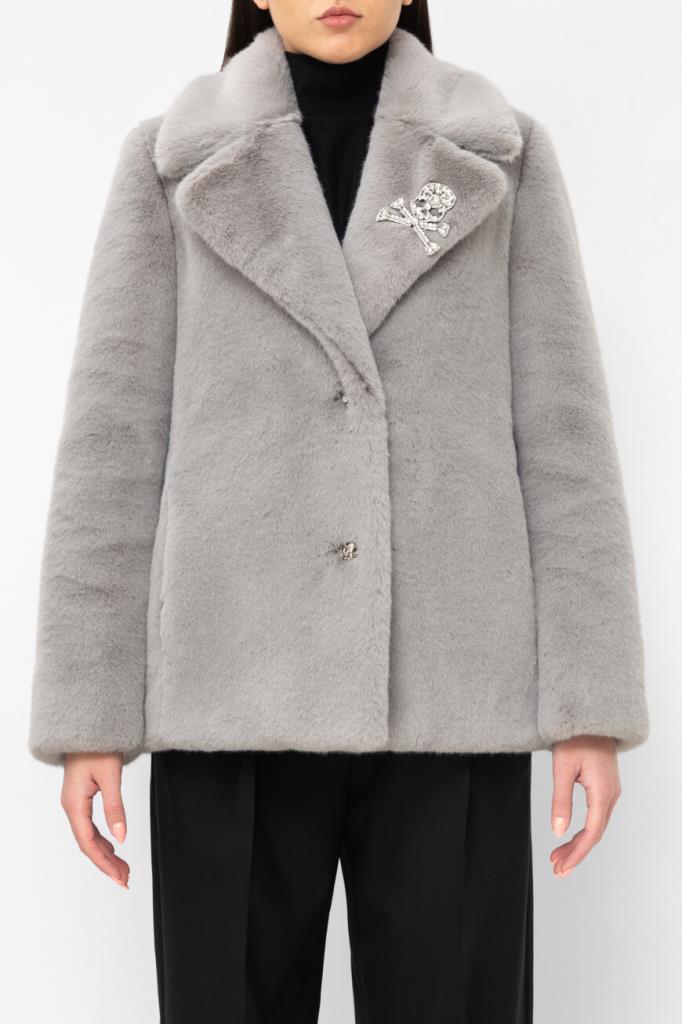 Короткое серое пальто PHILIPP PLEIN из экомеха под норку. Фишки изделия: леопардовая подкладка на основе прочного износостойкого материала и аппликация в виде крупного блестящего черепа из переливающихся стразов слева на воротнике.