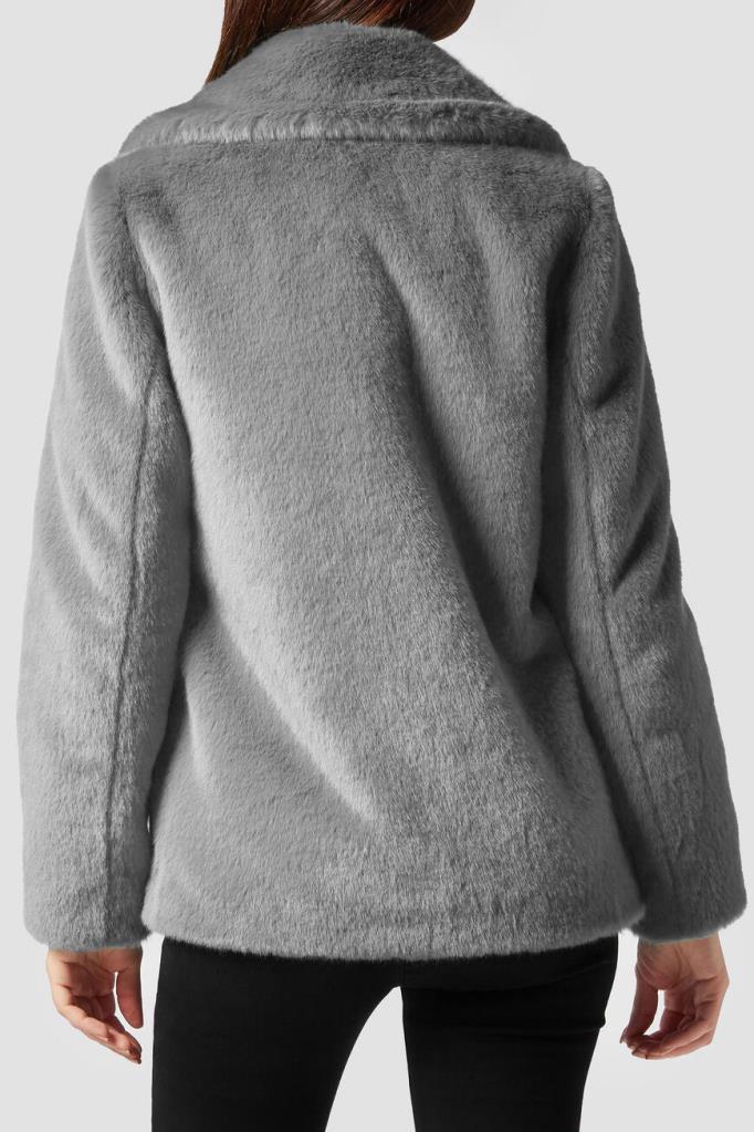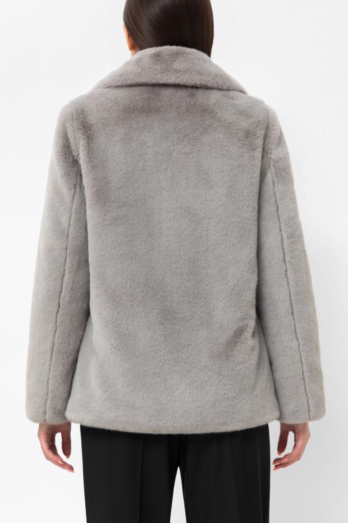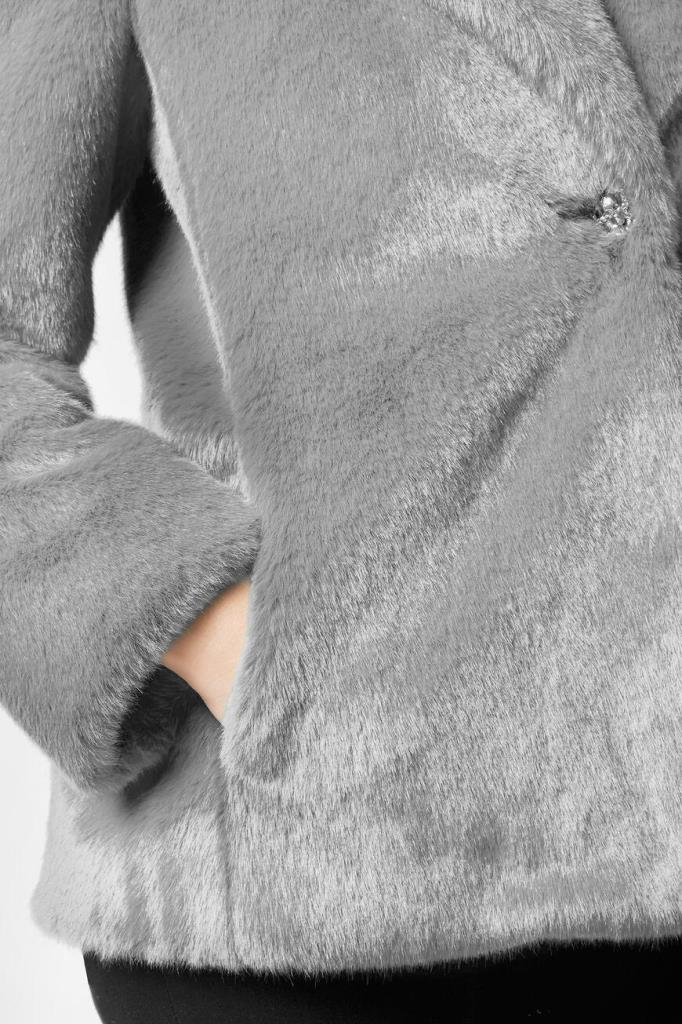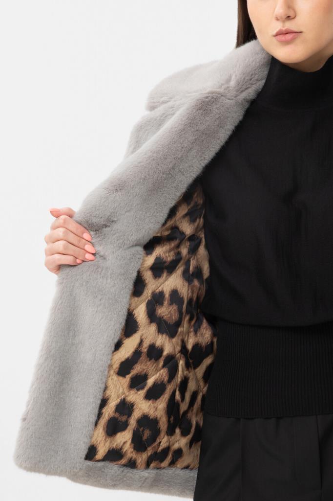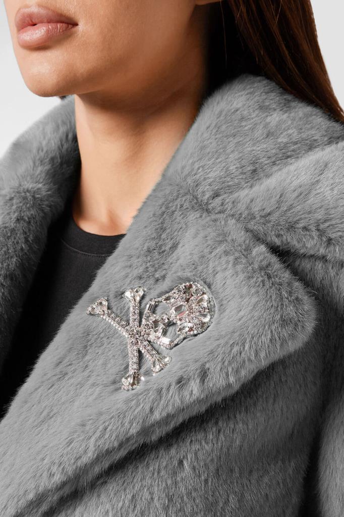 Короткое серое пальто PHILIPP PLEIN из экомеха под норку. Фишки изделия: леопардовая подкладка на основе прочного износостойкого материала и аппликация в виде крупного блестящего черепа из переливающихся стразов слева на воротнике.