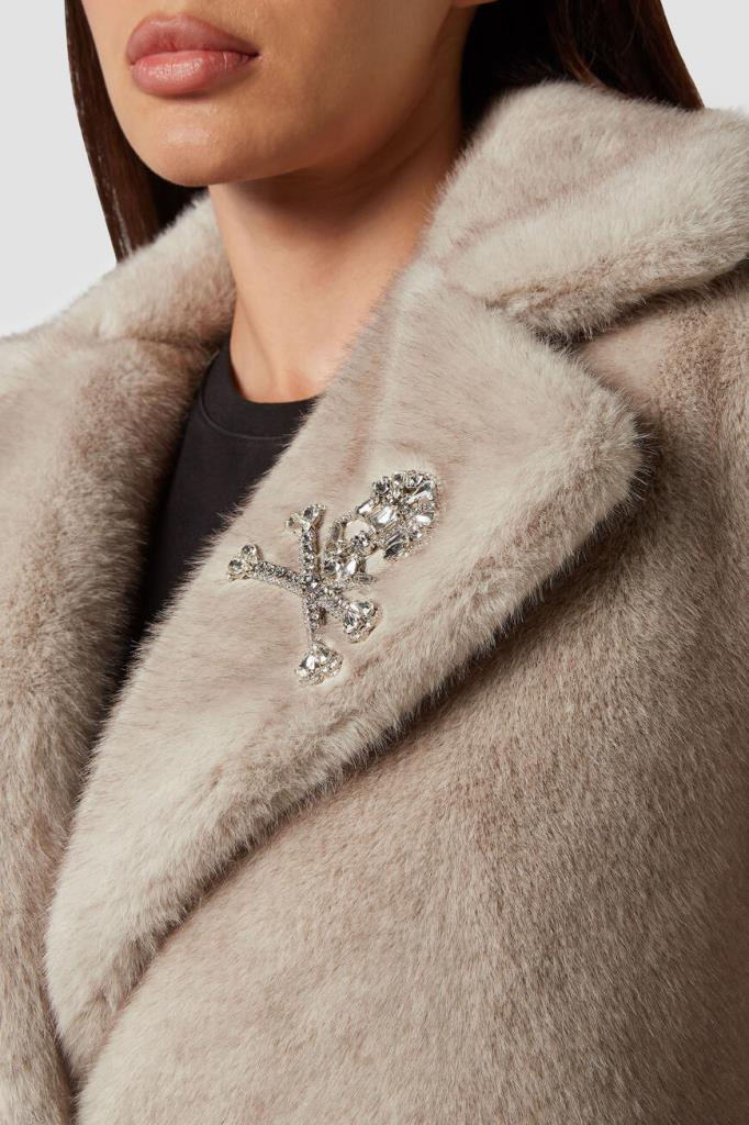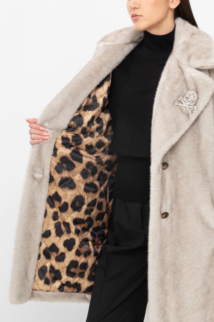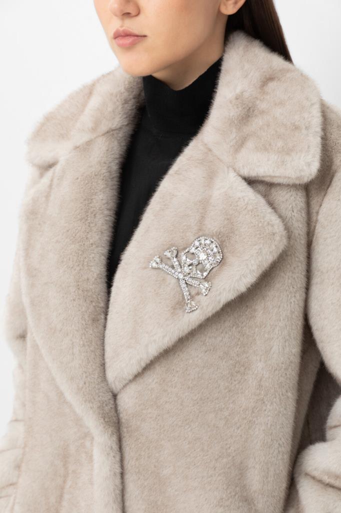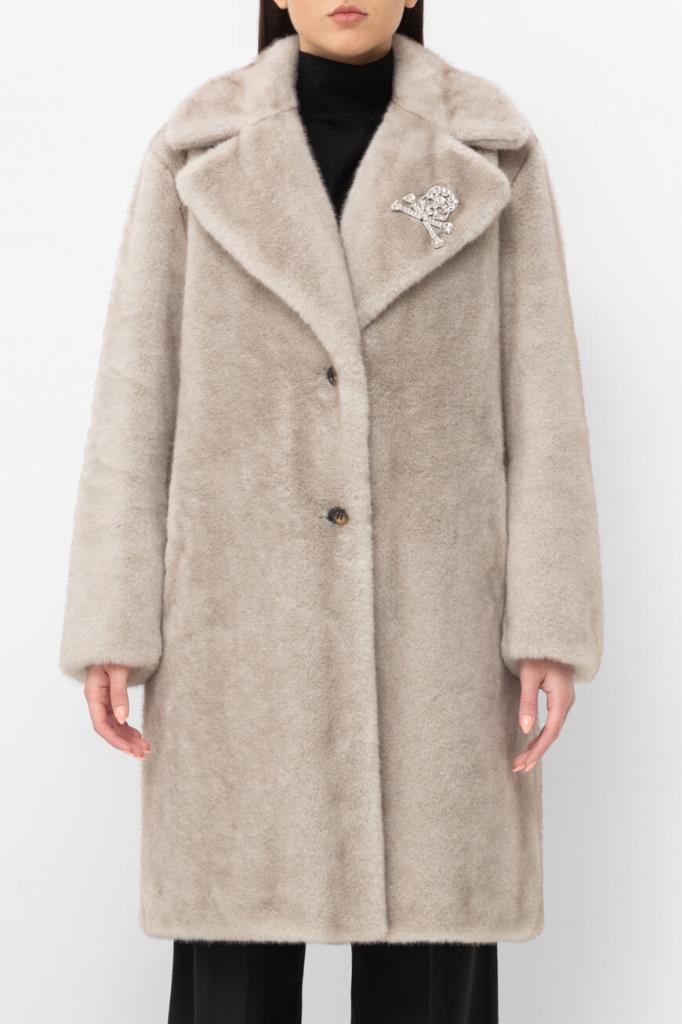 Пальто PHILIPP PLEIN из искусственного меха под норку серого оттенка. Элегантная модель прямого кроя украшена крупным блестящим черепом из переливающихся стразов слева на воротнике.