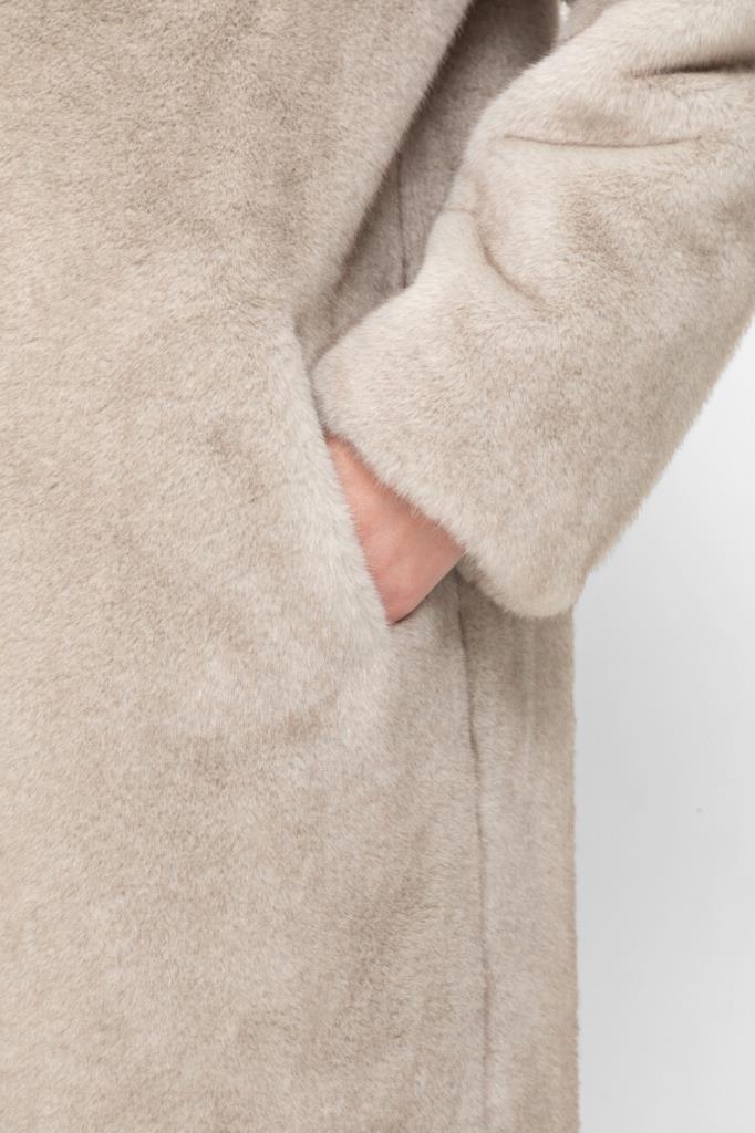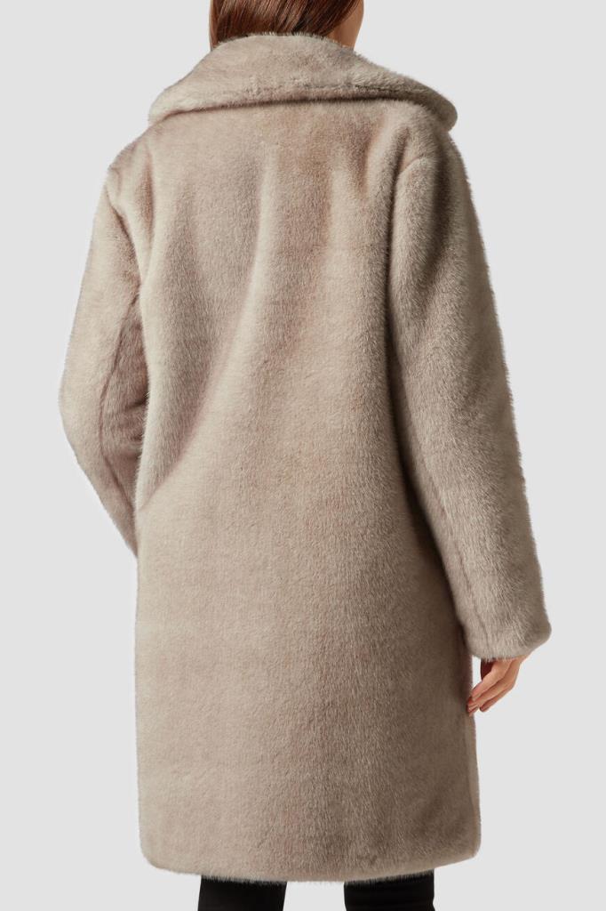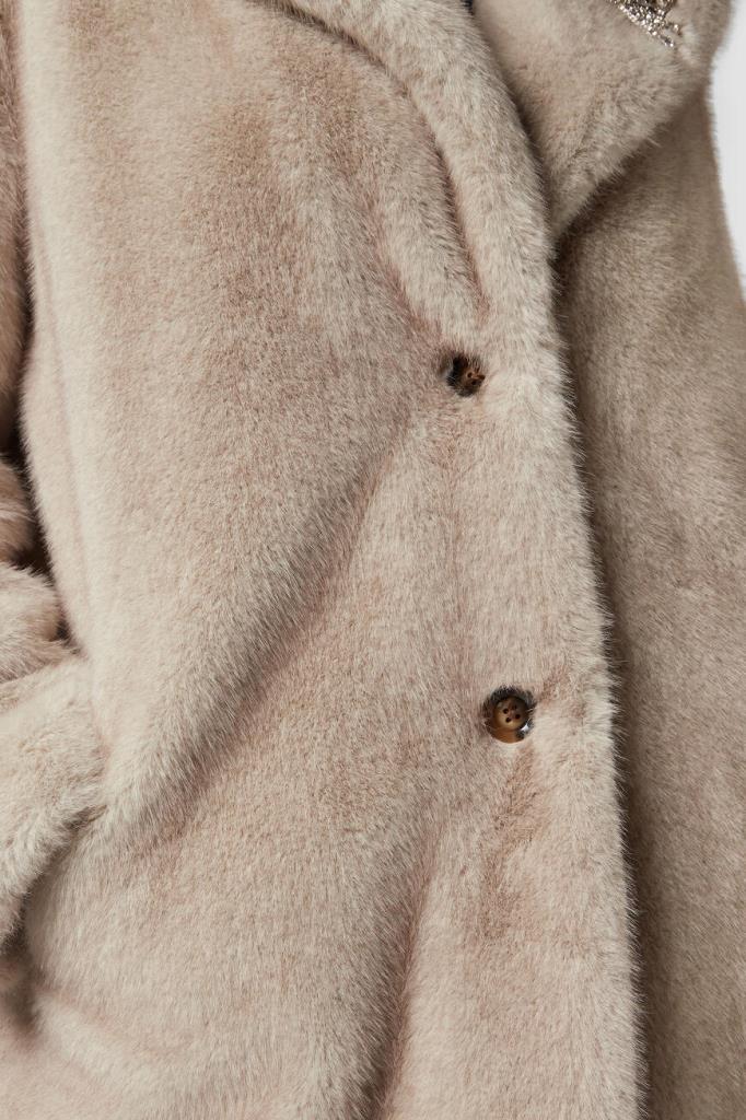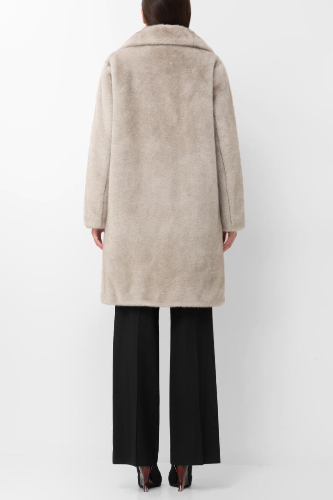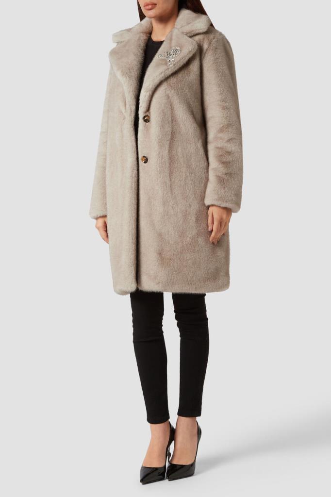 Пальто PHILIPP PLEIN из искусственного меха под норку серого оттенка. Элегантная модель прямого кроя украшена крупным блестящим черепом из переливающихся стразов слева на воротнике.