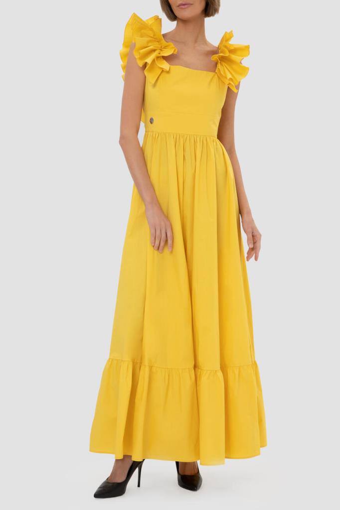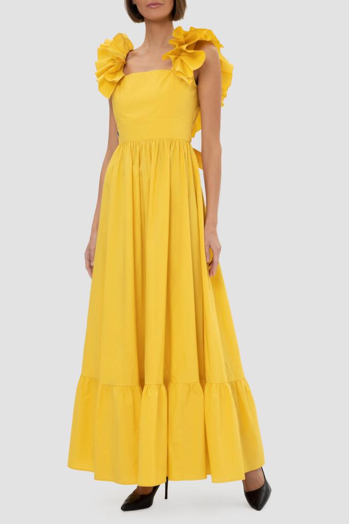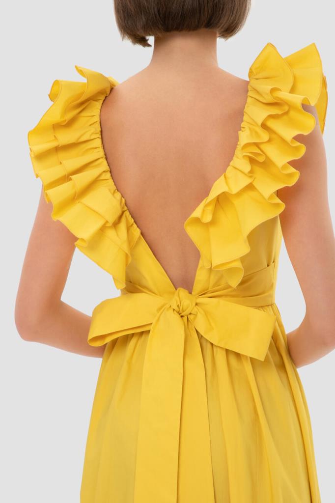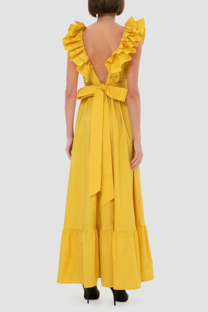 Роскошное женское романтичное дизайнерское платье от бренда Philipp Plein, выполненное из мягкого хлопкового поплина изысканного насыщенного ярко-жёлтого оттенка. Ультрамодная длинная модель эффектного приталенного кроя, без рукавов, на широких пышных бретелях с оборками, с изящным квадратным вырезом горловины, глубоким элегантным V-образным вырезом, также декорированным оборками по бокам, сзади (бретели перекрещиваются в нижней части), удобной застёжкой на потайную молнию сзади и расклешенным плиссированным подолом с воланами. Изделие украшает лаконичная металлическая вставка с монограммой бренда на поясе справа. Линию талии также подчёркивает шикарный пояс на завязках из того же материала в тон (завязывается на крупный бант сзади) (длинная лента для завязывания на спине переходит в большой бант на поясе).