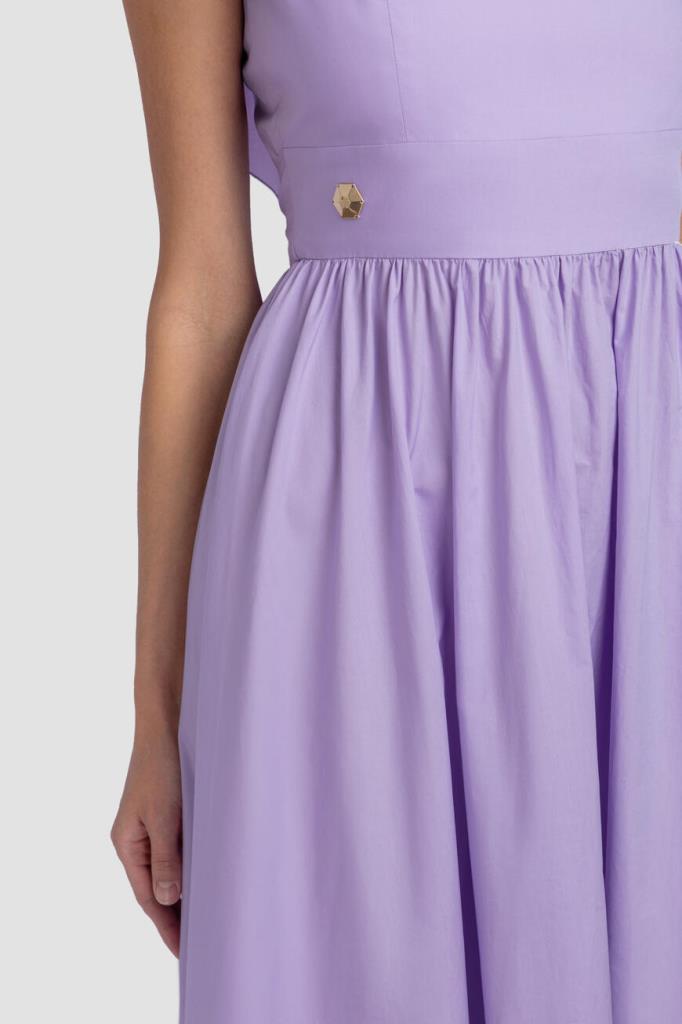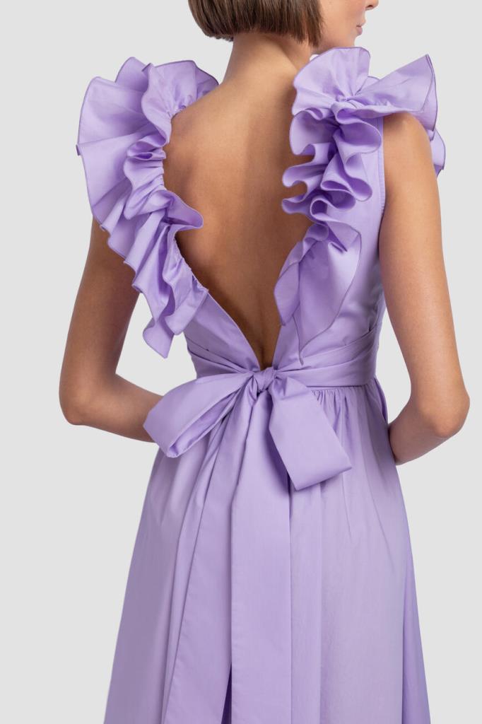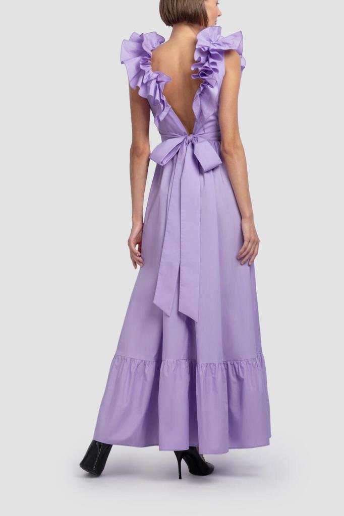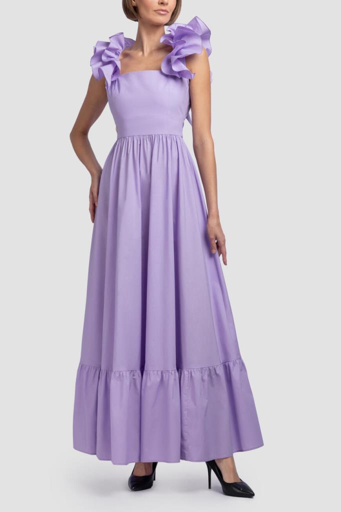 Роскошное женское романтичное дизайнерское платье от бренда Philipp Plein, выполненное из мягкого хлопкового поплина изысканного сиреневого оттенка. Ультрамодная длинная модель эффектного приталенного кроя, без рукавов, на широких пышных бретелях с оборками, с изящным квадратным вырезом горловины, глубоким элегантным V-образным вырезом, также декорированным оборками по бокам, сзади (бретели перекрещиваются в нижней части), удобной застёжкой на потайную молнию сзади и расклешенным плиссированным подолом с воланами. Изделие украшает лаконичная металлическая вставка с монограммой бренда на поясе справа. Линию талии также подчёркивает шикарный пояс на завязках из того же материала в тон (завязывается на крупный бант сзади) (длинная лента для завязывания на спине переходит в большой бант на поясе).