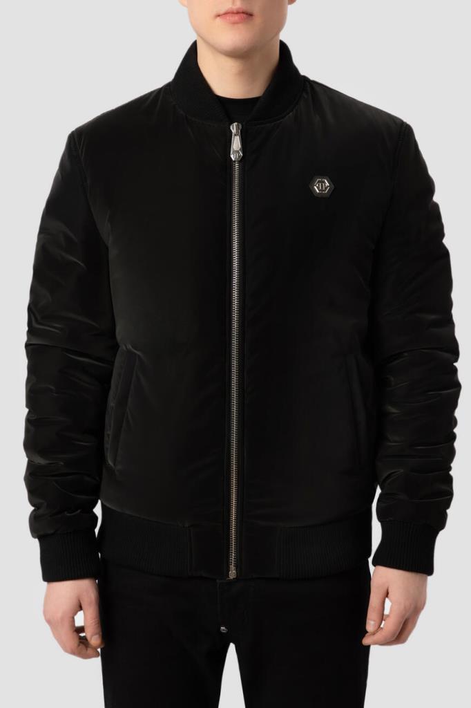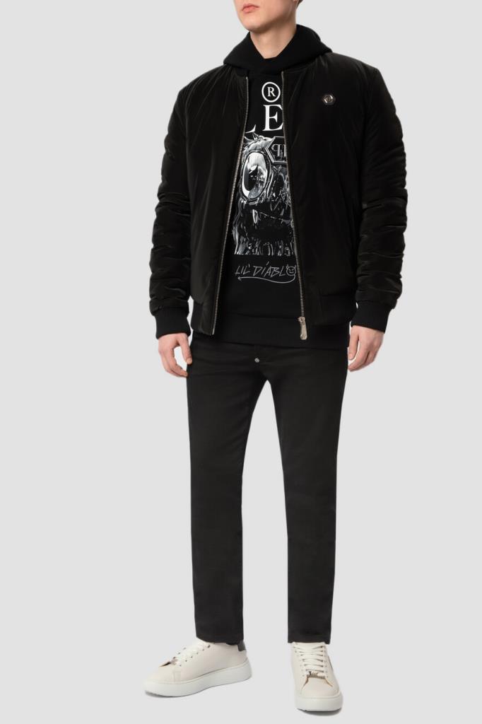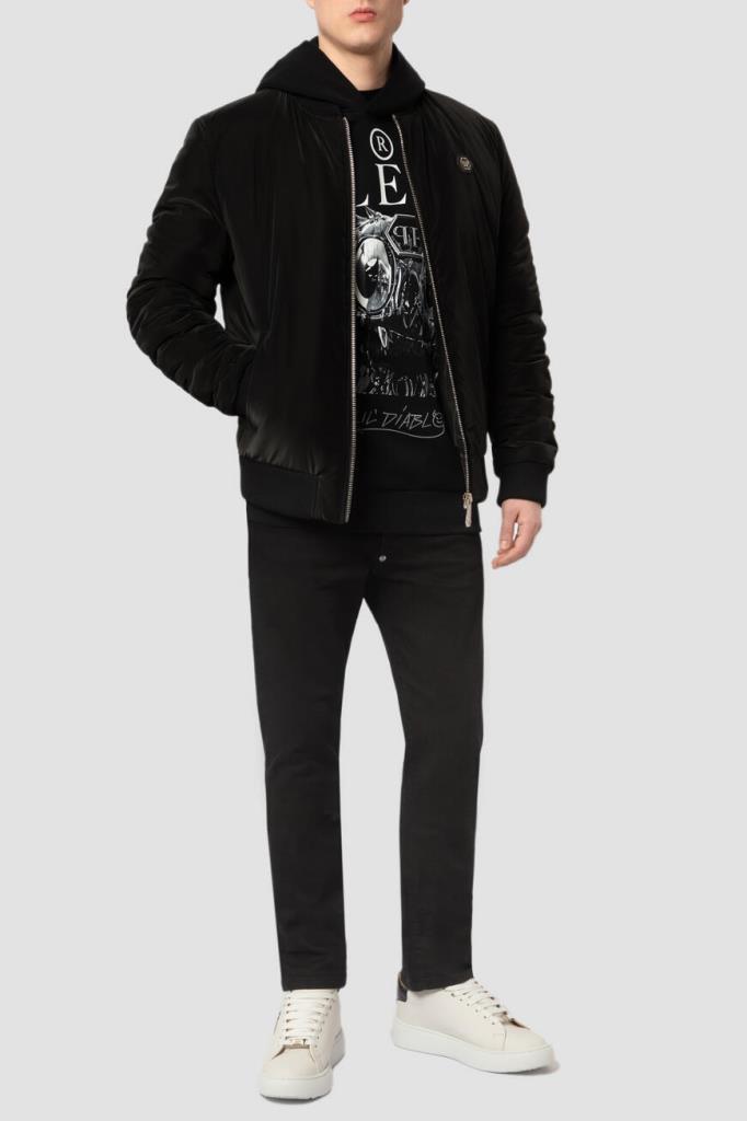 Трикотажный бомбер прямого кроя от бренда Philipp Plein. Модель из прочного блестящего полиэфира чёрного цвета застёгивается на серебристую молнию с брендированным бегунком. Изделие отличается вставкой из сафьяновой кожи PP Hexagon слева на груди и крупным дизайнерским принтом с логотипом бренда и тёмно-серой дизайнерской надписью на спинке. Отличительной особенностью бомбера стала стёганая подкладка из ацетата в тон.