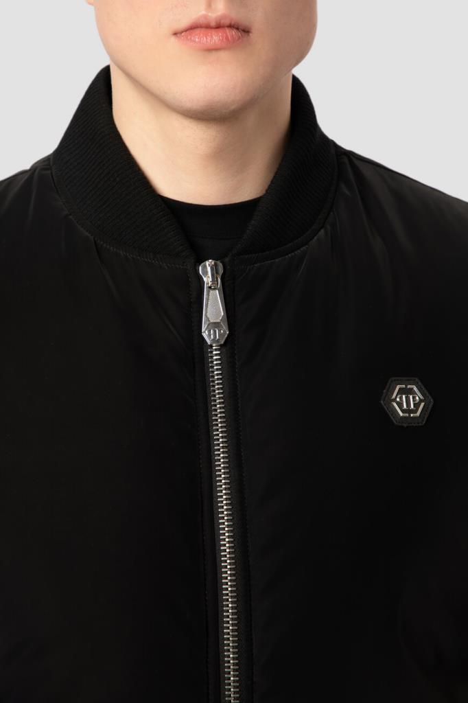 Трикотажный бомбер прямого кроя от бренда Philipp Plein. Модель из прочного блестящего полиэфира чёрного цвета застёгивается на серебристую молнию с брендированным бегунком. Изделие отличается вставкой из сафьяновой кожи PP Hexagon слева на груди и крупным дизайнерским принтом с логотипом бренда и тёмно-серой дизайнерской надписью на спинке. Отличительной особенностью бомбера стала стёганая подкладка из ацетата в тон.