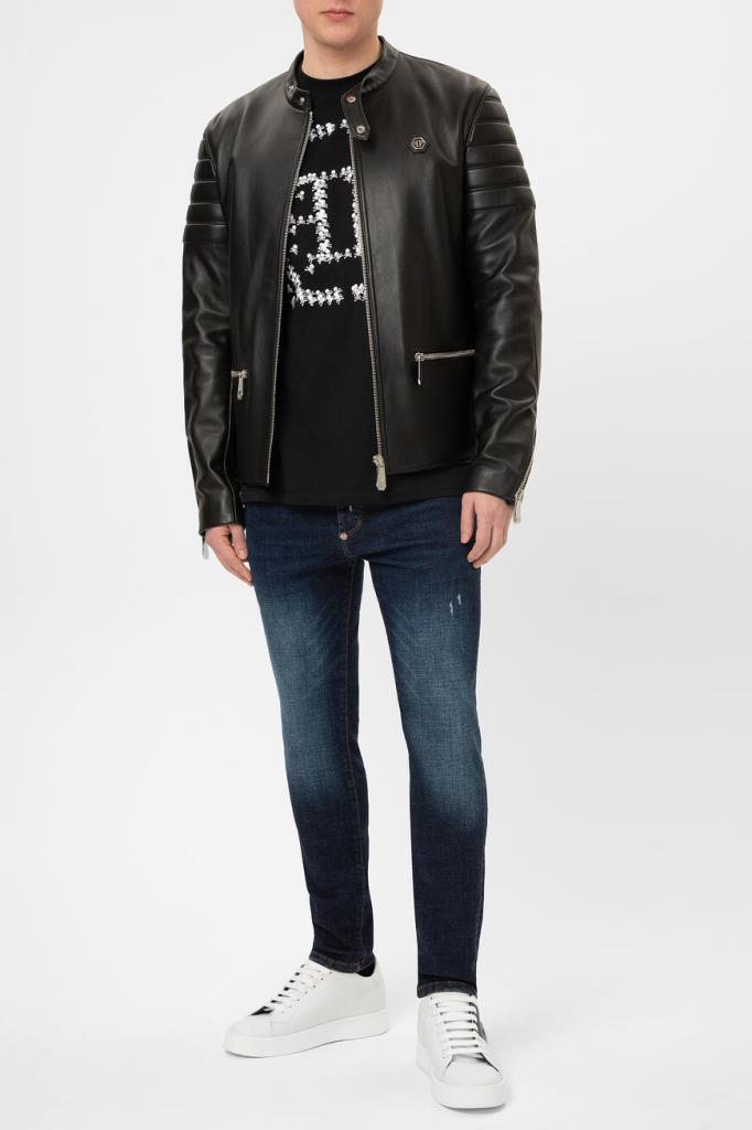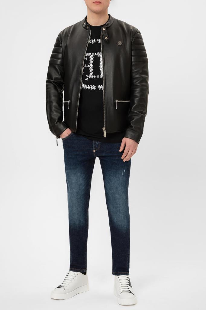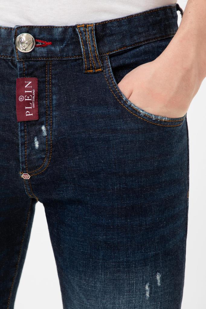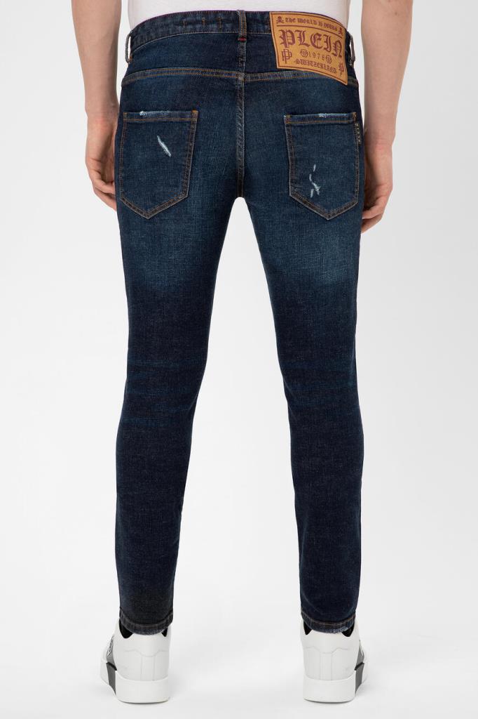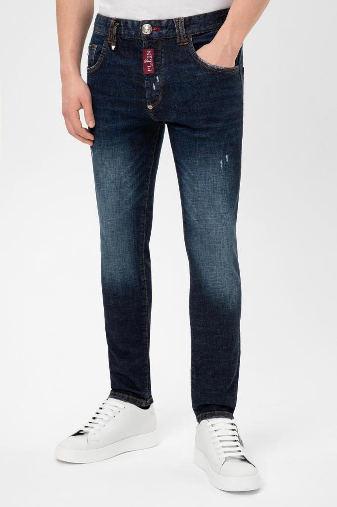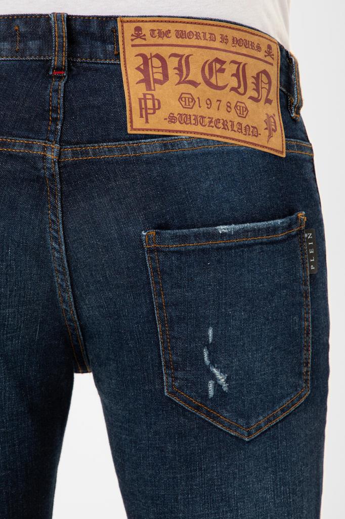Мужские джинсы Philipp Plein из мягкого эластичного хлопкового денима тёмно-синего цвета с эффектными дизайнерскими потёрстостями и разрывами. Оригинальная модель ультраоблегающего кроя, с плотным поясом со шлевками под ремень, удобной застёжкой на фирменные металлические пуговицы с планкой, декорированной бордовой вставкой с фирменным белым логотипом бренда, контрастной оранжевой прострочкой по всей поверхности изделия и традиционными джинсовыми карманами. На поясе сзади красуется контрастная светло-коричневая вставка-нашивка с фирменными бордовыми дизайнерской надписью и символами, а также культовым мотивом с черепом и годом рождения модельера и основателя бренда Филиппа Плейна. Фишки изделия: чёрные вставки с фирменным контрастным белым лого на маленьком кармане спереди и сбоку на правом заднем кармане и ярко-красная прострочка сверху и снизу на изнаночной стороне пояса. Джинсы также дополнены белой подкладкой из мягкого трикотажа на основе хлопка и прочного синтетического износостойкого материала.
