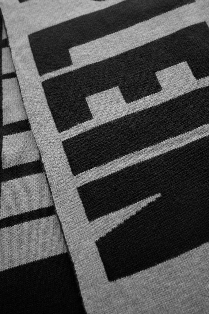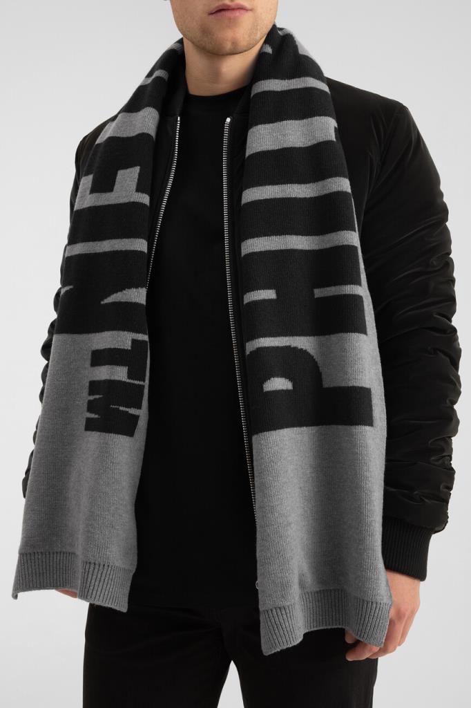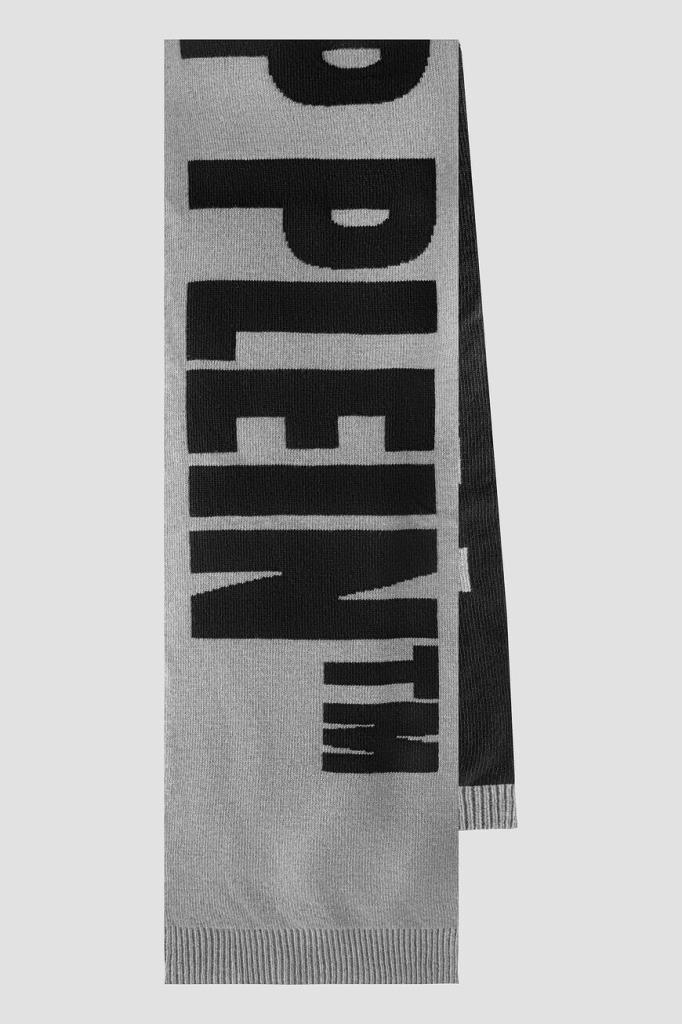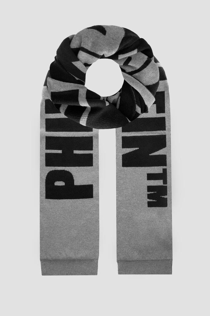 Шерстяной шарф чулочной вязки от бренда Philipp Plein. Модель окрашена в серый оттенок и отличается крупным жаккардовым логотипом. Изделие можно носить с шапкой бини из той же коллекции.