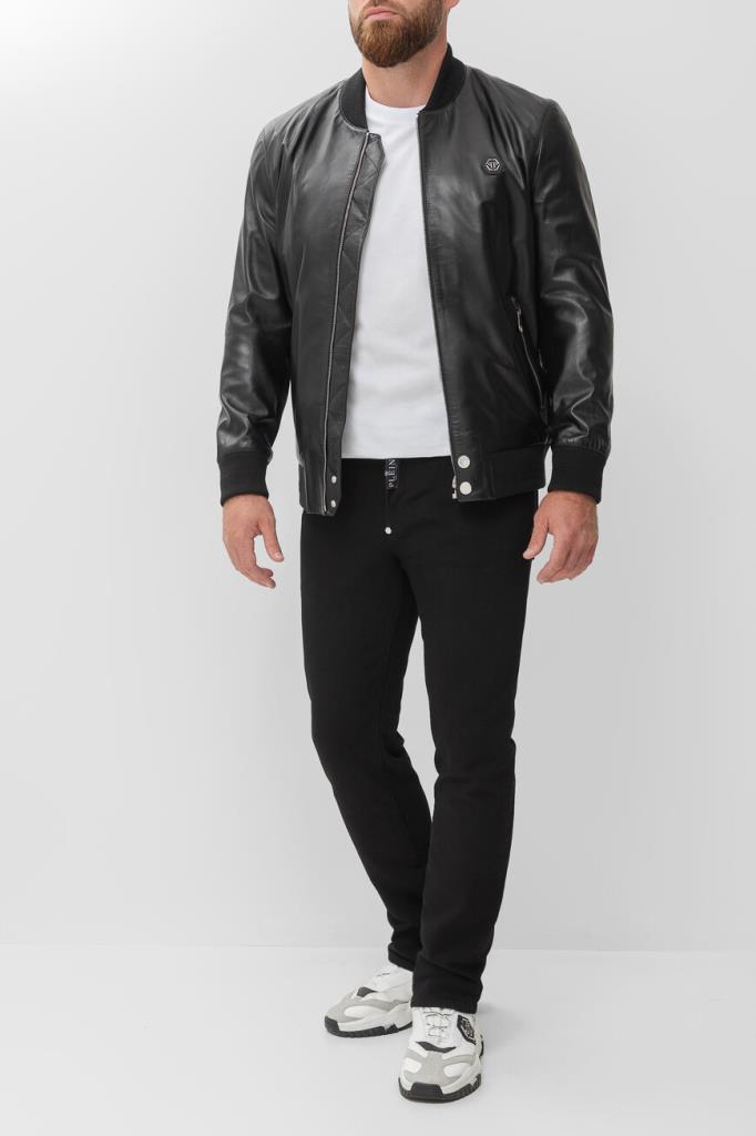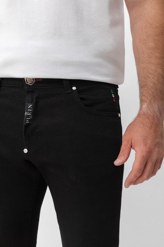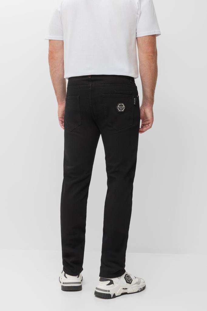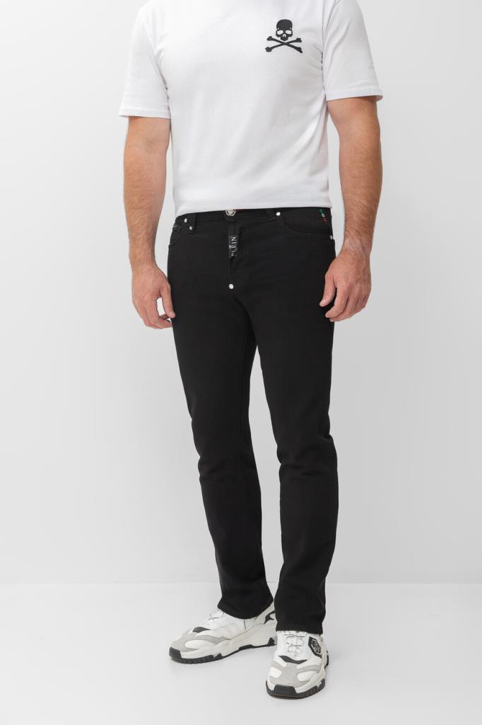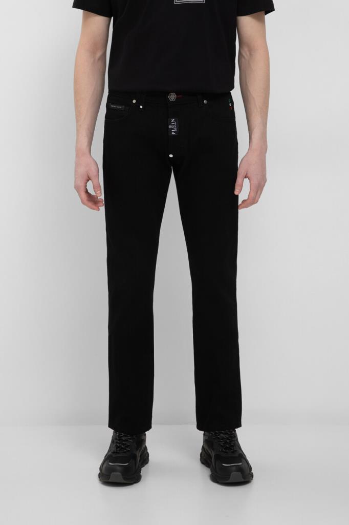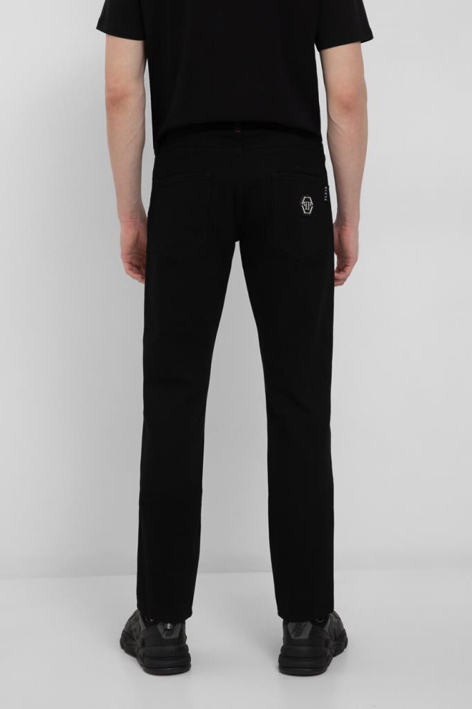 Прямые джинсы Philipp Plein – это воплощение современной роскоши. Изделие сшито из эластичного хлопкового денима чёрного цвета и оснащено шестью карманами. Атрибутами бренда являются вставка с контрастным логотипом на планке застёжки, вставки с белыми лого Дома на маленьком кармане спереди и заднем кармане и нашивка из сафьяновой кожи PP Hexagon с металлической монограммой-шестигранником сзади.