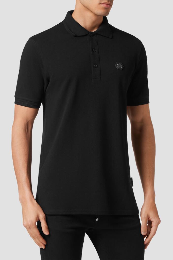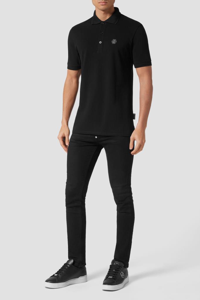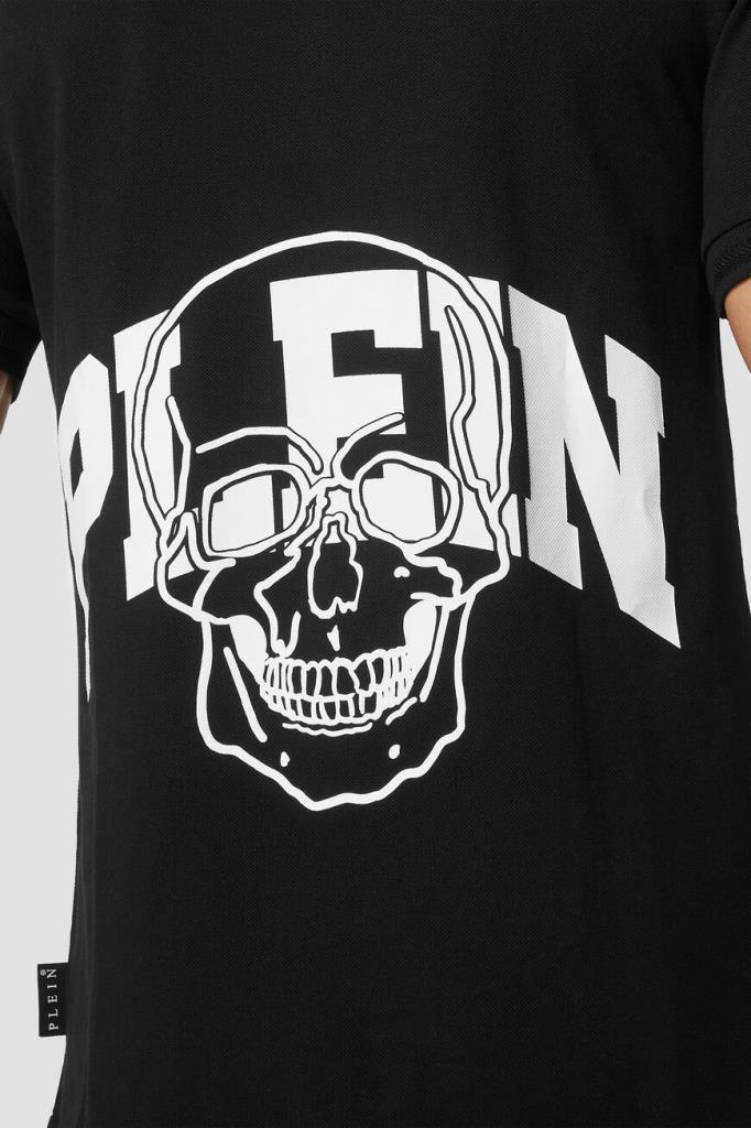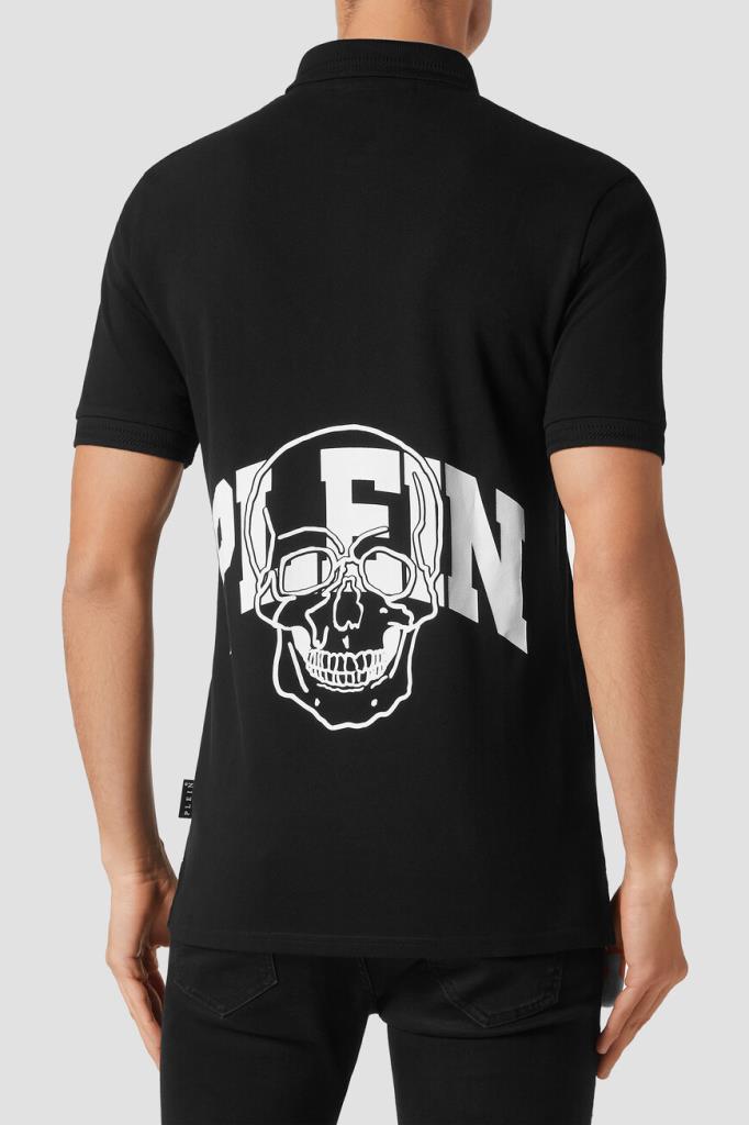 Чёрное поло TATTOO прилегающего кроя от бренда Philipp Plein. Изделие выполнено из фактурного хлопкового трикотажа и декорировано крупным контрастным принтом в виде культового черепа и надписи «Plein» на спинке. О принадлежности модели бренду напоминают нашивка из сафьяновой кожи PP Hexagon слева на груди и брендированная вставка сбоку слева.