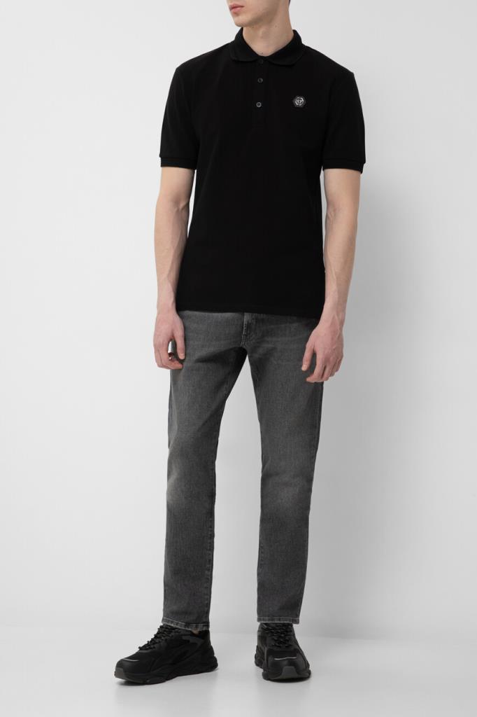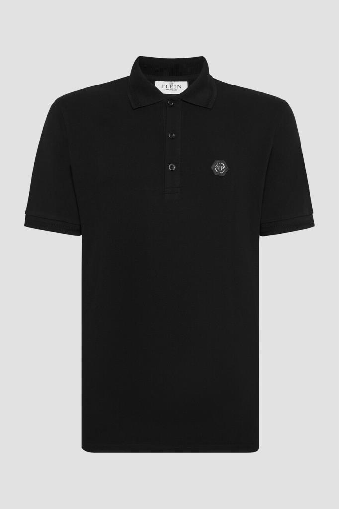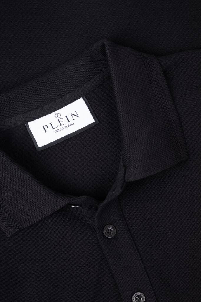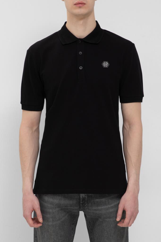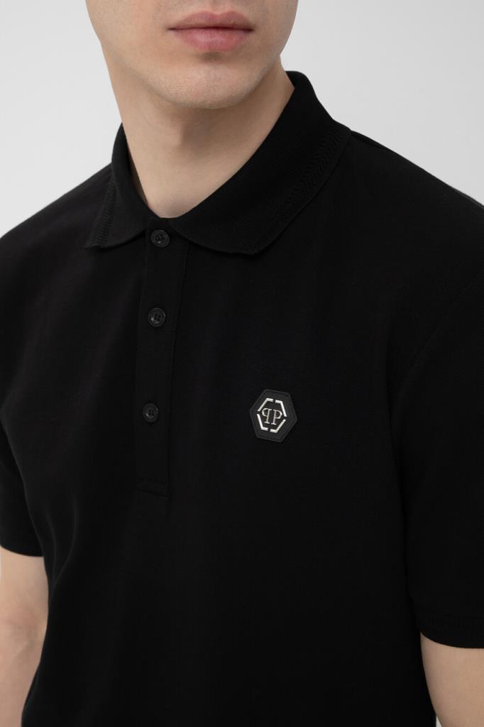 Чёрное поло TATTOO прилегающего кроя от бренда Philipp Plein. Изделие выполнено из фактурного хлопкового трикотажа и декорировано крупным контрастным принтом в виде культового черепа и надписи «Plein» на спинке. О принадлежности модели бренду напоминают нашивка из сафьяновой кожи PP Hexagon слева на груди и брендированная вставка сбоку слева.