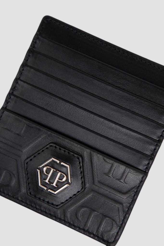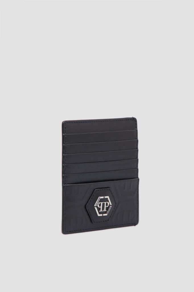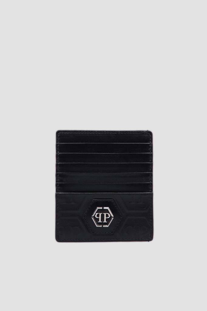 Кожаный кардхолдер PHILIPP PLEIN с шестью слотами для кредитных карт. Изделие выполнено в чёрном цвете и дополнено вставкой с рельефным геометрическим мотивом в виде повторяющегося культового символа - шестигранника PP Hexagon спереди снизу. Принадлежность практичного аксессуара бренду также обозначена кожаной нашивкой с серебристой металлической монограммой в центре.